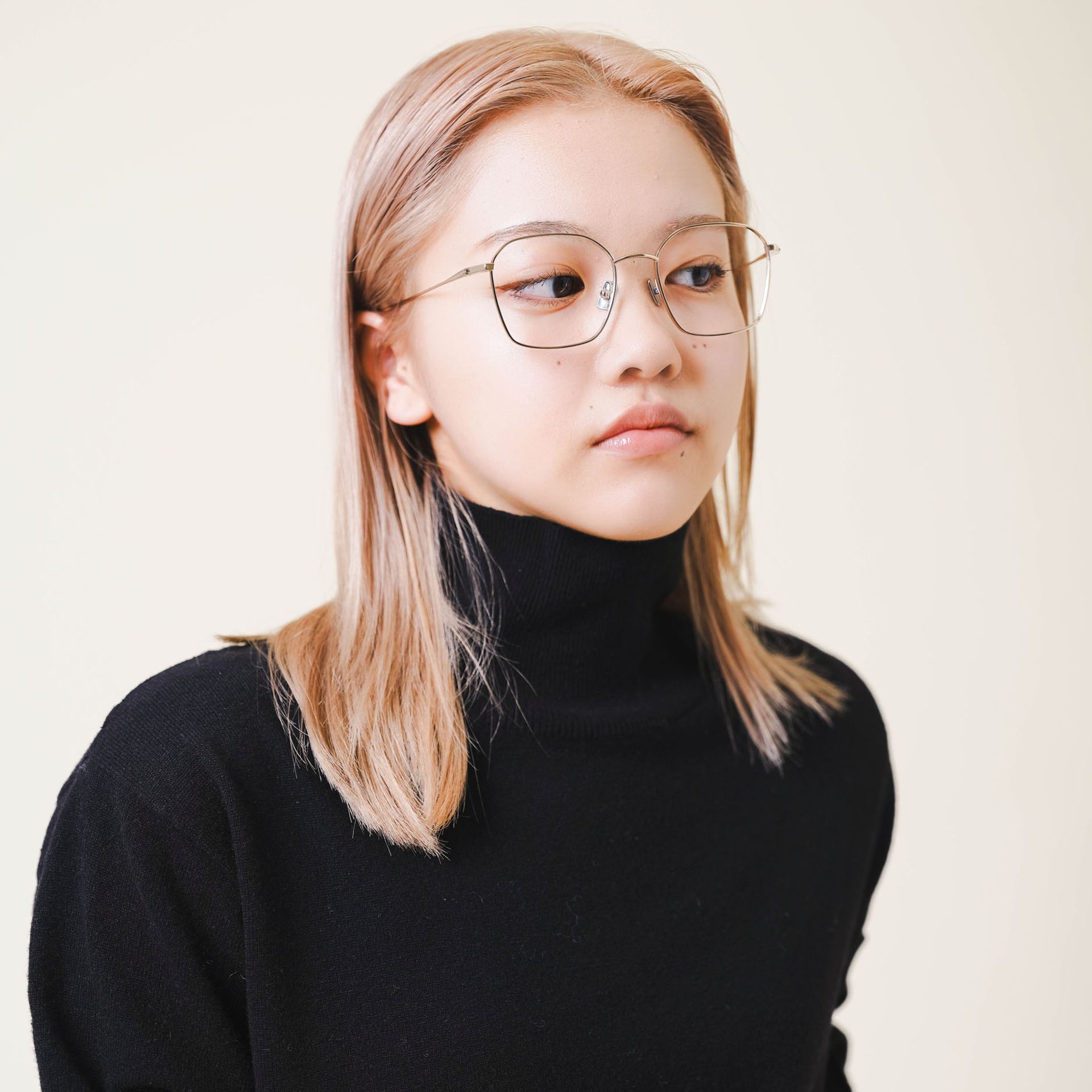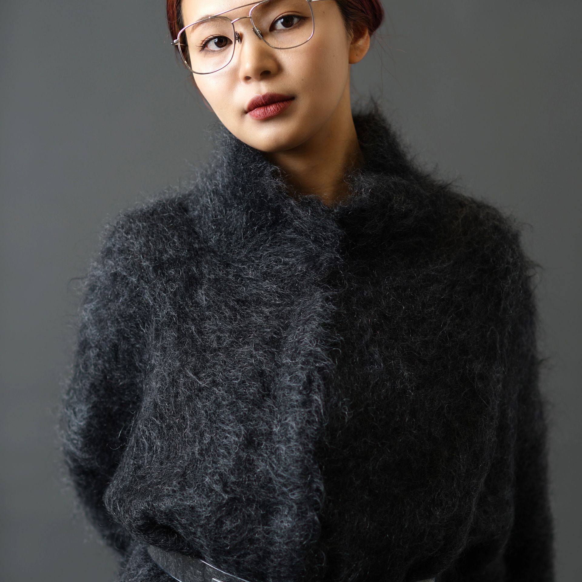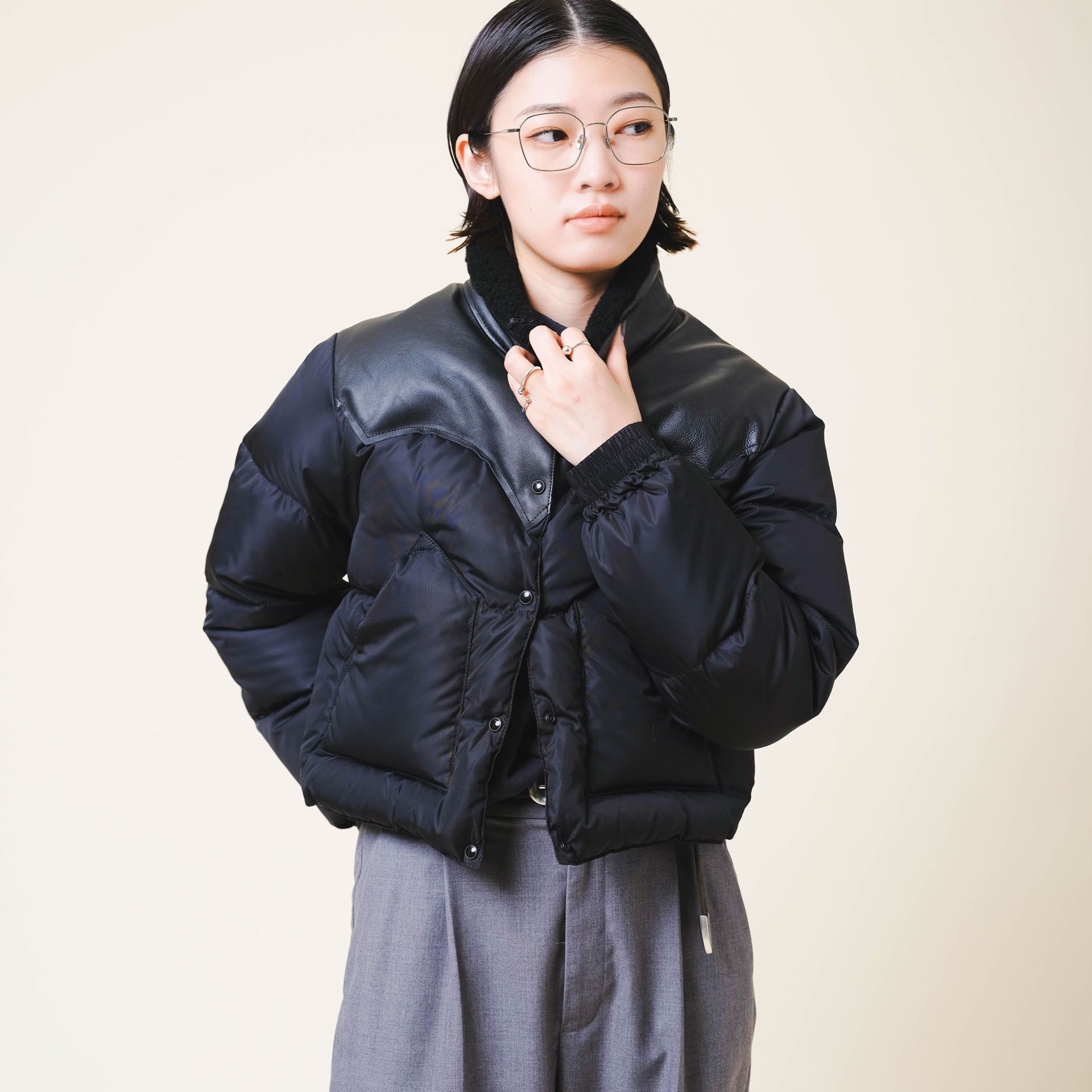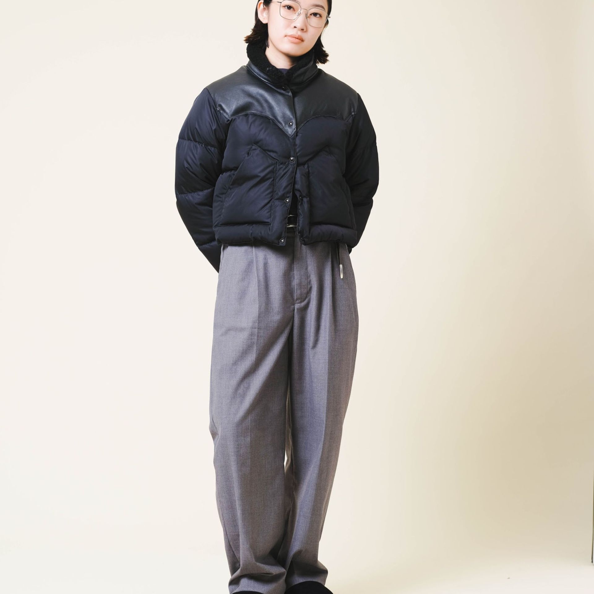 ボリュームのあるアウターに、華奢なラインのフレームは顔周りを軽く見せてくれます。
