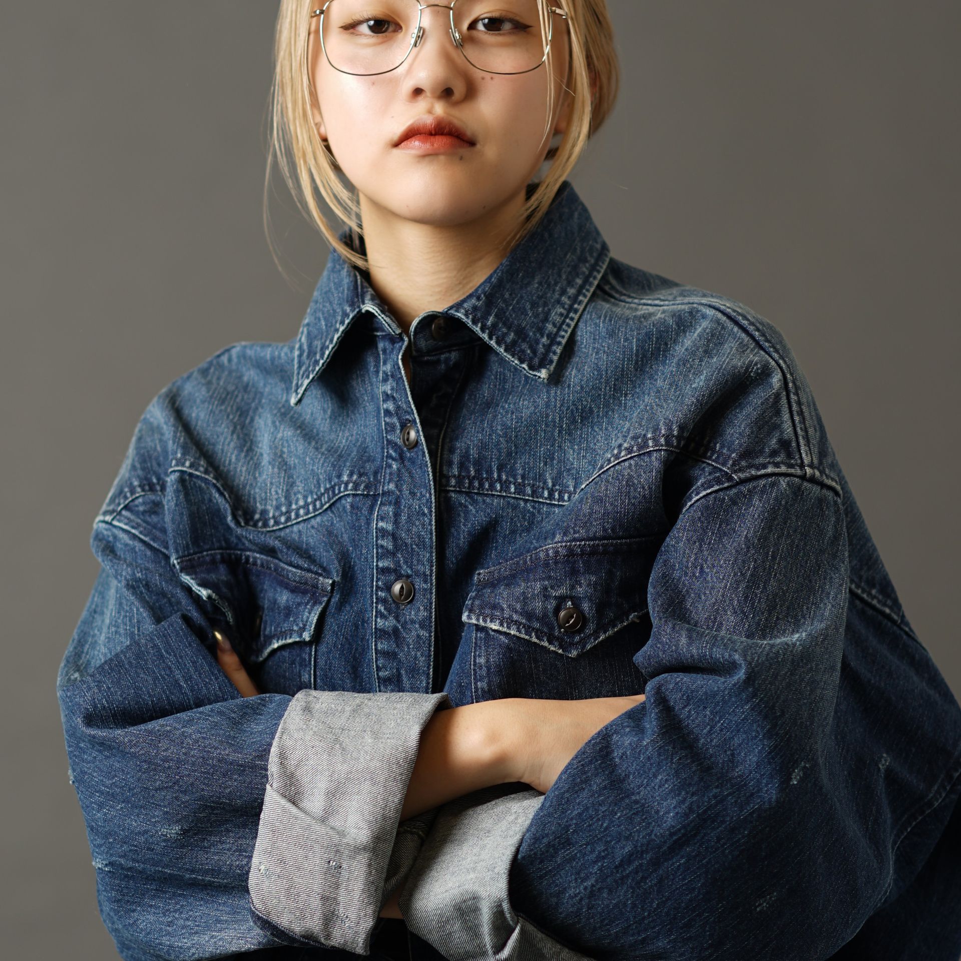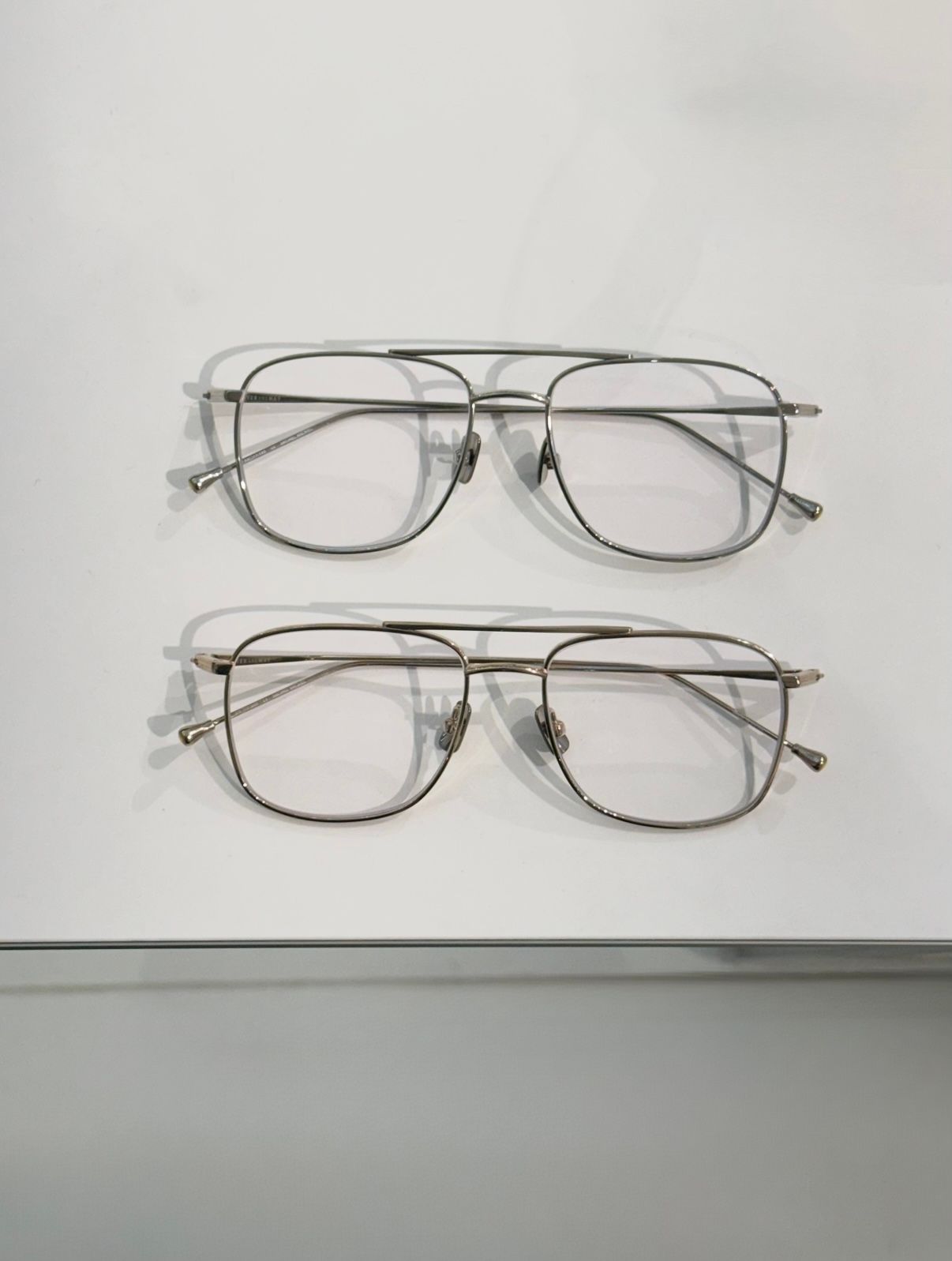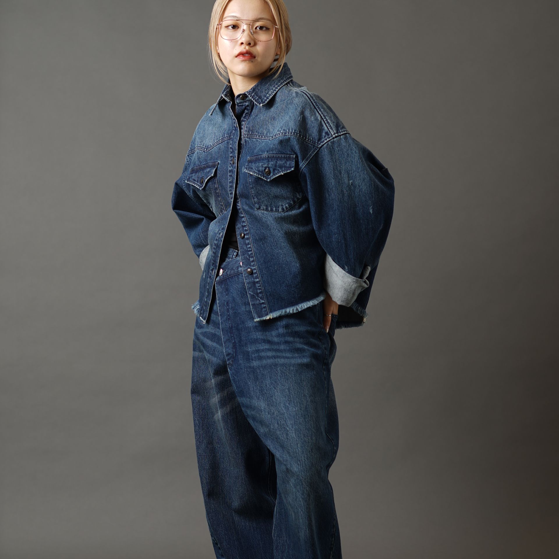 華奢なラインのツーブリッジフレームは、デニムセットアップもカジュアルダウンさせてくれます。