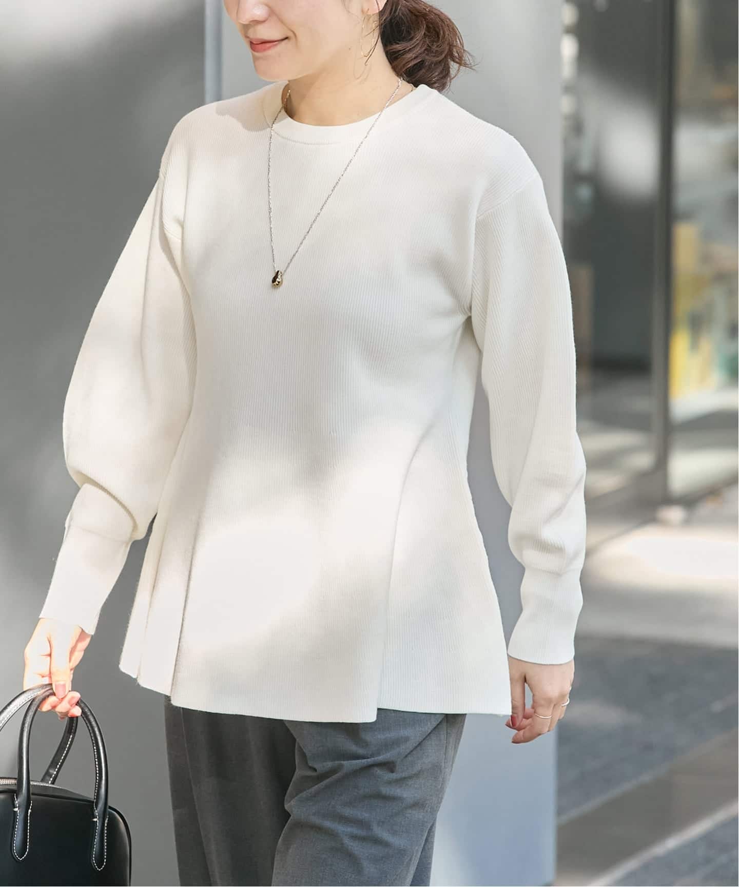 計算された立体的な編み地が、女性らしいメリハリのあるラインを描くペプラムニット。