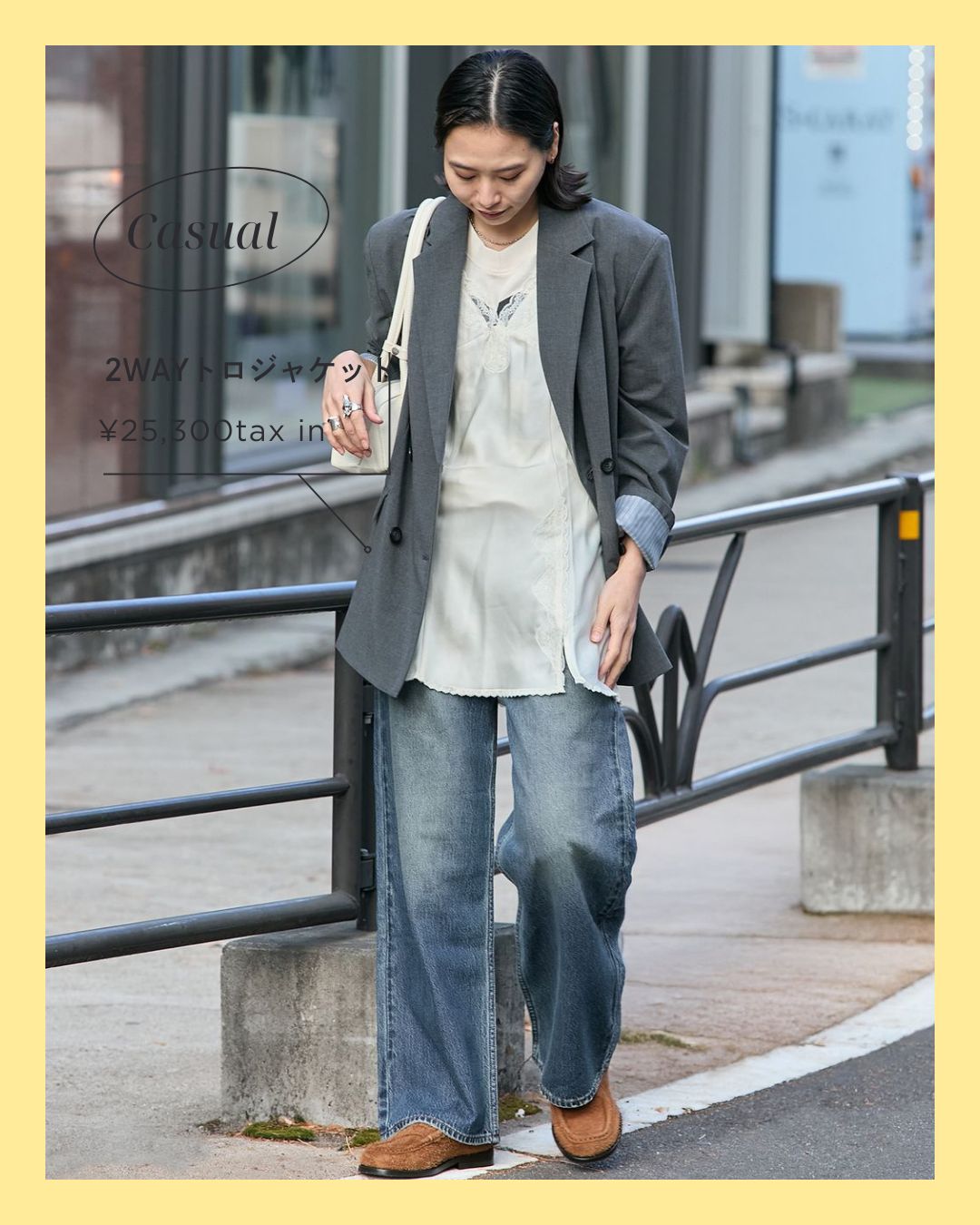 デニム合わせのカジュアルスタイルも雰囲気ががらっと変わっておすすめです。