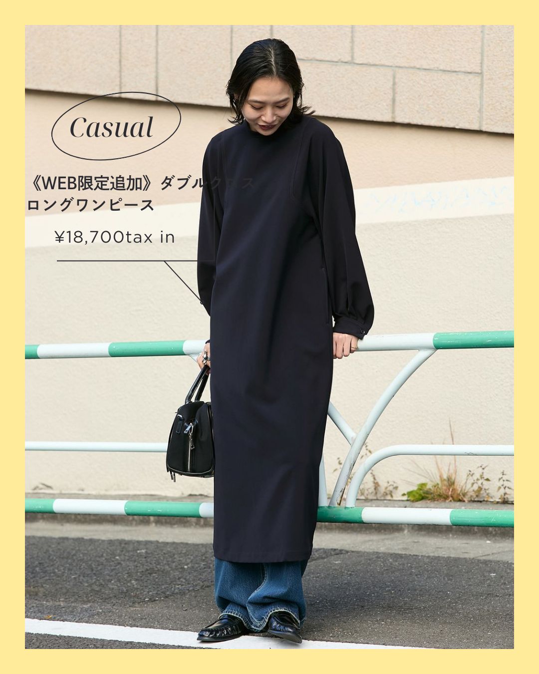シンプルでありながら、きちんと感のあるダブルクロス素材を使用したロングワンピース。