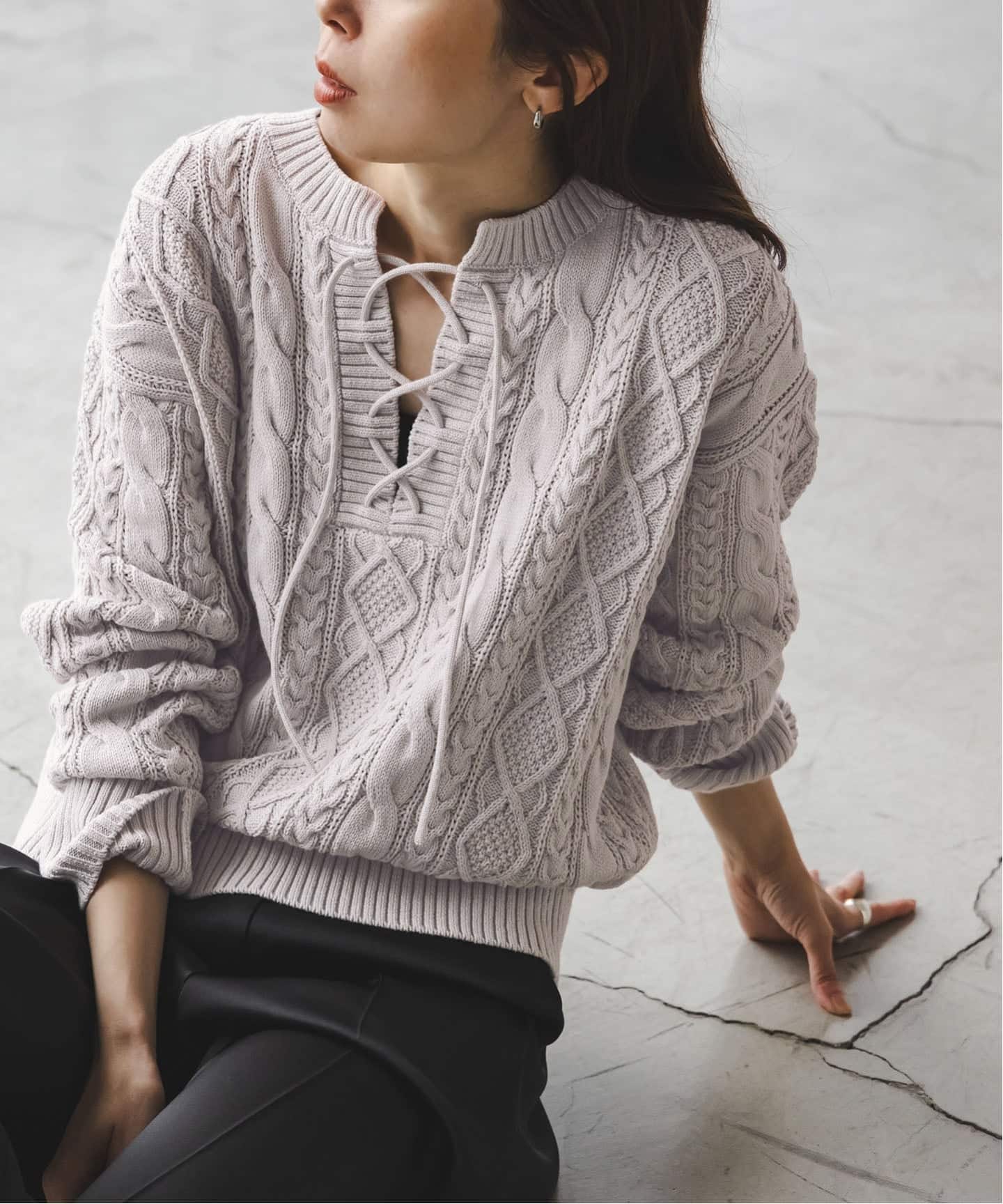 広めに開いたVネックにレースアップを合わせ、抜け感漂うこなれたルックスに。