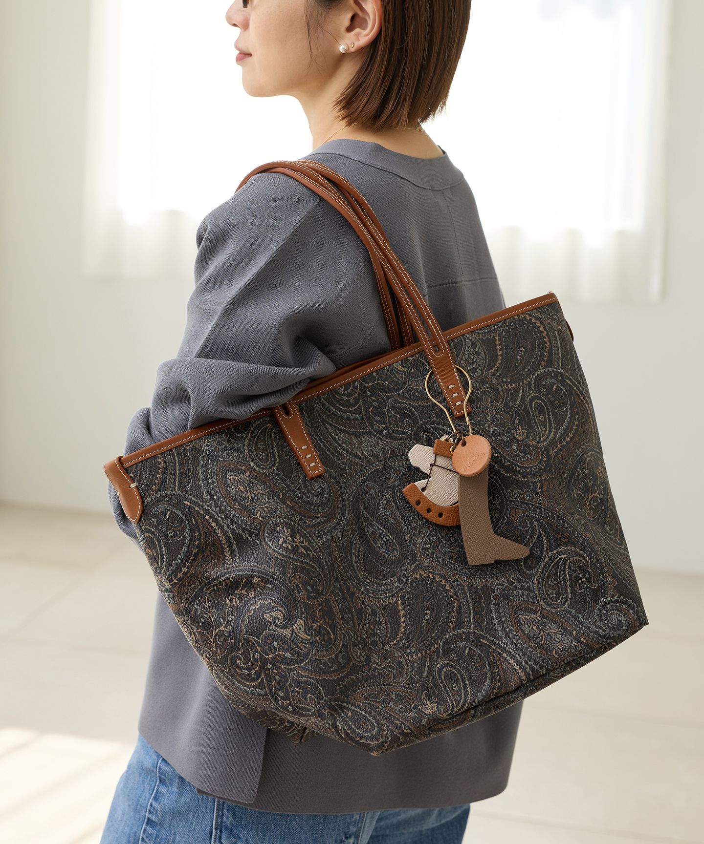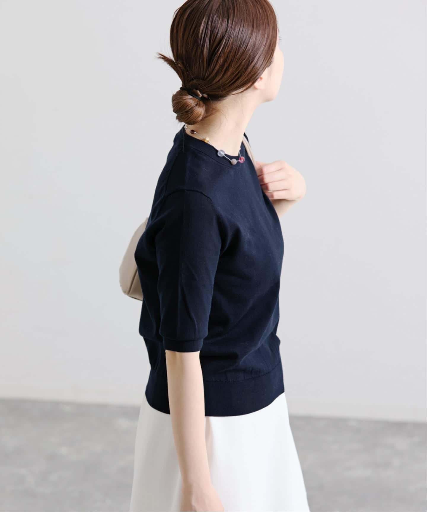 IENAオリジナルのロゴ入りゴールドチャームが上品なアクセントとなり、シンプルコーデもぐっと洗練された印象に。