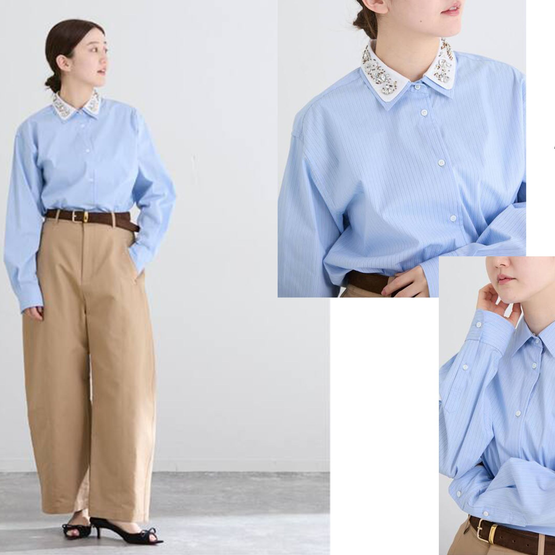 取り外し可能なビジュー襟が、シンプルなシャツを一枚で主役級に引き立ててくれます。