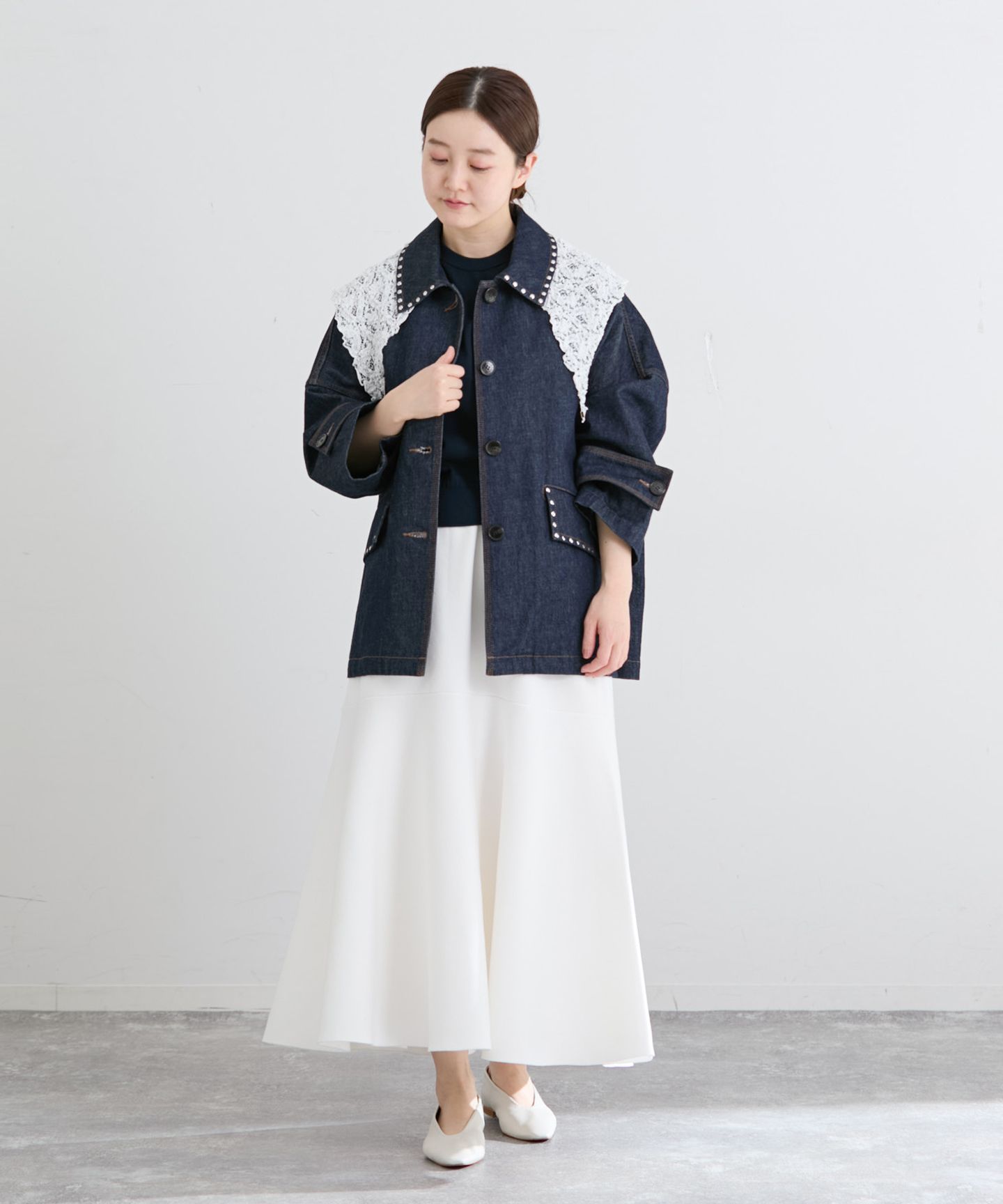 衿やフラップに施したスタッズが、コーデを引き締めるエッジの効いたアクセントに。