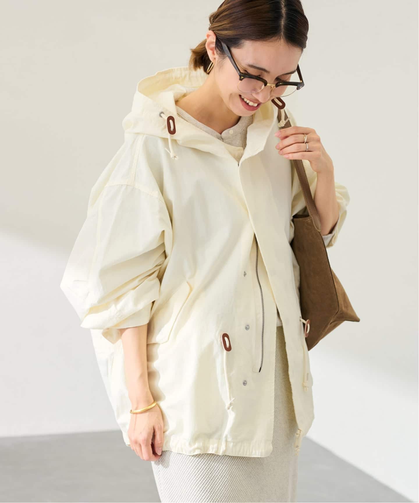 女性らしく着こなしやすいニュアンスカラーで、トーンを合わせたスタイリングもおすすめ。