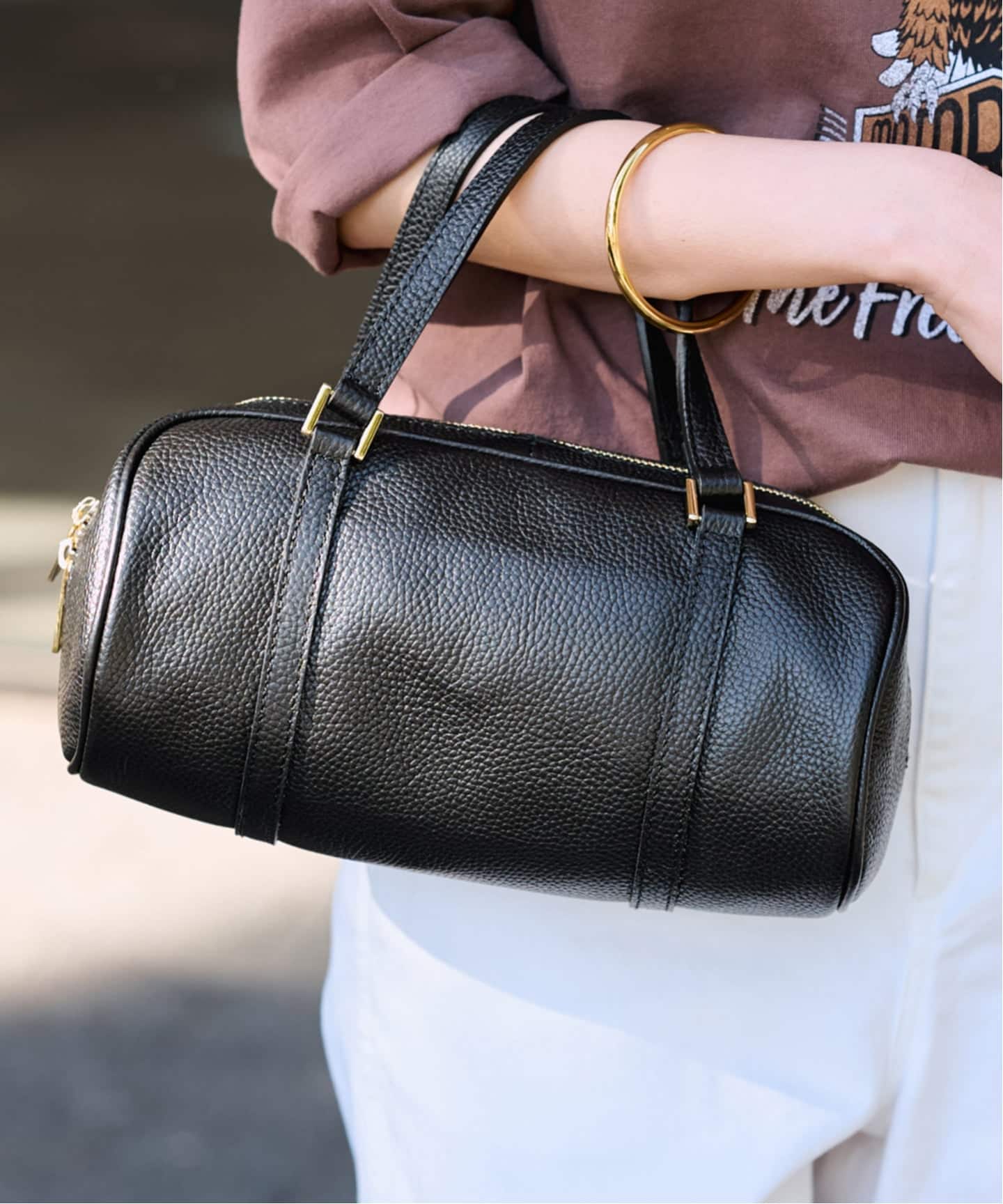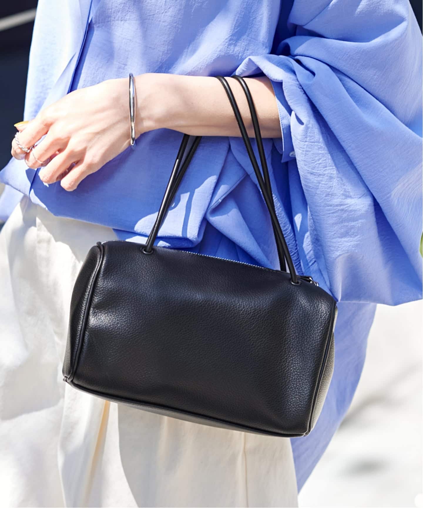 円筒形で、ころんとしたフォルムがコーデのアクセントになるバッグ。