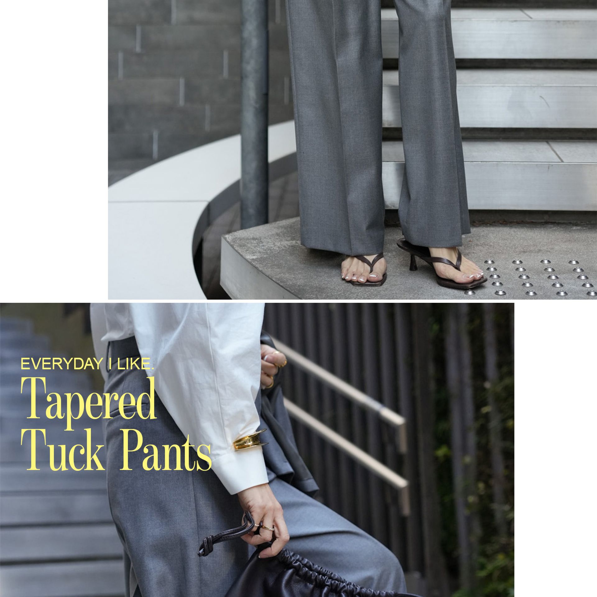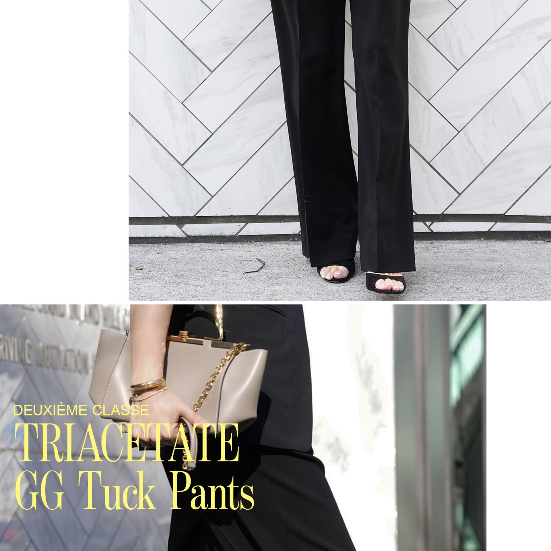 素材を合わせた新作のタックパンツもセットで抑えておきたいところ。