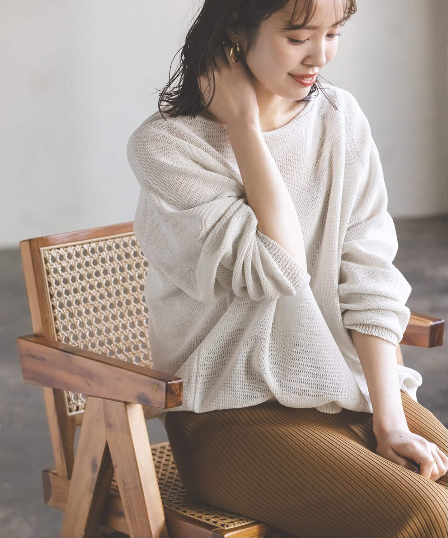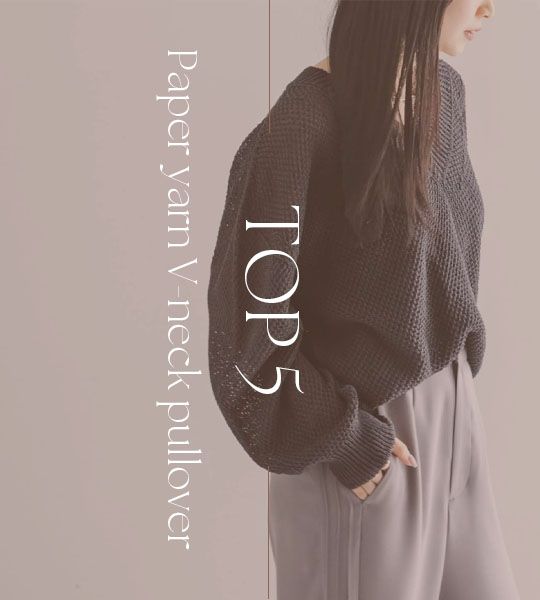 大好評のペーパーヤーンニットは、デコルテを綺麗に見せるVネックになってさらに注目度UP!