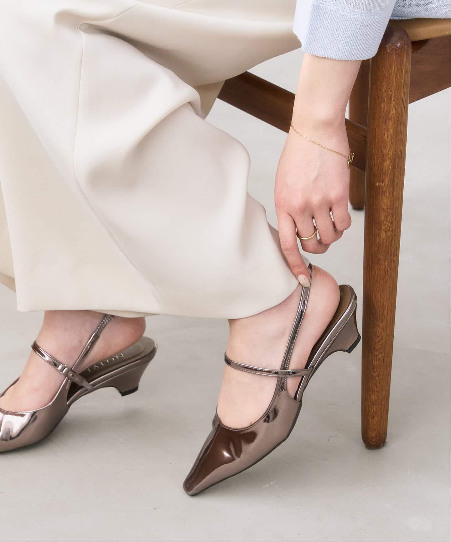 華奢なリボンのデザインやポインテッドで大人見えな印象に。