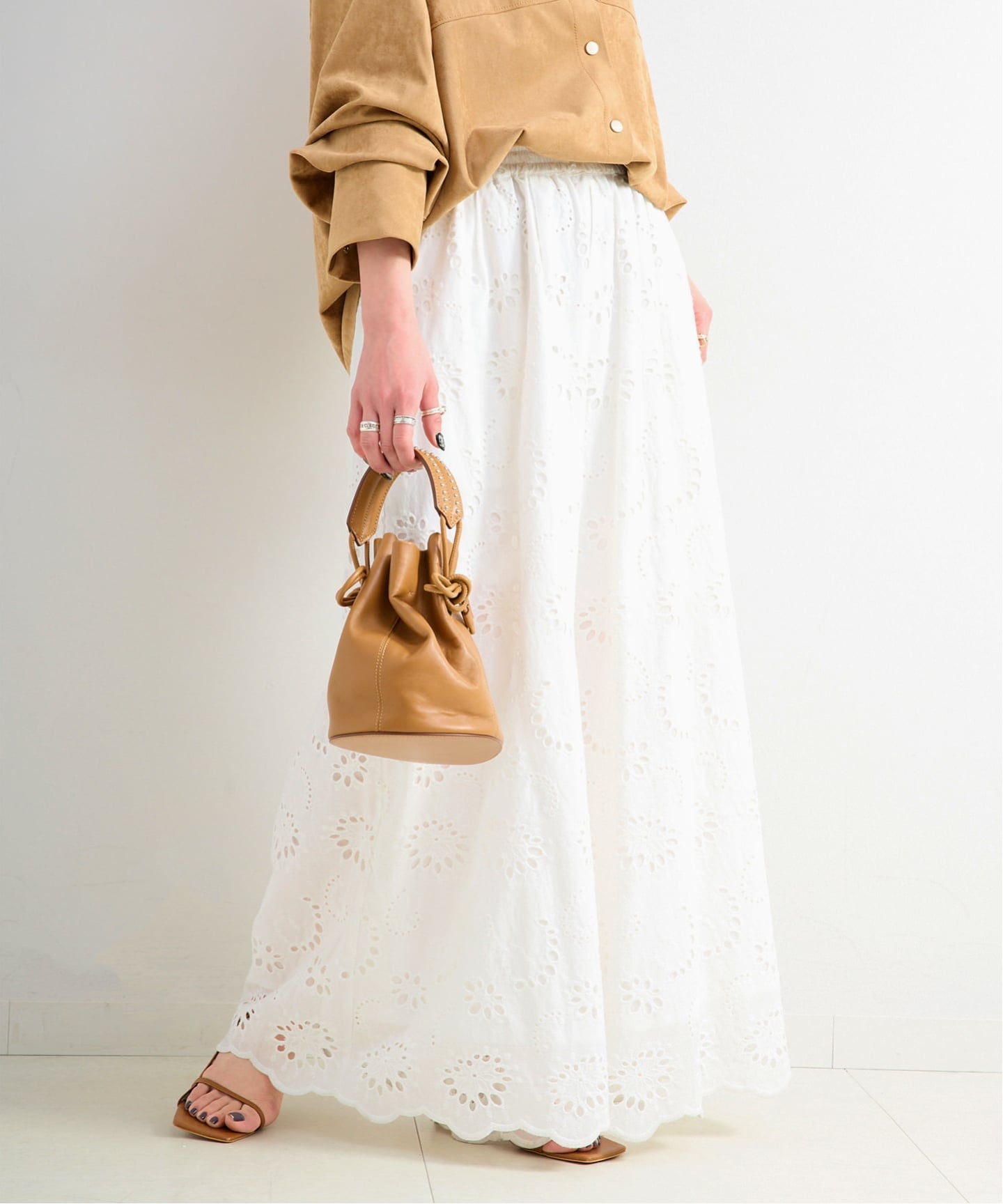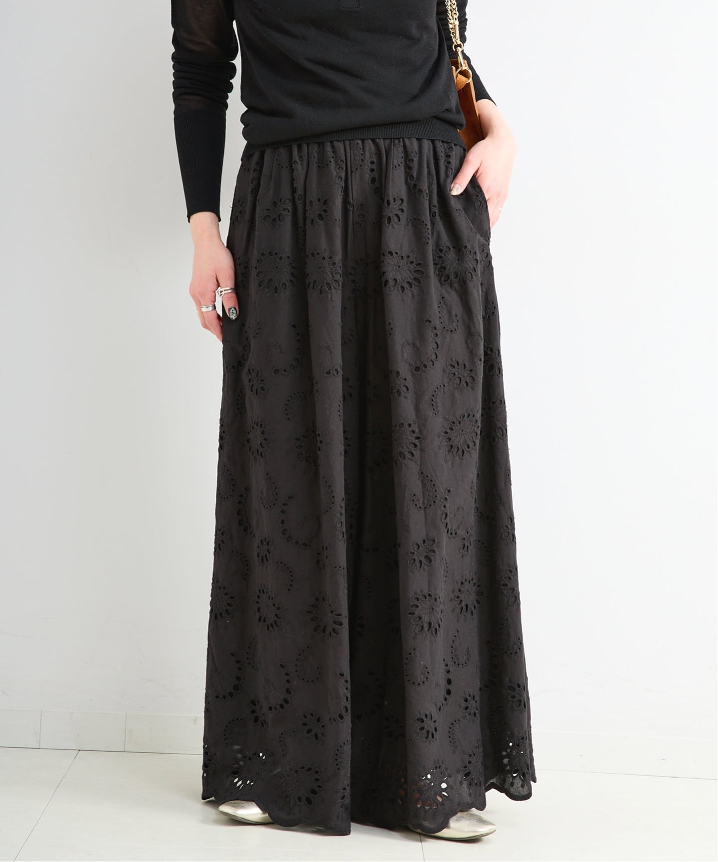 アイレット刺繍を施した、スカート見えのレースワイドパンツ。