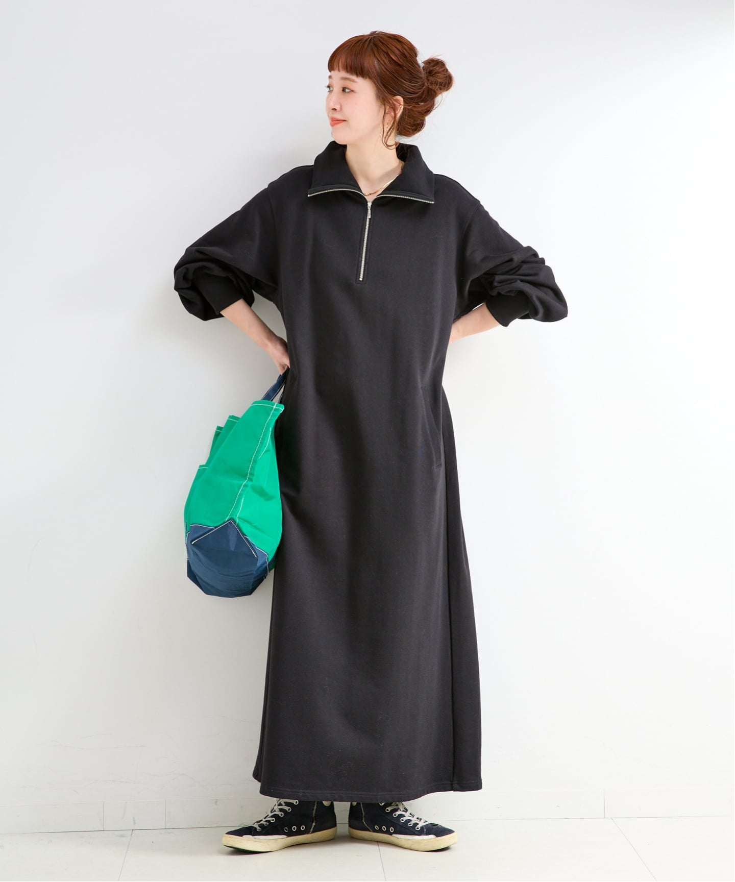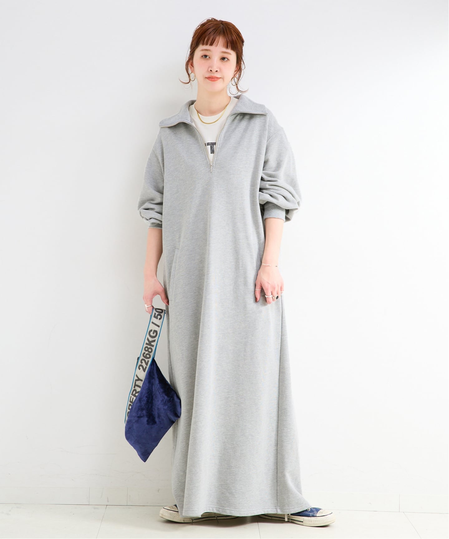 トラッドなハーフZIPデザインがポイントのマキシ丈スウェットワンピース。