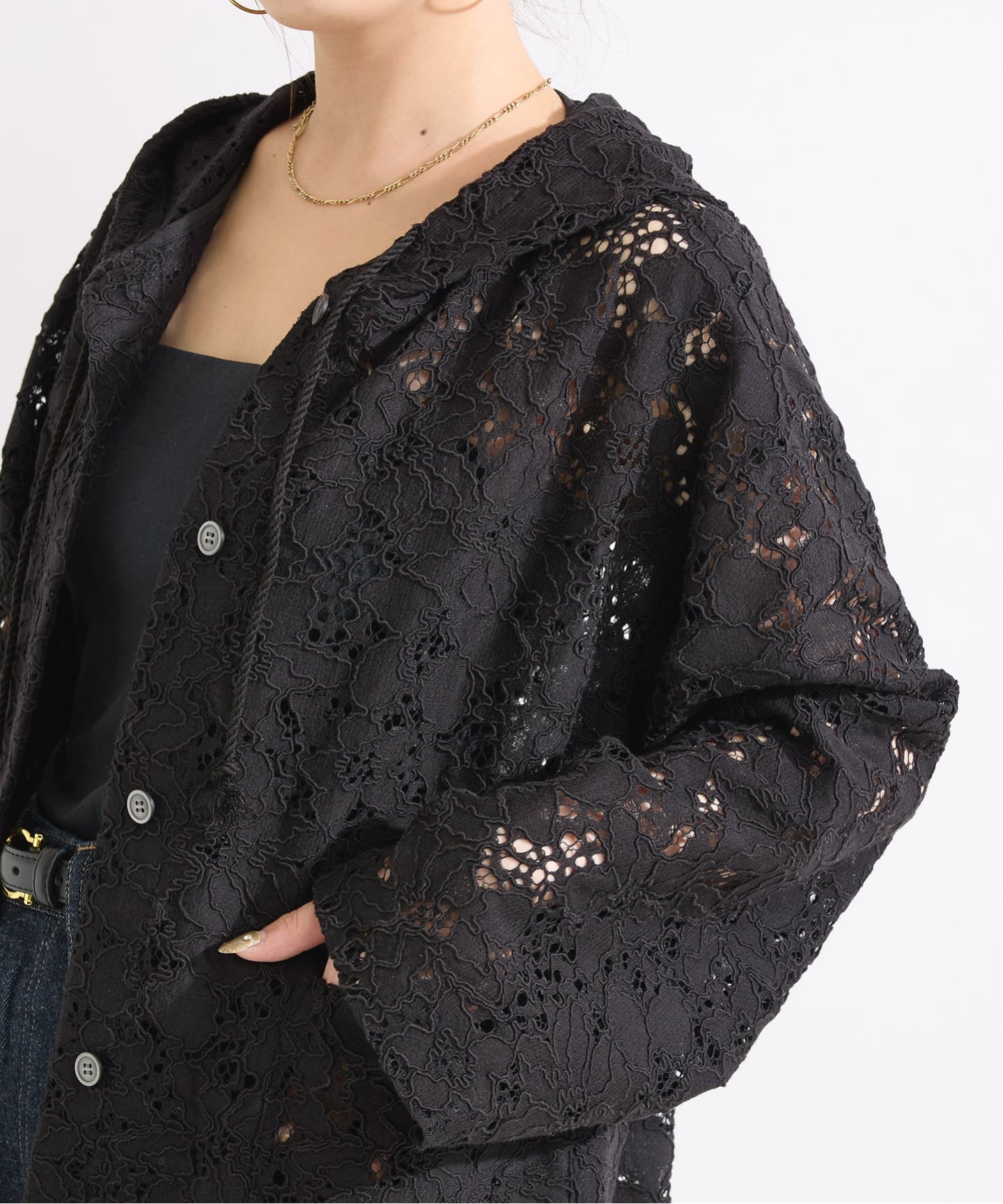 コード刺繍を施した表情豊かなレースフードシャツ。
