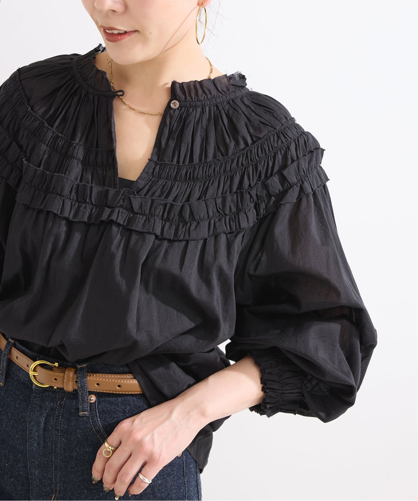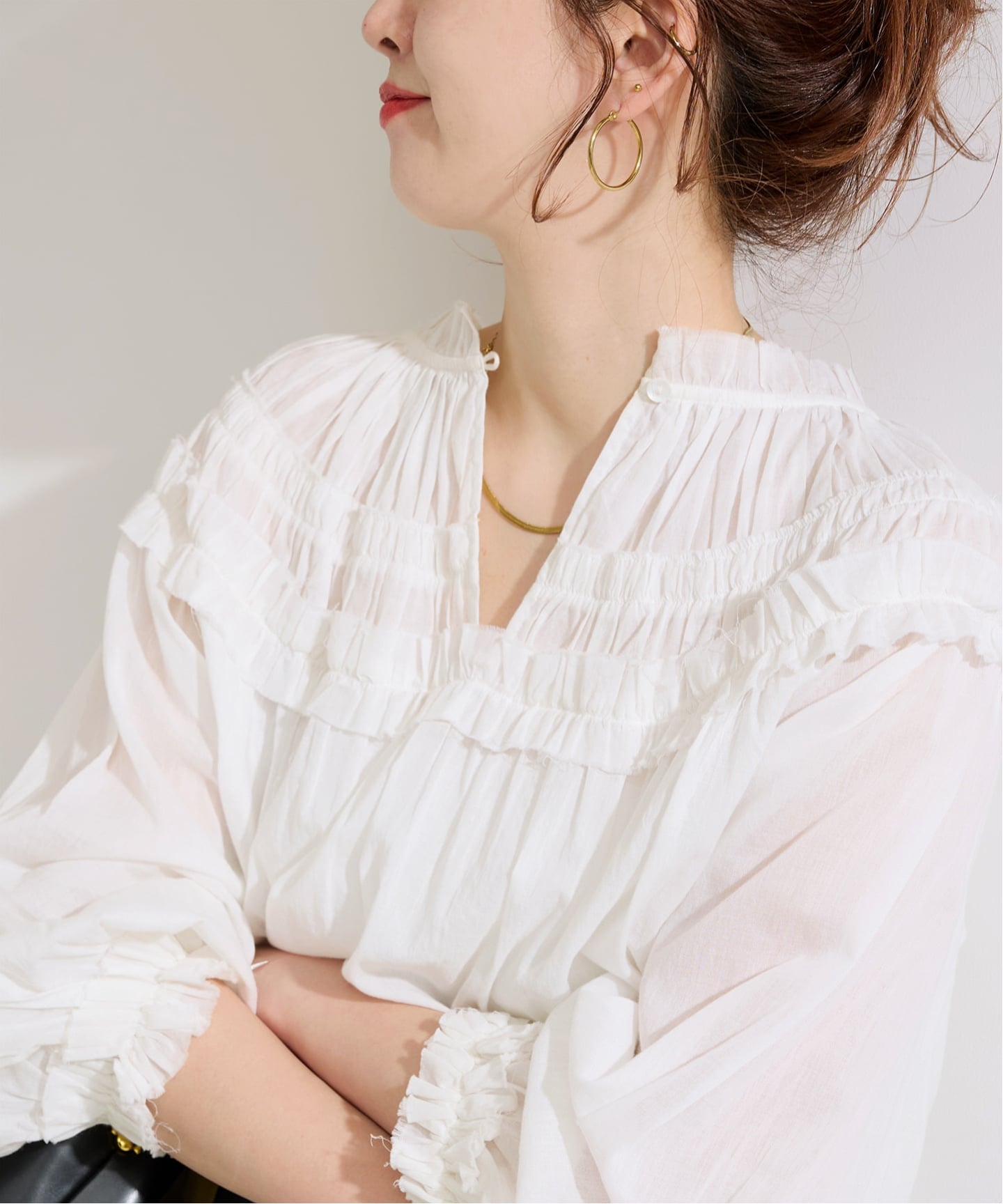 シアーなコットンボイルを使用したフェミニンな大人ブラウスで、華やかな顔周りのフリルが着映えするディテールに。
