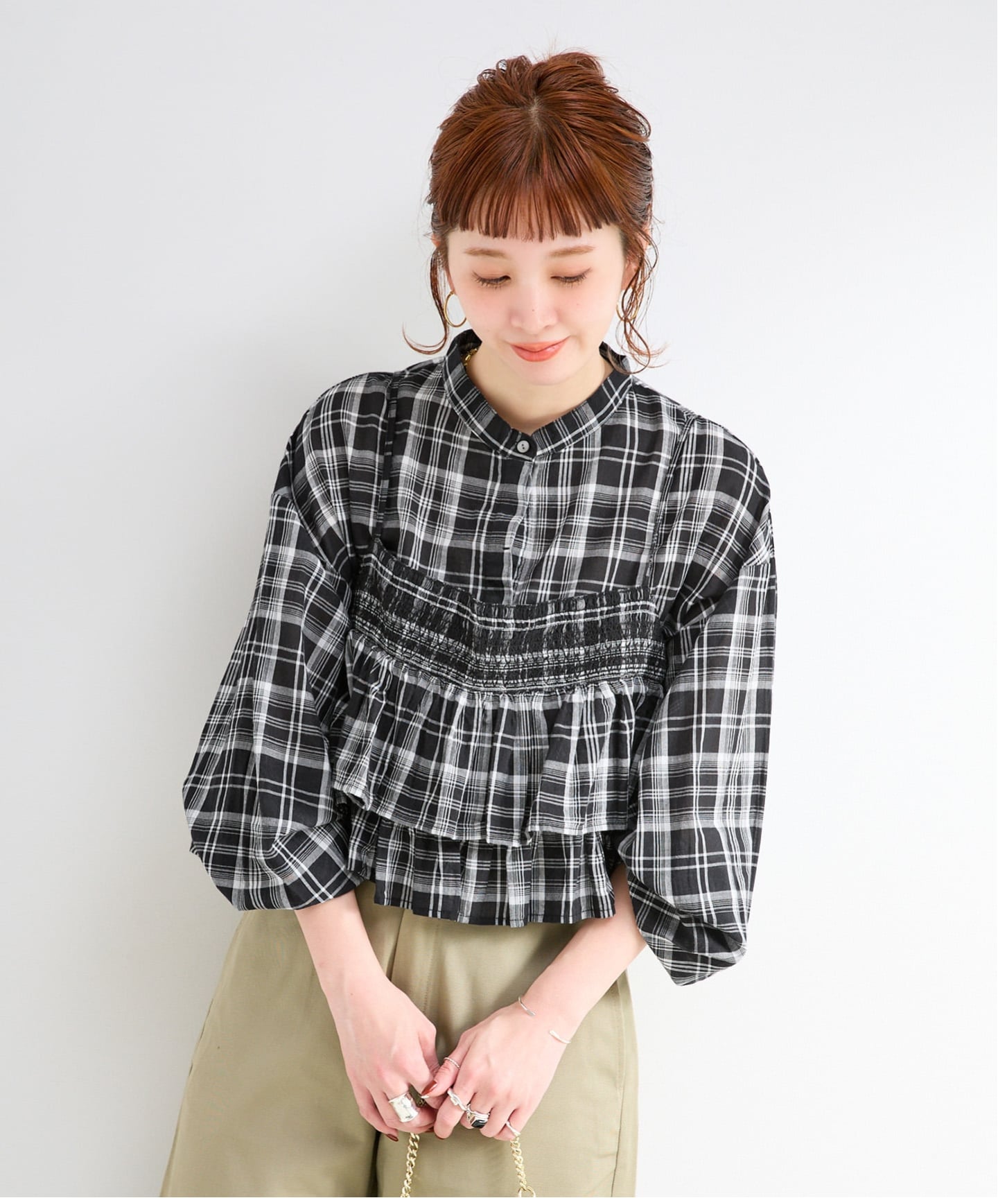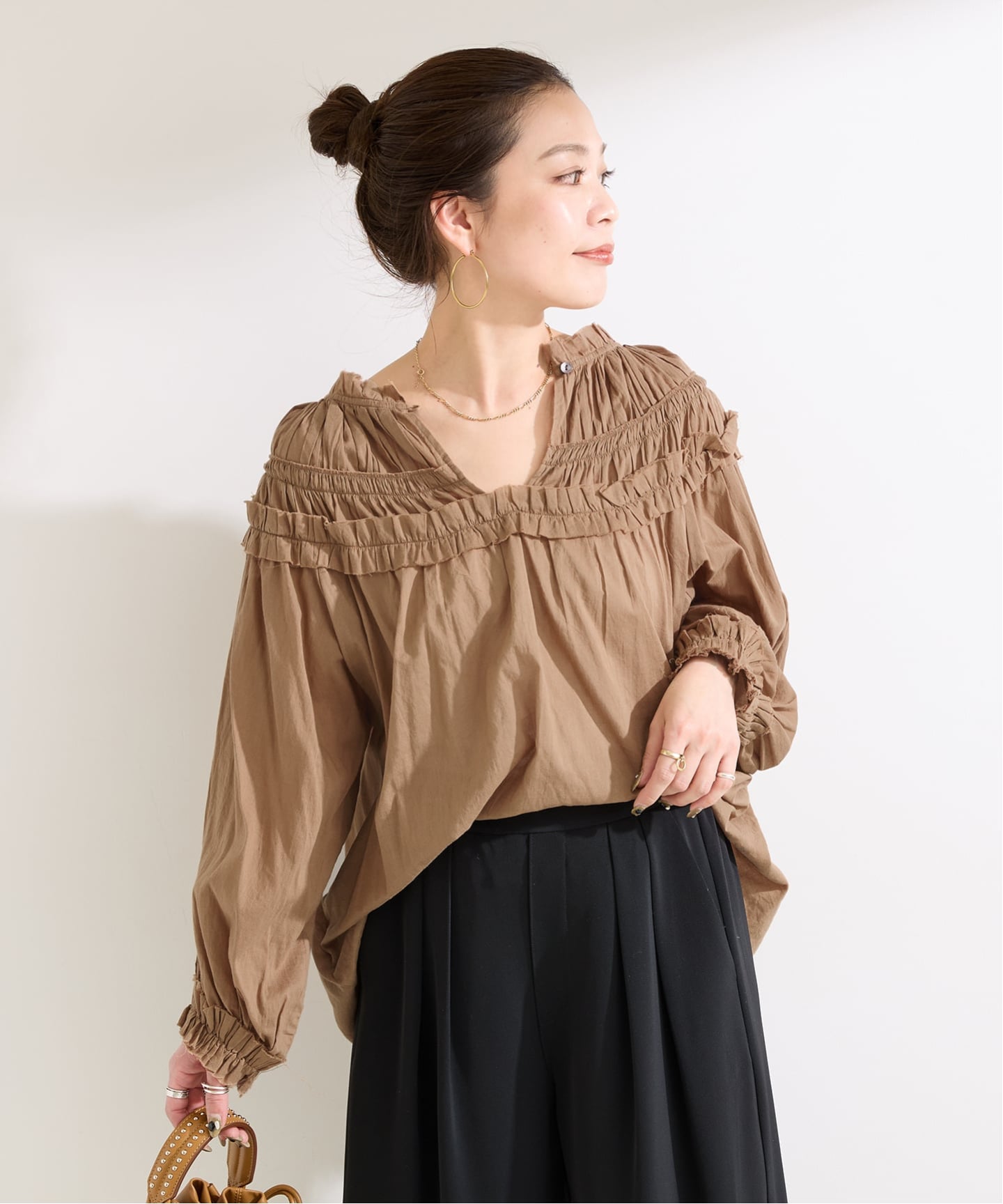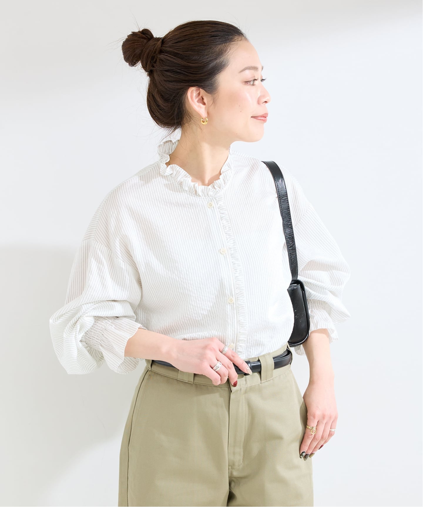 フロントにあしらったフリルが、さりげなく華やかさを演出するブラウス。