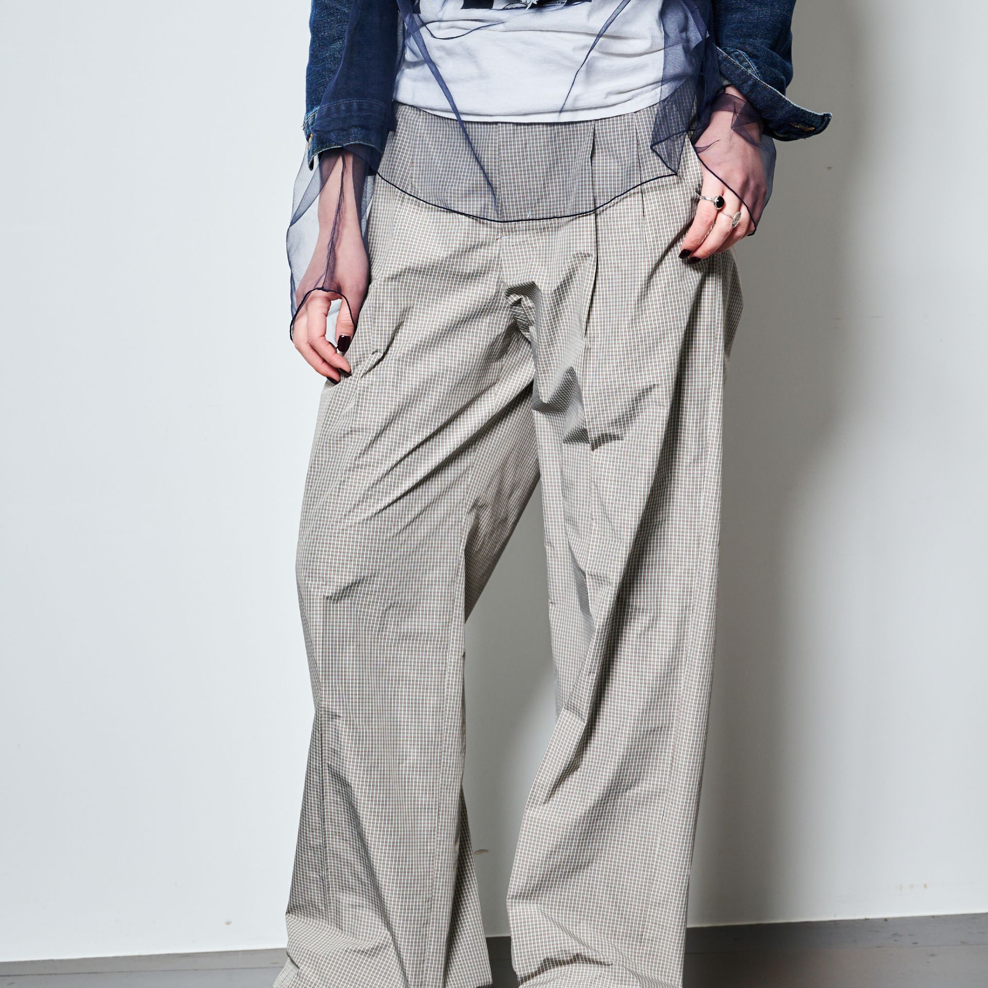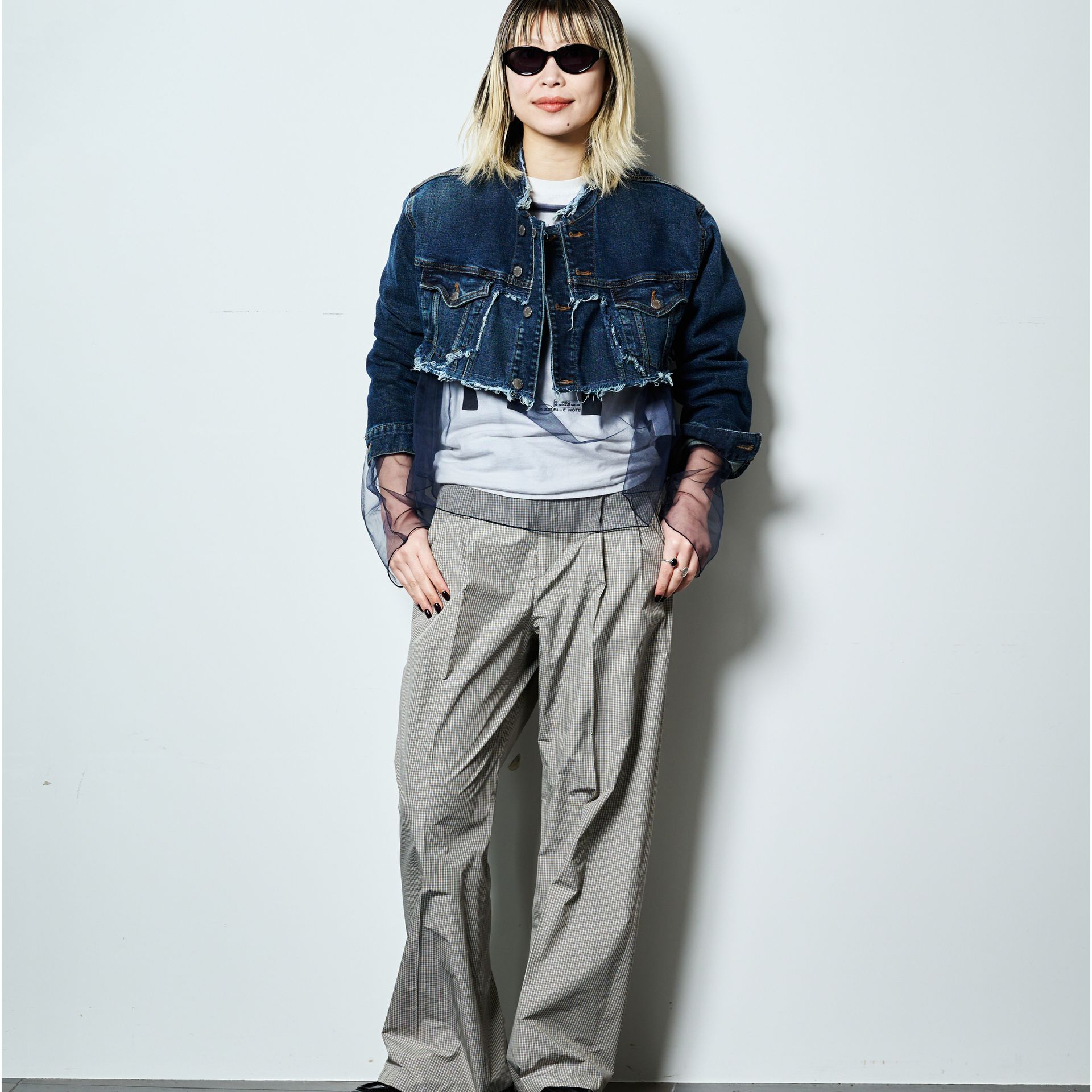 短いデニムジャケットとボトムスとの“繋ぎ”として