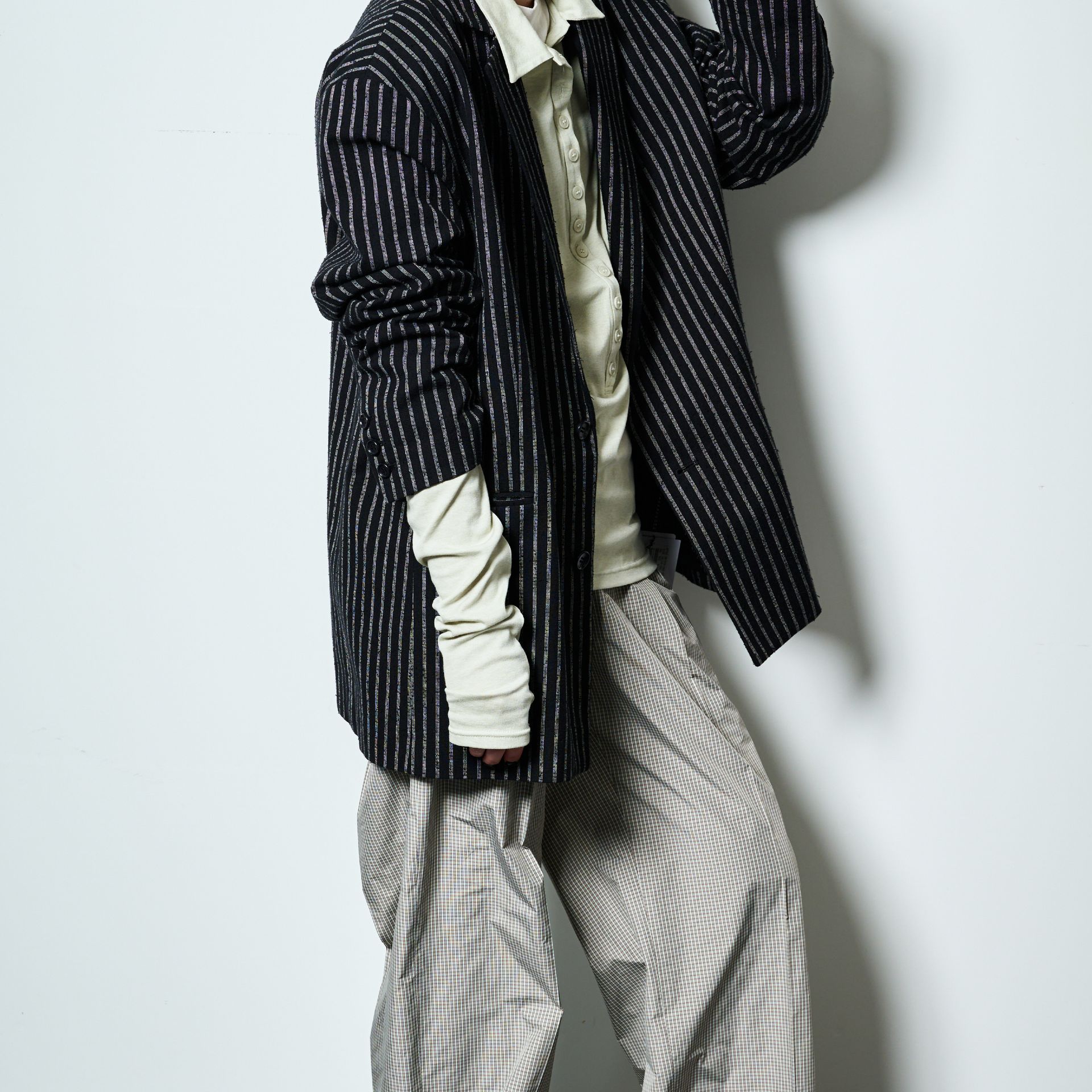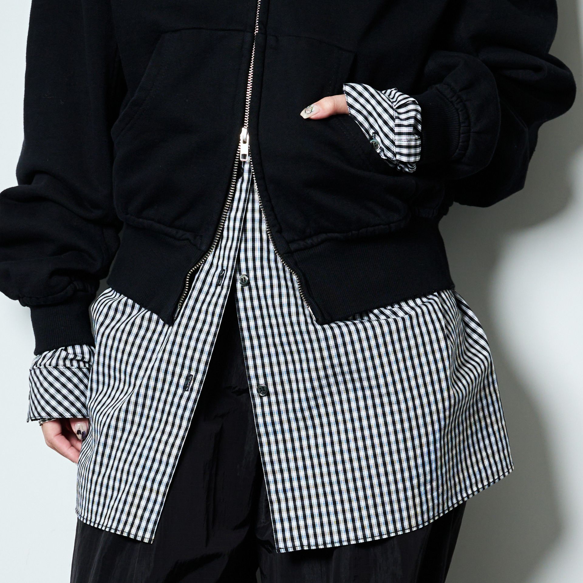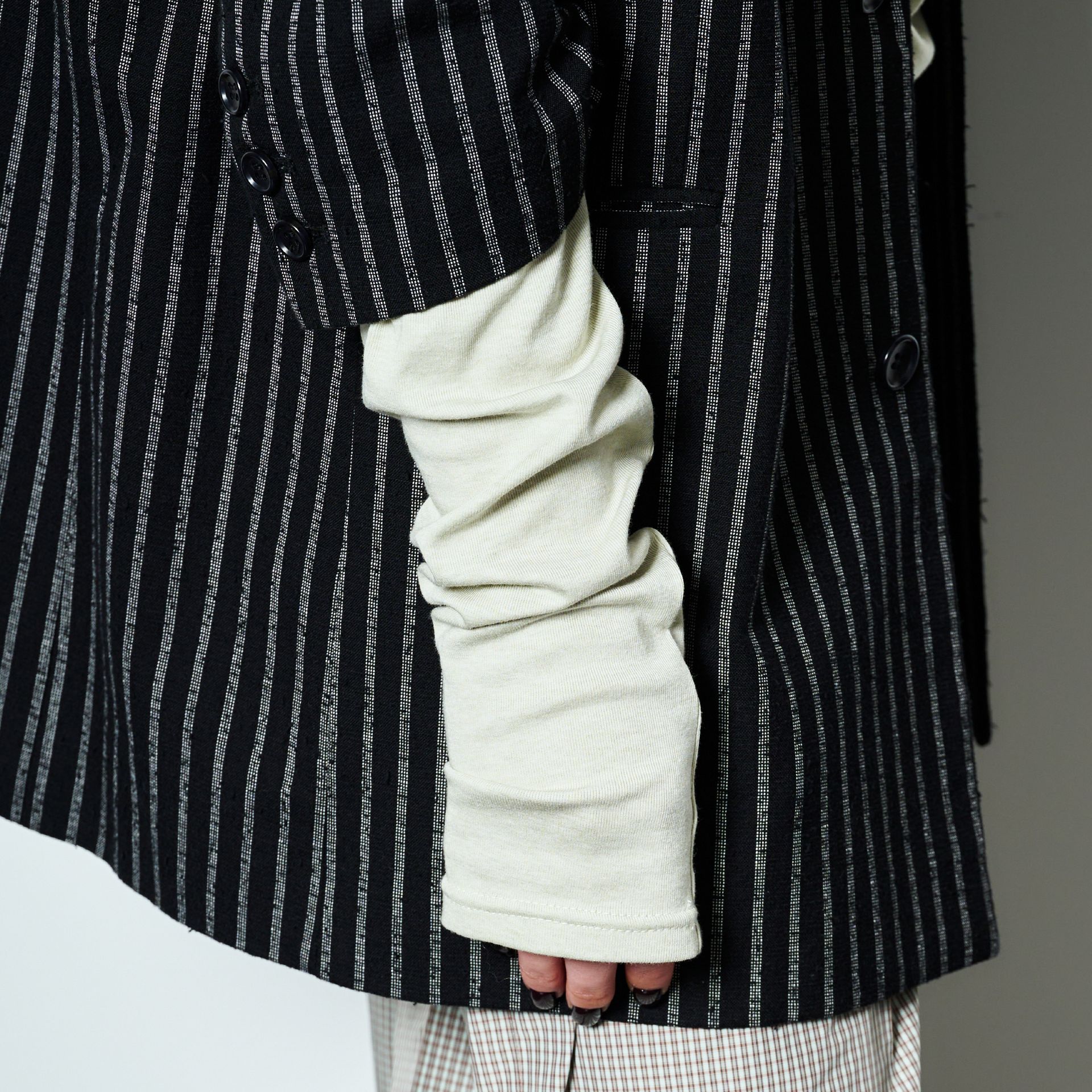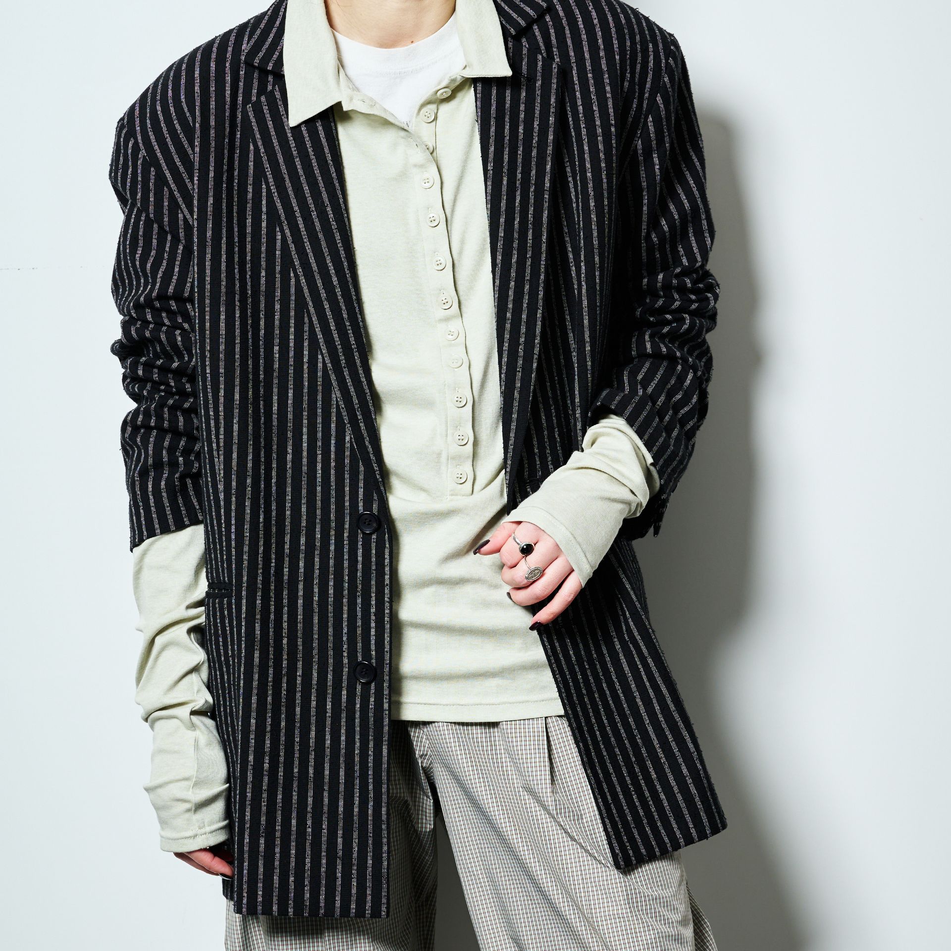 インナーの袖の長さを活かしたスタイル。