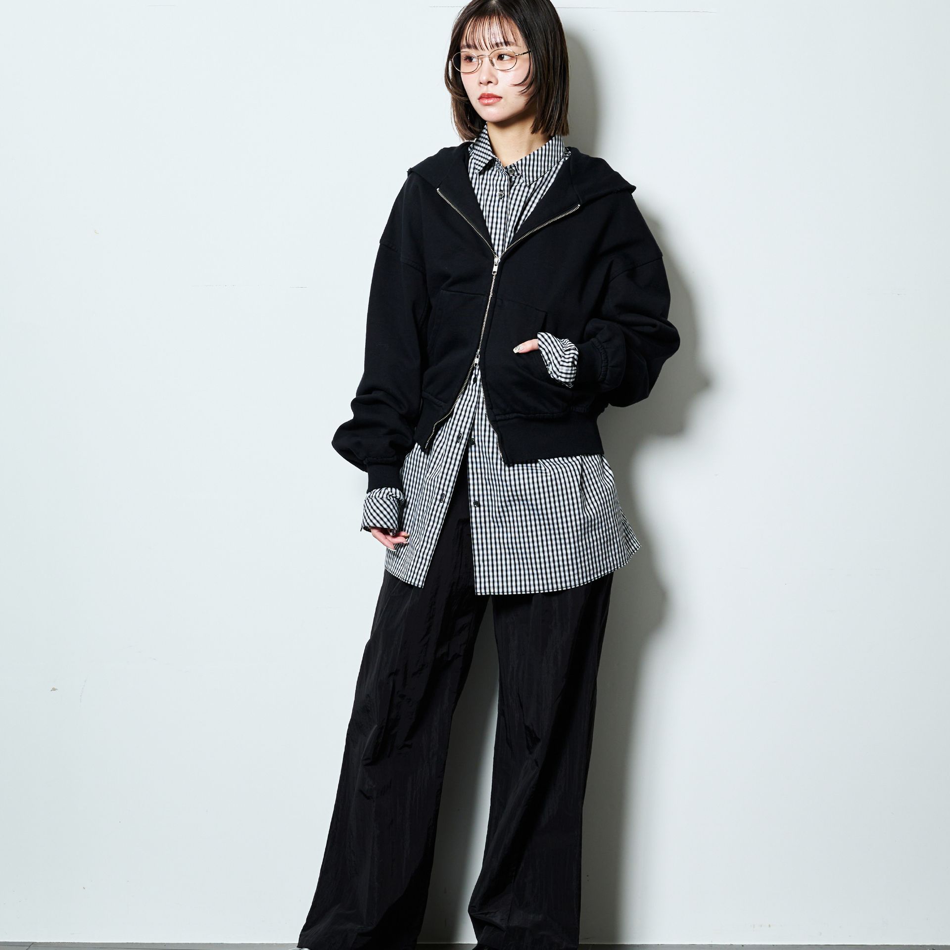 ギンガムチェックとメガネがナードなスタイル。