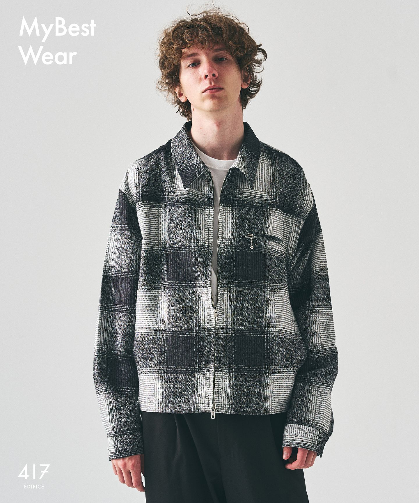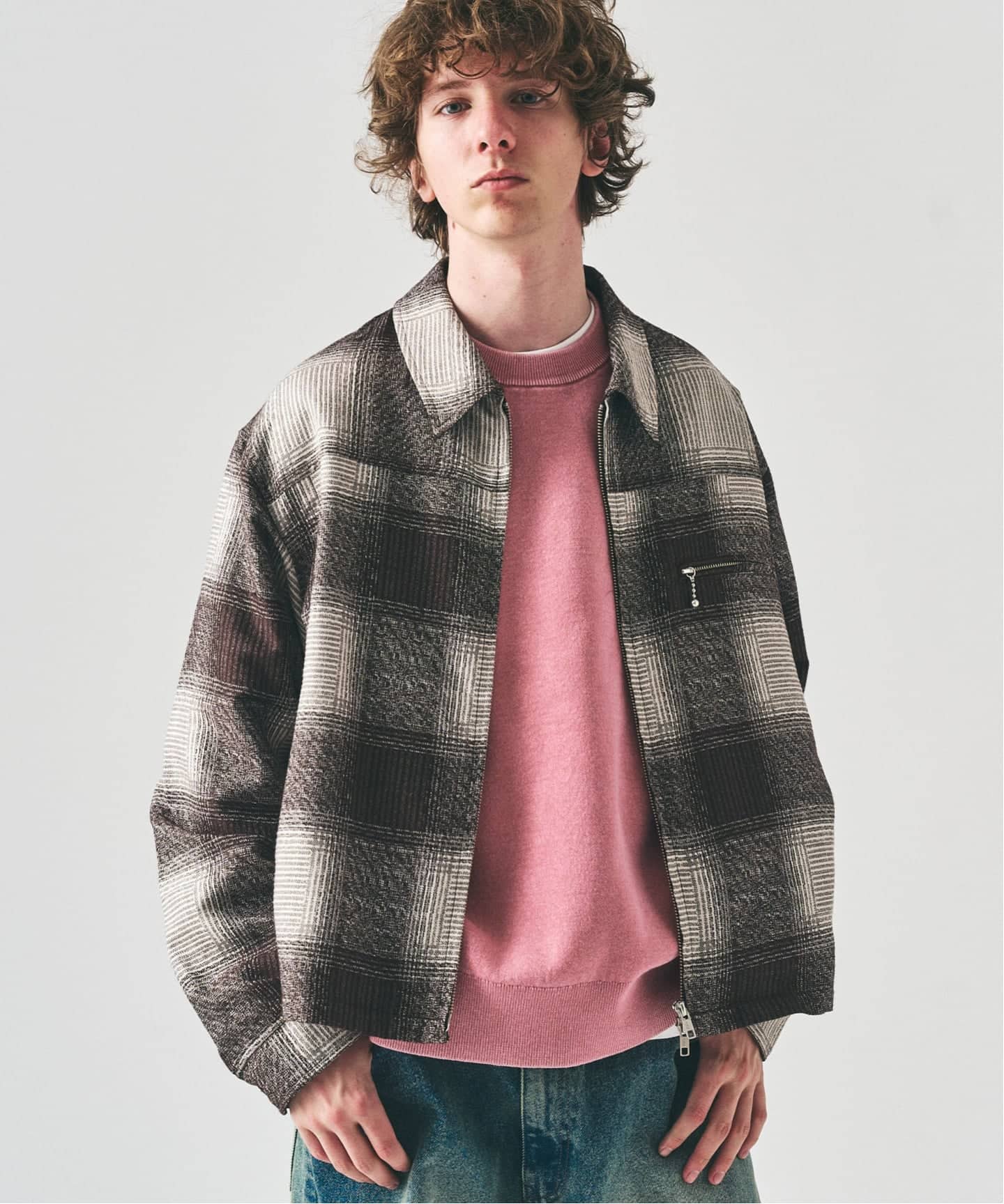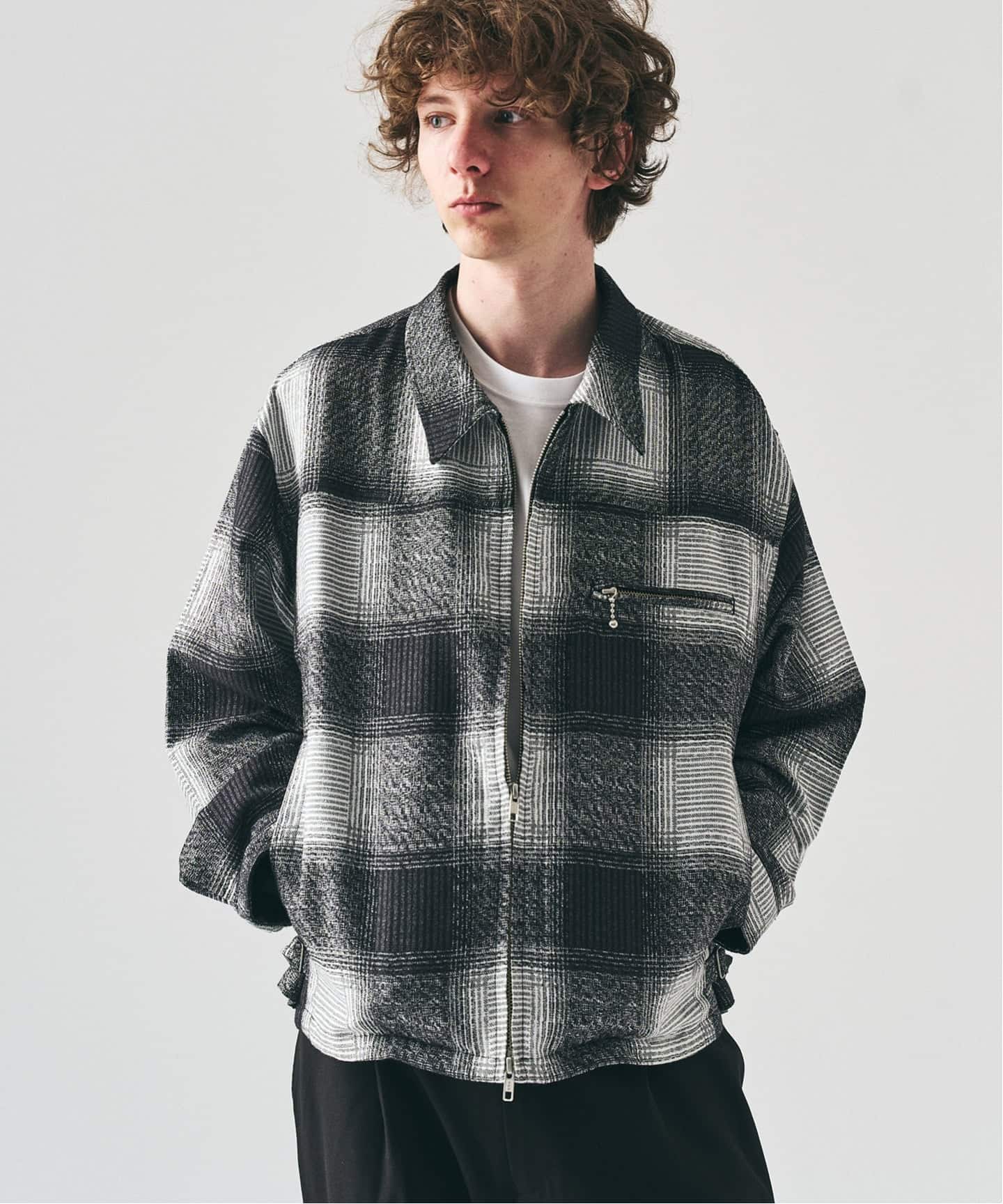 古着にありそうなTCショートブルゾンをベースに、ややワイドなボックスシルエットで今のバランスに調整。グラデーションの効いたオンブレチェックが、カジュアルな中に大人っぽい奥行きを添える。羽織るだけでスタイルが整う、日常に取り入れやすいチェックブルゾンだ。
