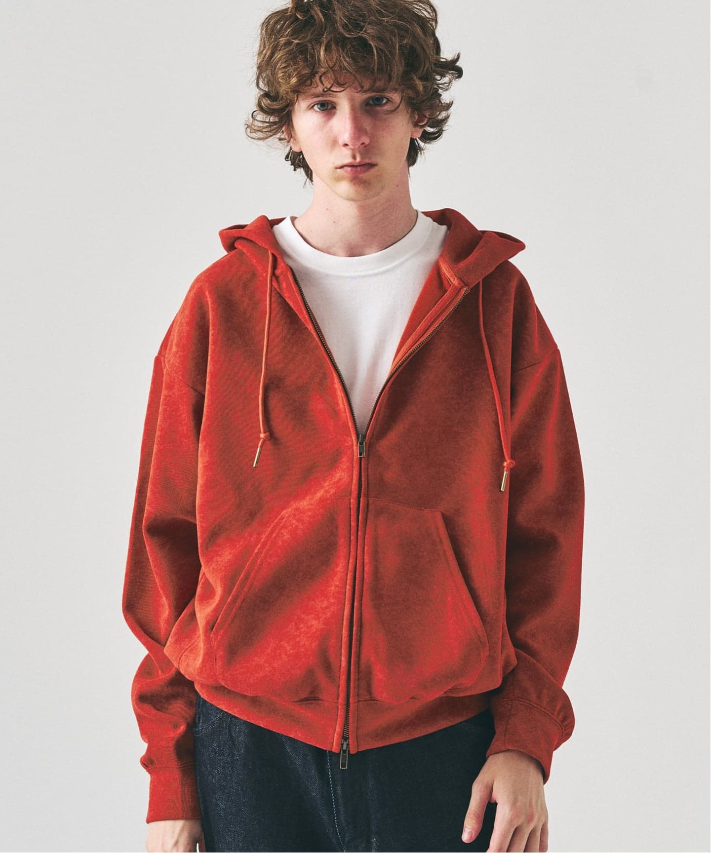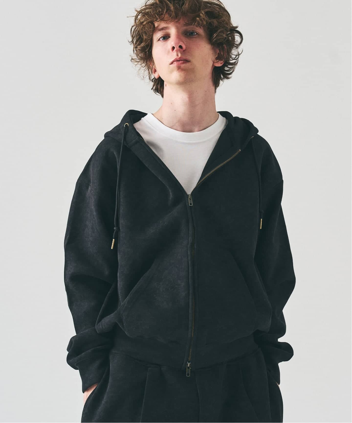 ジップパーカーとスウェットパンツ特有のラフさを、素材のハリと立体感でコントロール。セットアップで着ても、単体使いでもスタイルが崩れにくい。日常着として成立するスウェットという立ち位置が明確だ。