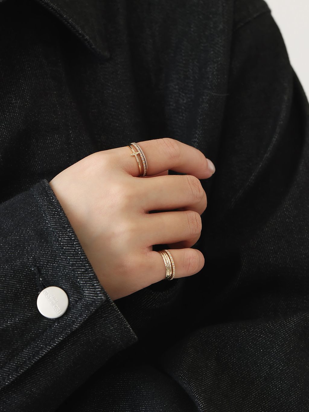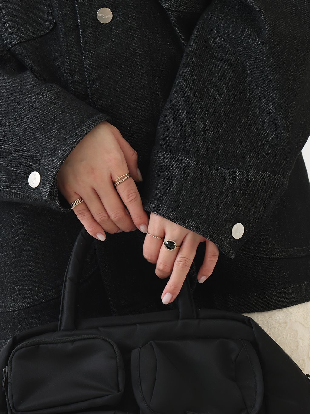 手元には大ぶりのオニキスリングを主役に、繊細なダイヤモンドと地金リングを重ねて華やかにレイヤード。