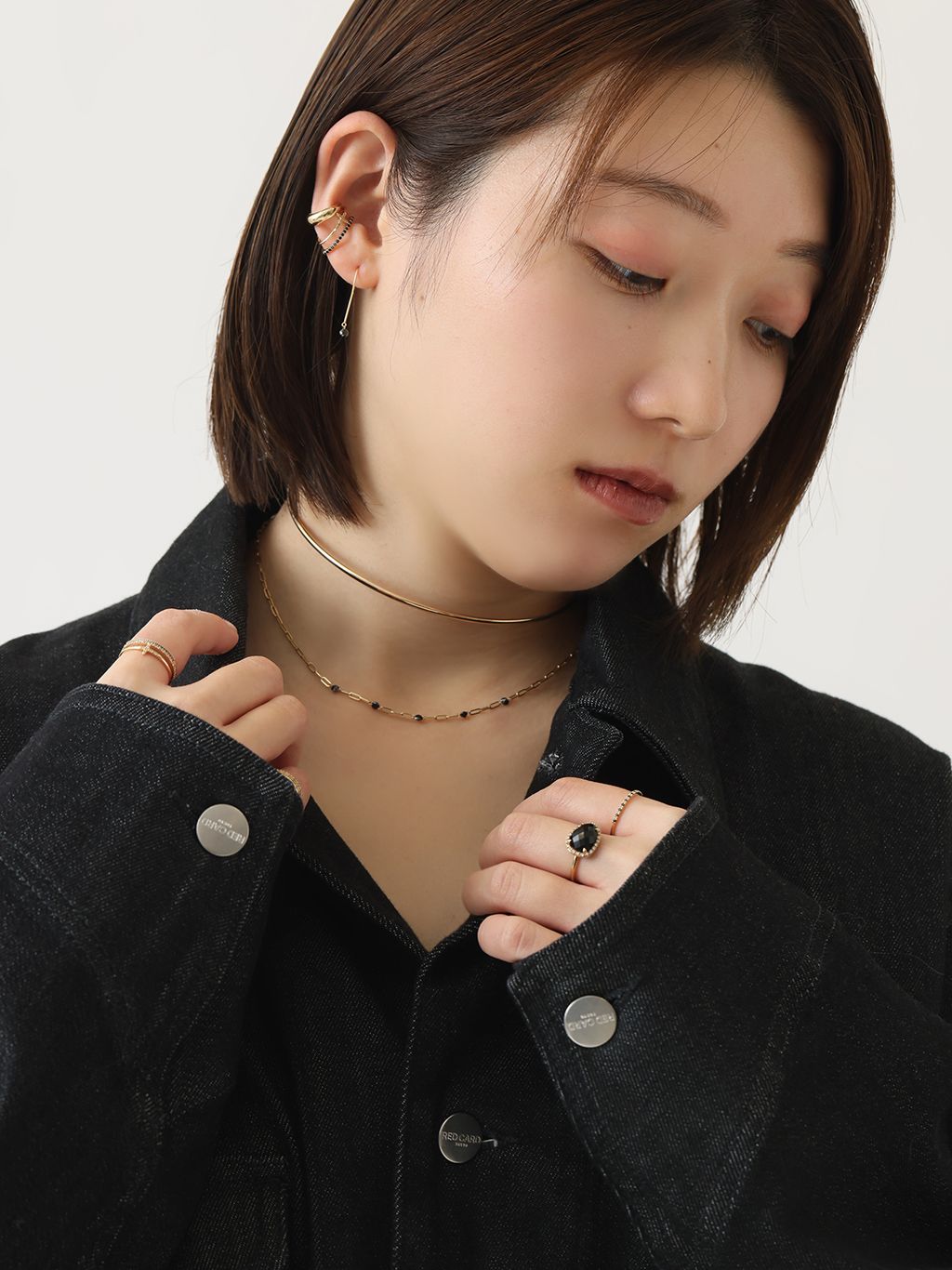 ジュエリーはブラックストーンと地金のミニマルな組み合わせで、コーデに都会的なニュアンスを。