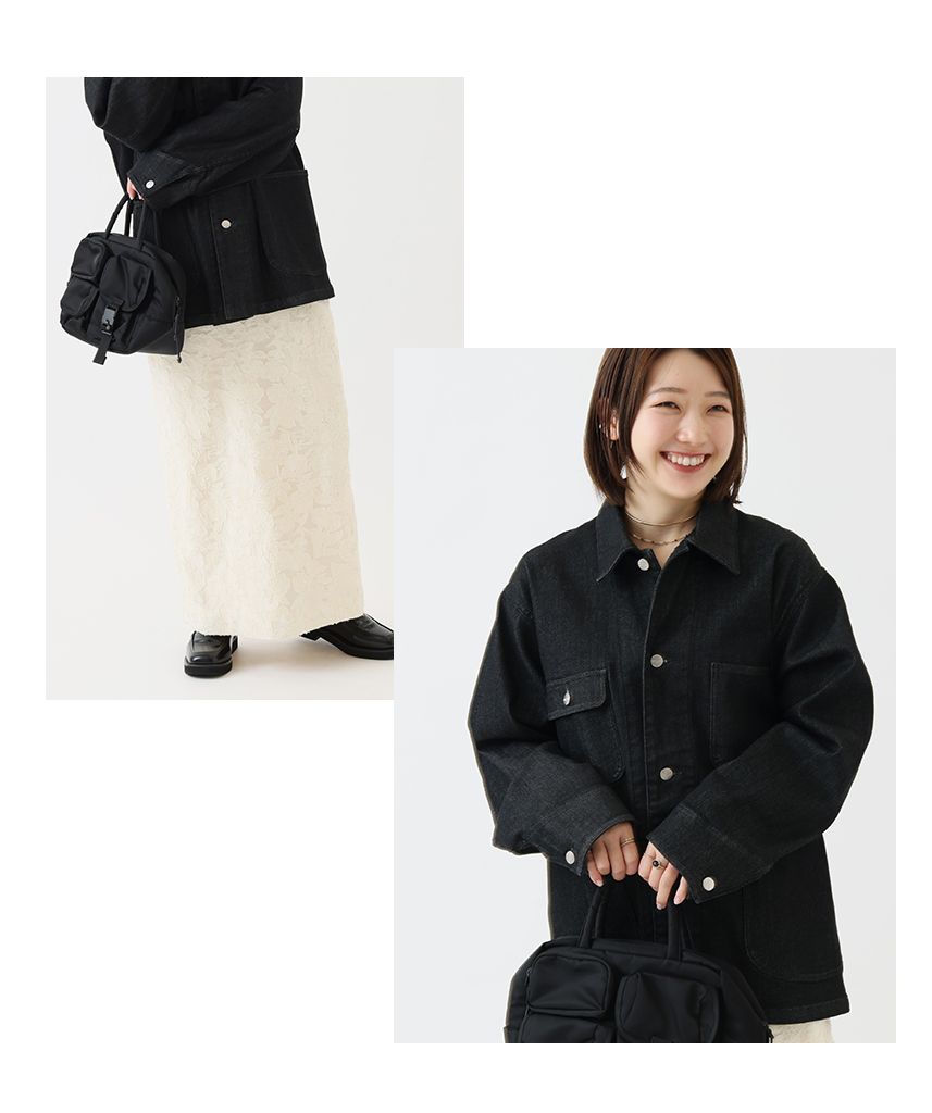 オーバーサイズのカバーオールにホワイトのジャガードスカートを差し込んだ、軽やかなコントラストスタイル。
