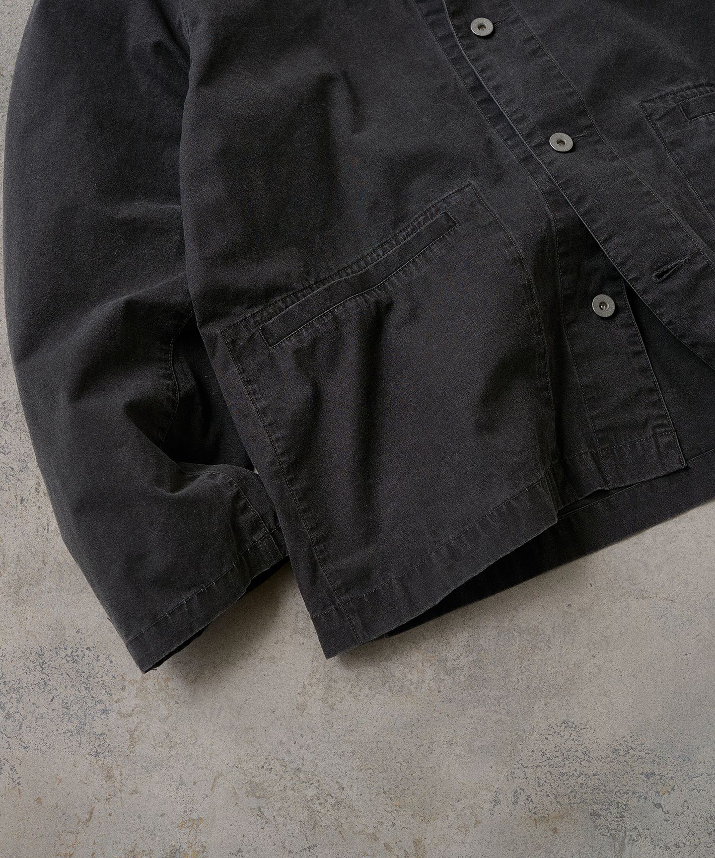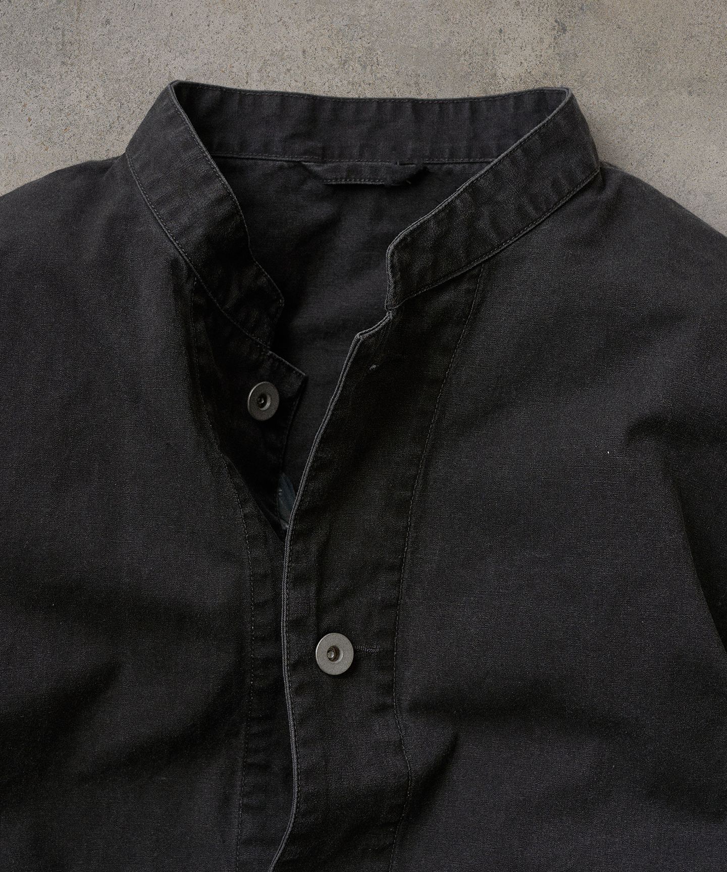 しっかりと密度のあるコットン素材は、洗いをかけることでほどよく力が抜け、見た目にも着心地にも柔らかさを感じられる仕上がりに。シンプルでストイックなバンドカラーデザインだからこそ、生地の表情や立体感が際立ち、一枚で着ても“製品としての説得力”をしっかり感じられます。