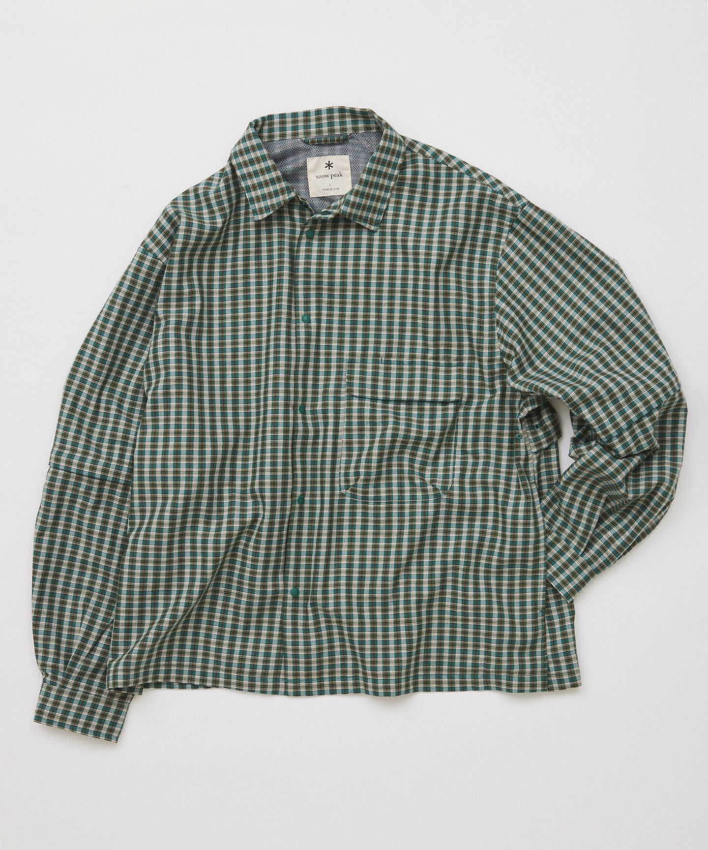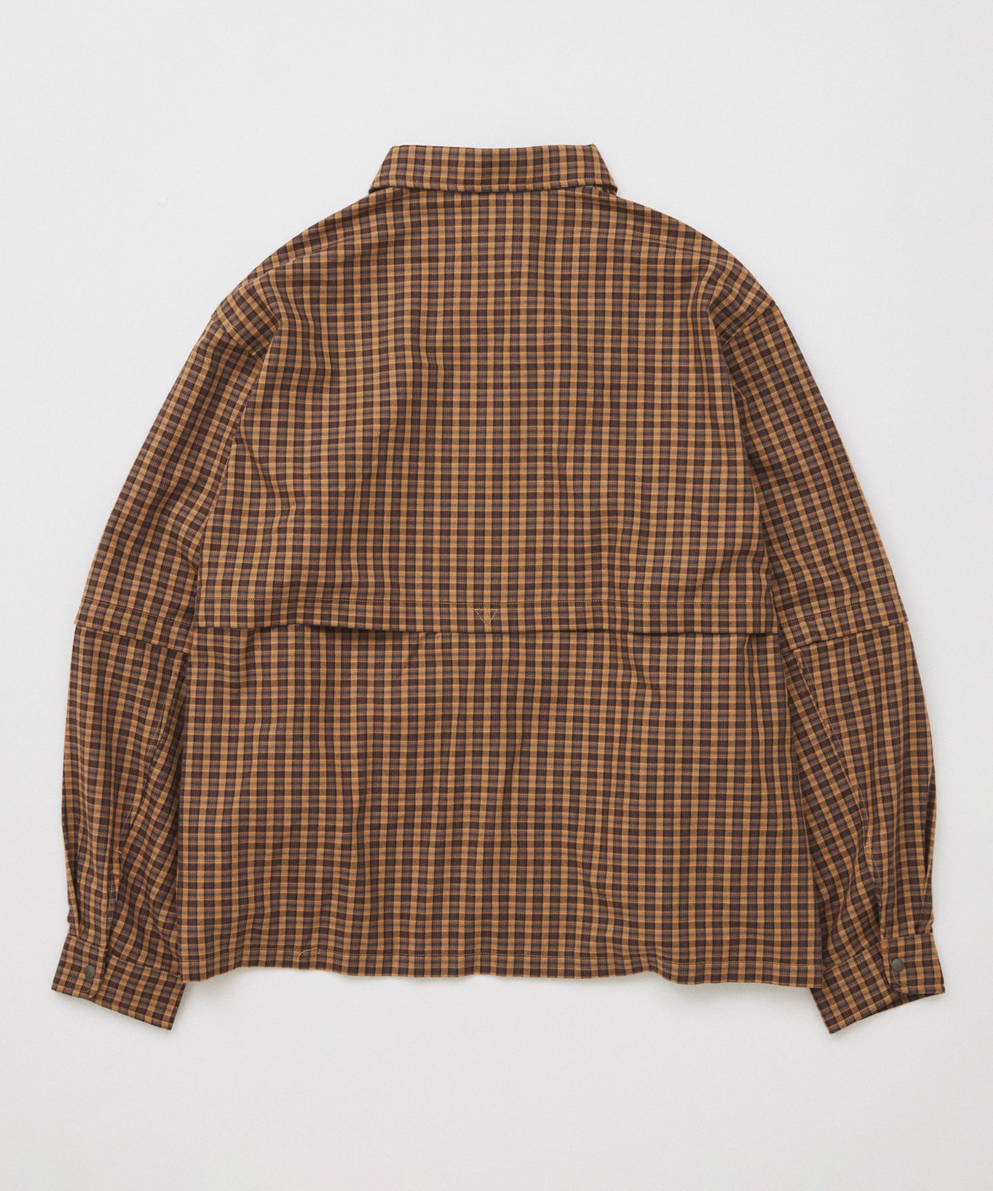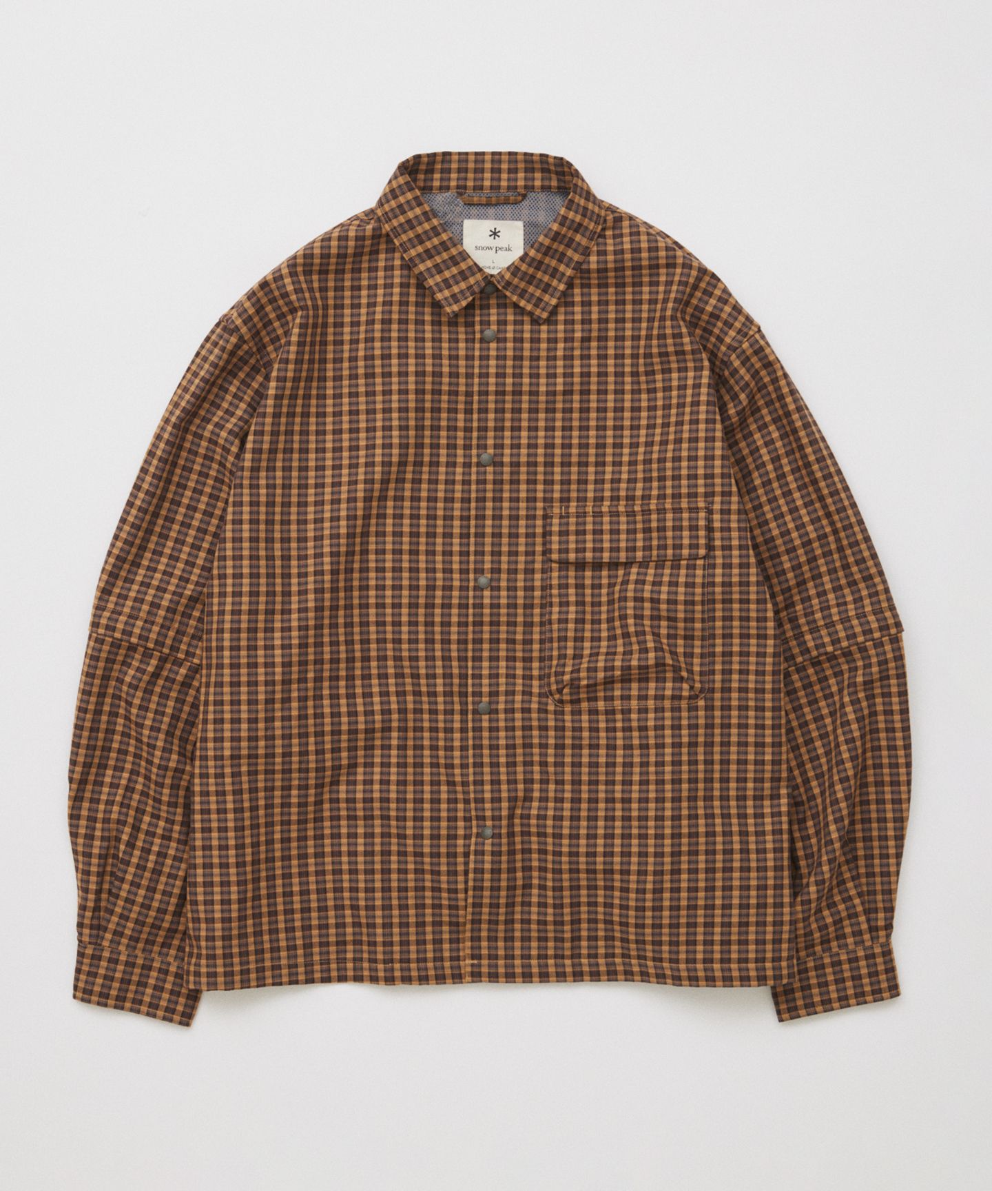 シルエットは、よくあるアウトドアシャツの“長さ問題”をきっちり解消。ワイド&ショートのクロップ丈にすることで、太めのパンツからテーパードまでバランスよくハマる設計に。羽織っても、閉じてもサマになります。