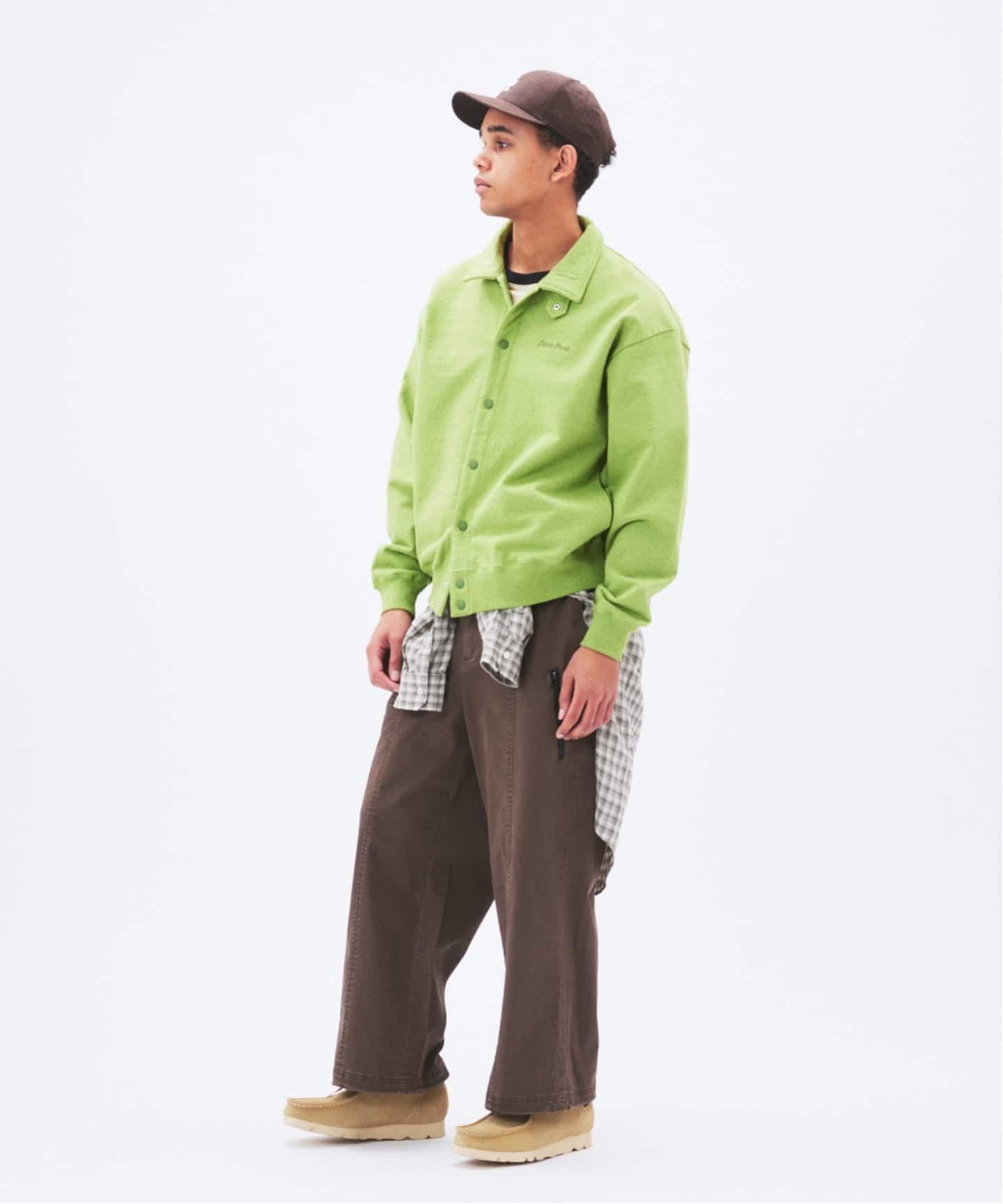 生地はムードのある小さめチェック。色はオリジナルで組み立てていて、トラッドと土臭さが同居するブラウンと、SSらしくクリーンなグリーンの2色展開。アウトドア由来だけど、街で着たときに浮かない色味に仕上がっています。