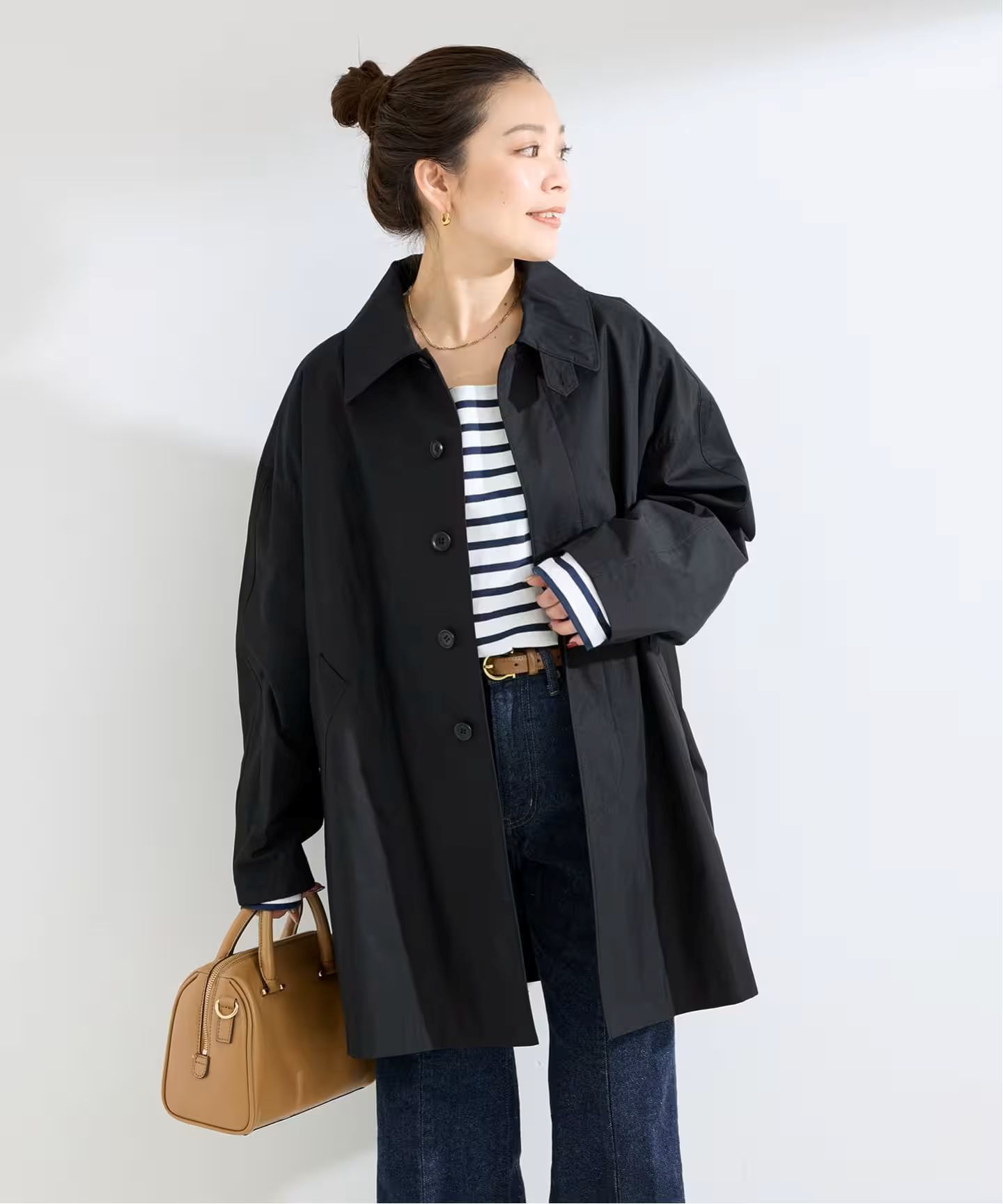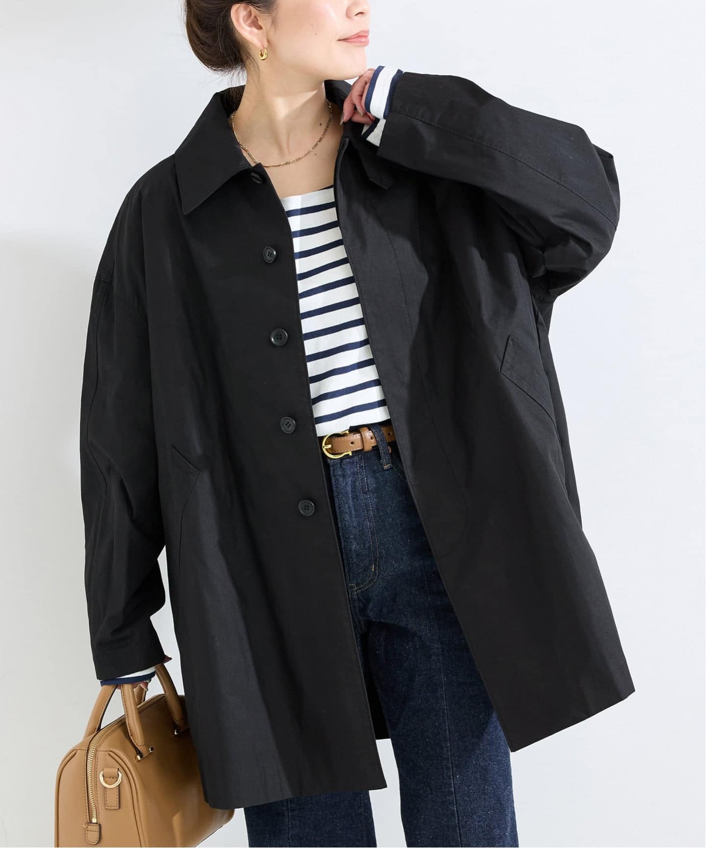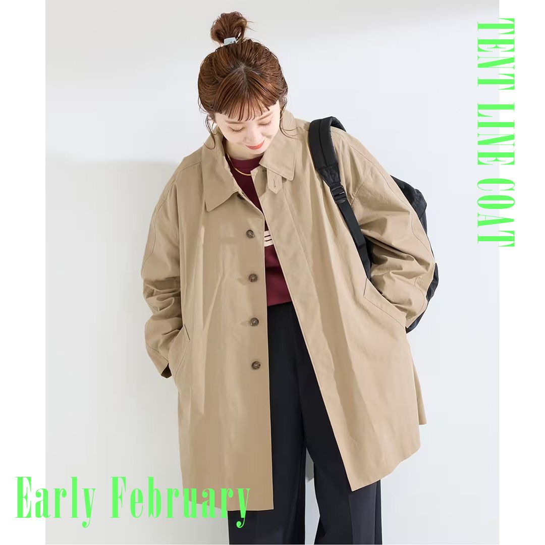 今年はトレンドのステンカラー型にテントラインシルエットが新しい、ややフェードした雰囲気が今っぽいミドル丈コートです。チンタブで襟を立てて着用するのもサマになり、裏地なしで軽く羽織れるアイテム。