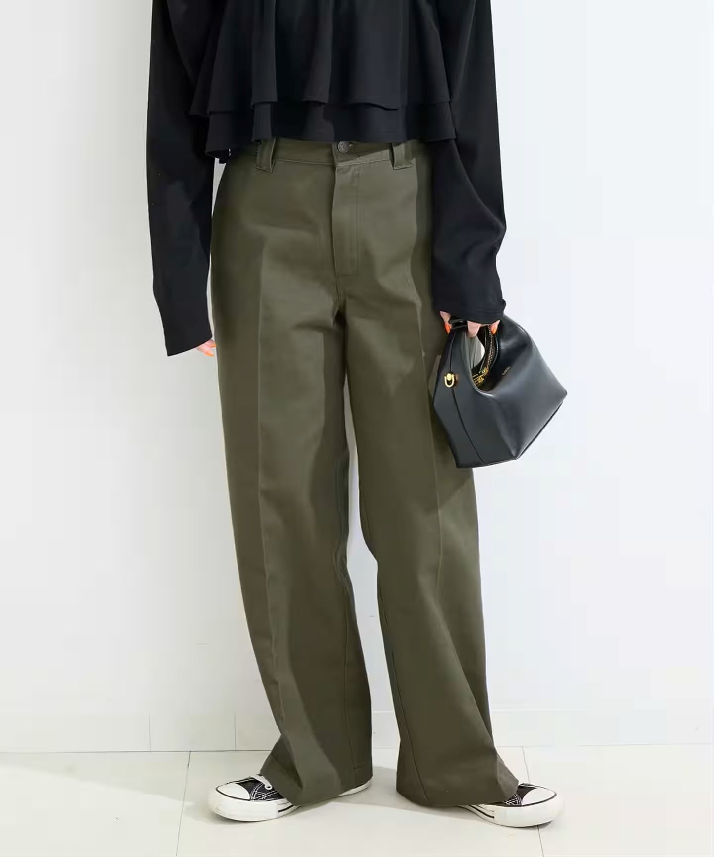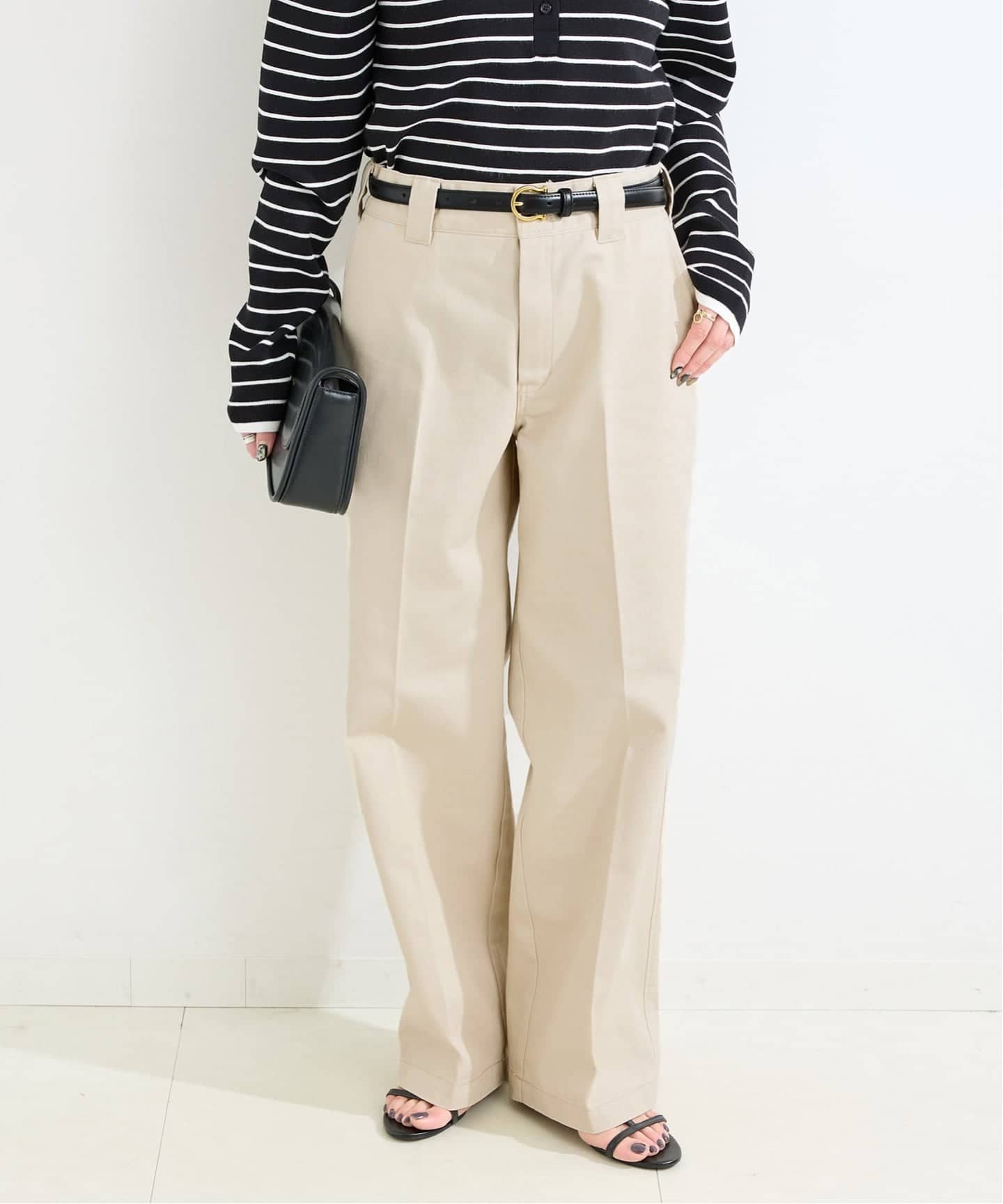ブラックは単色、ホワイトはスラブネップ入りの配色にした表情がある素材です。ダブルニー風のディティールを取り入れたワイドすぎないストレートシルエットにセンタープレス入りでスッキリとした印象。バックゴムなのでストレスフリーな穿き心地で、裾はドロスト付きでシルエットを変えられます。