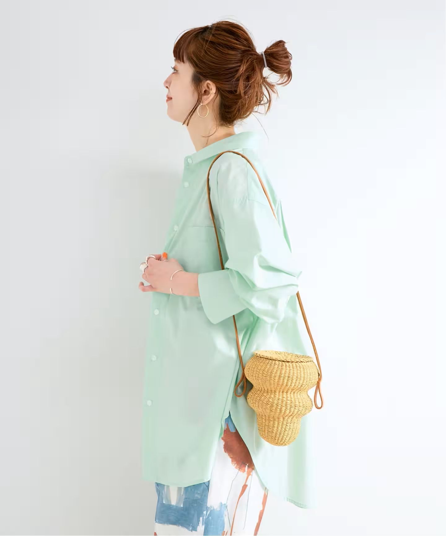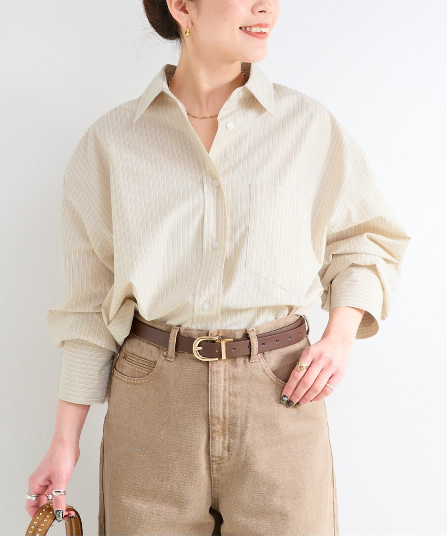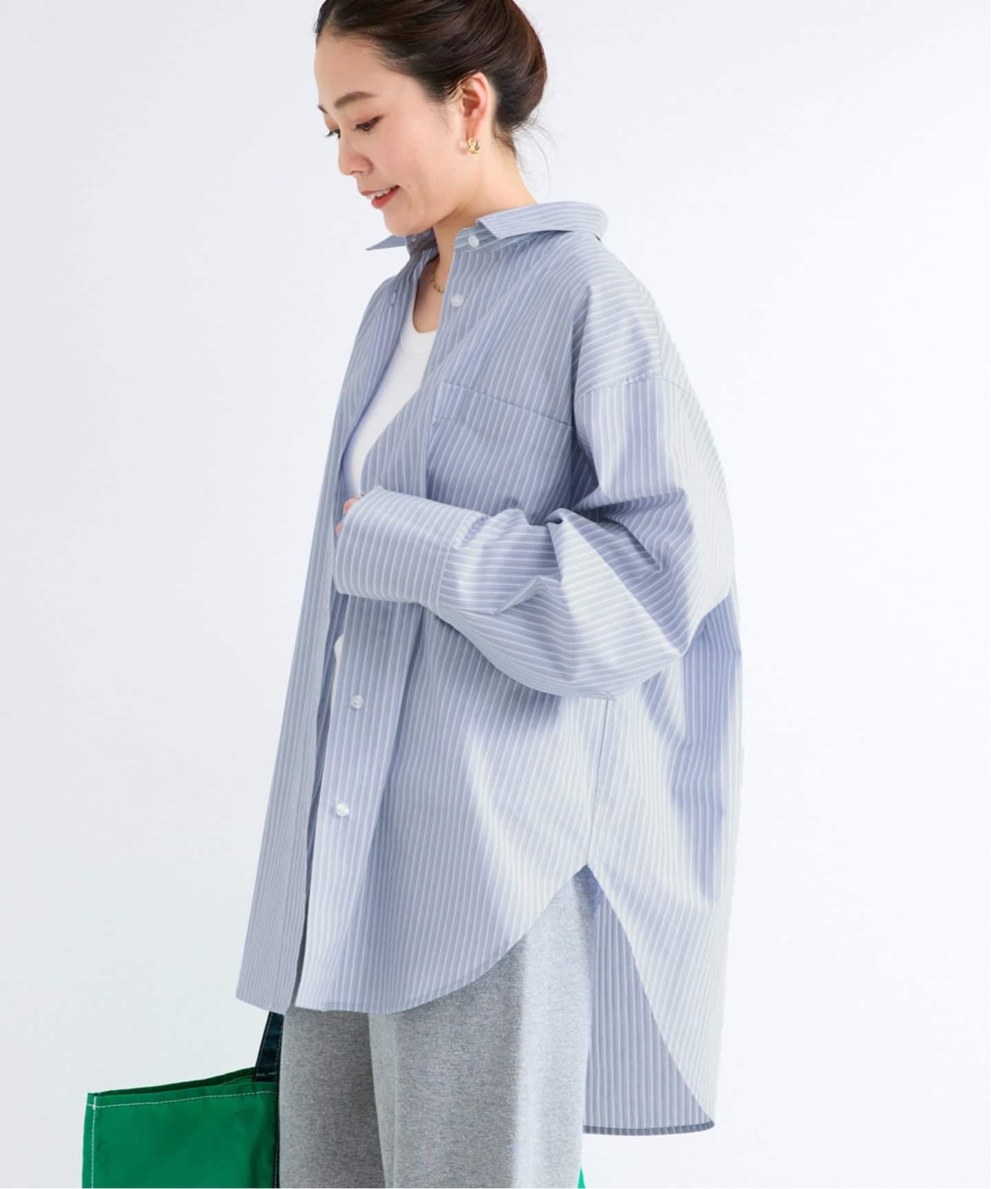 コットンの柔らかさにポリエステルの程よいハリ感をプラスし、カジュアルすぎずキレイめな印象に仕上げています。オーバーサイズのシルエットに、長めの丈と太めのスリーブデザインで、抜け感のあるリラックススタイルに。広めの袖は袖口の調整が可能な仕様で、シルエットに変化をつけられます。ストライプ柄のバリエーションに加え、春らしい優しいカラーを揃えた多色展開。一枚着としてはもちろん、羽織りとしても活躍し、季節の変わり目のスタイリングに取り入れやすいアイテムです。