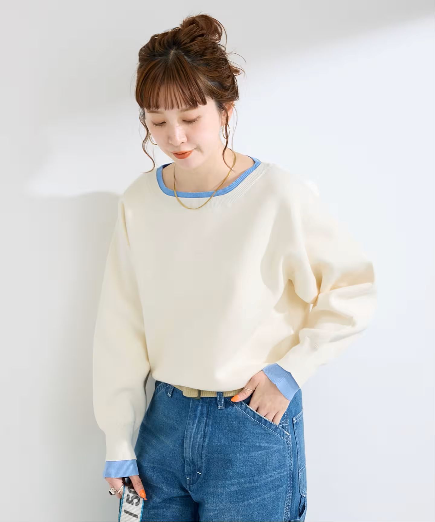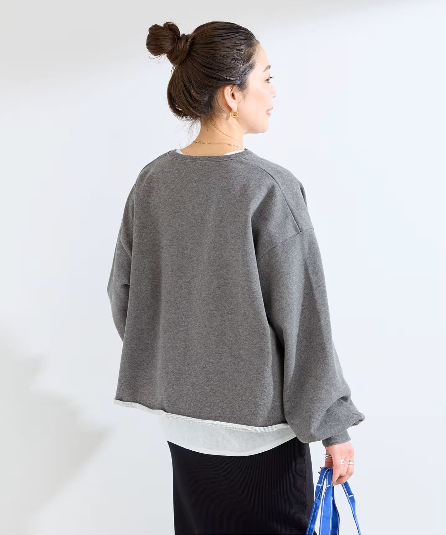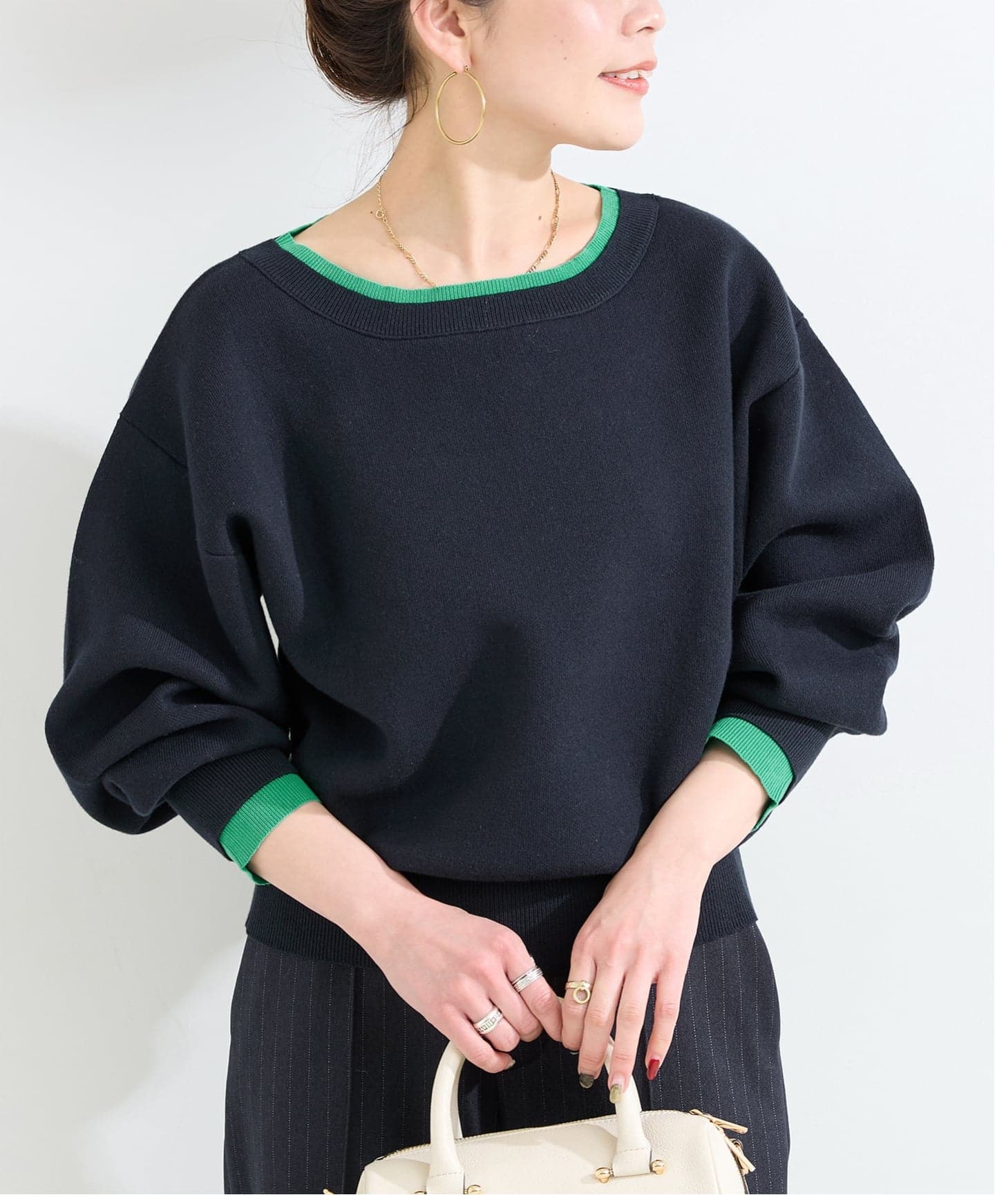 スウェットライクなシンプルな編地なのでカジュアルになりすぎず、袖がパフスリーブなのでフェミニンな雰囲気でも着用いただけます。裾にリブをつけることで丈感がコンパクトになるようなデザインにしております。