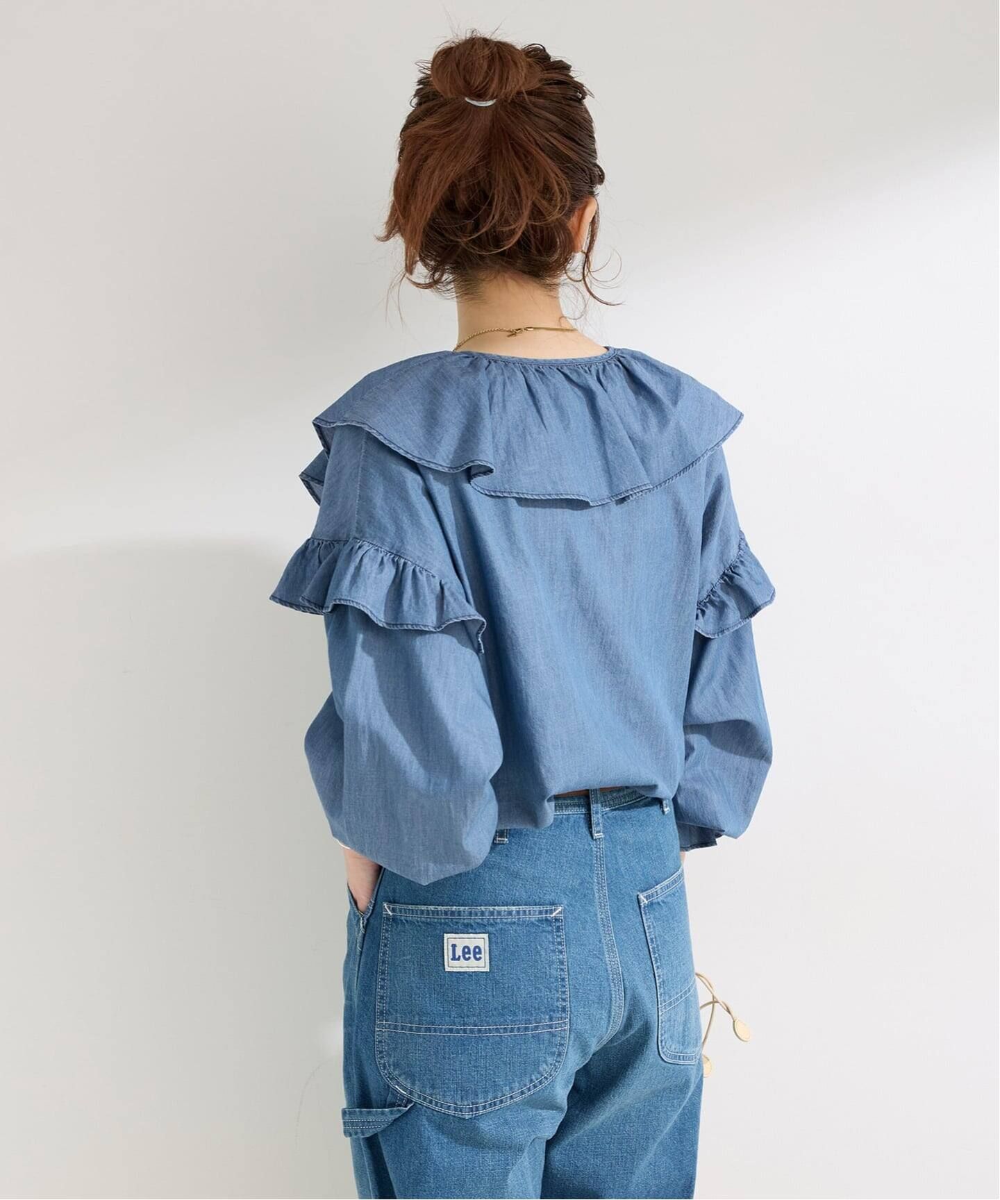 薄手のデニム生地を使用したラッフルブラウス。