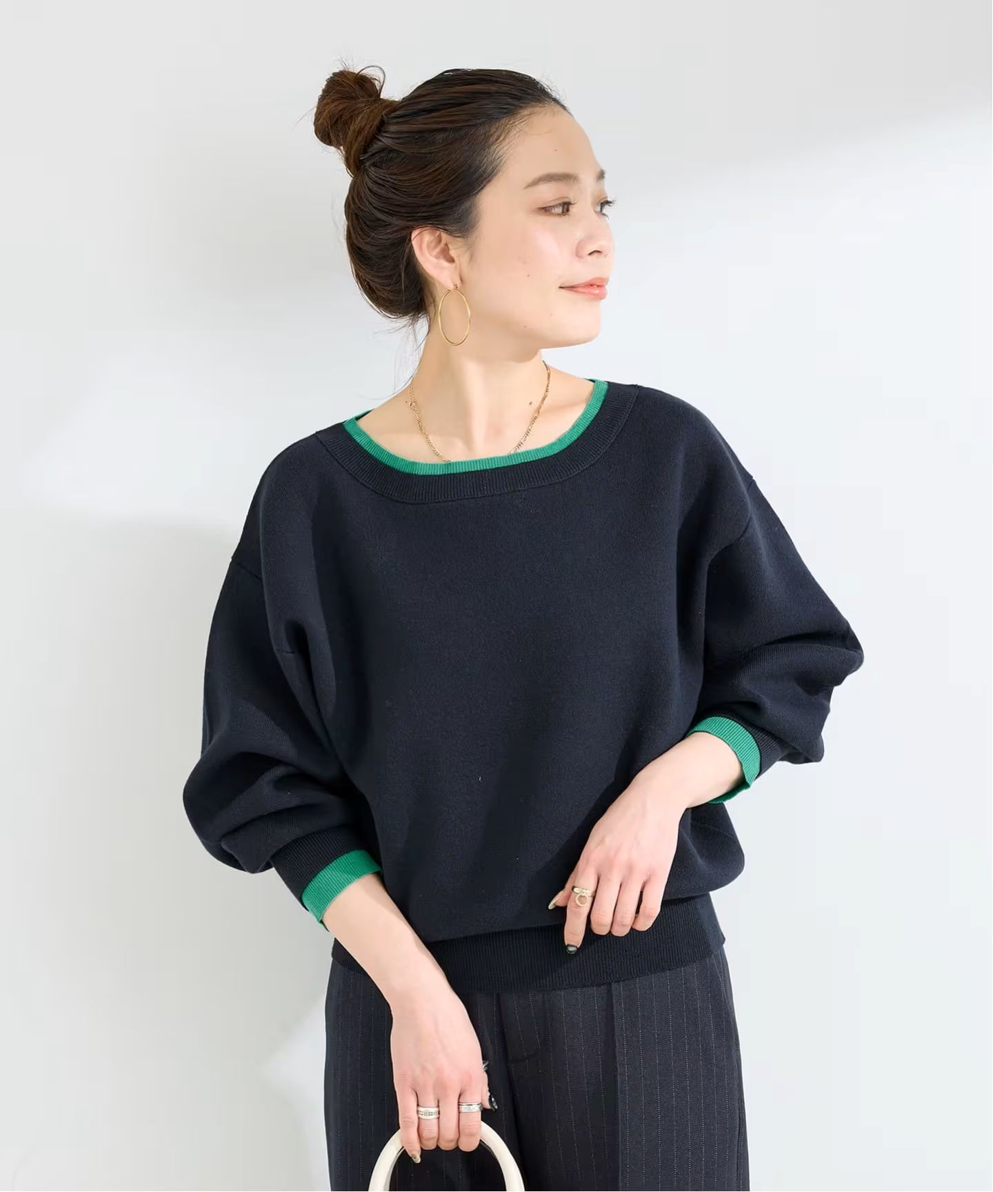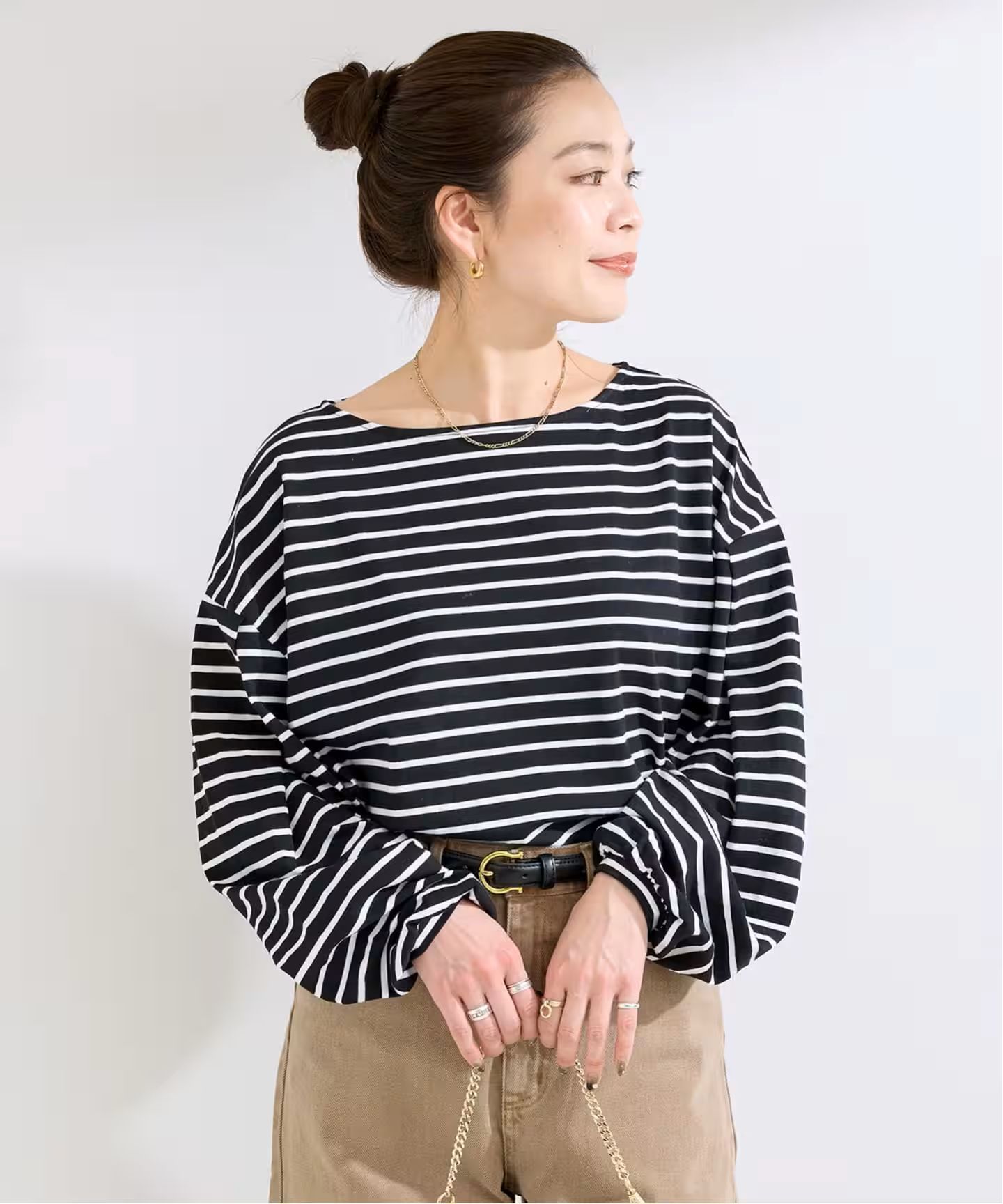 ほどよく開いたボートネックが首まわりをすっきり見せ、抜け感のある印象にしてくれます。袖にはタックを入れてボリュームを持たせ、シンプルな中にも女性らしい立体感をプラス。デニムやスカートなど、どんなボトムにも合わせやすく、シーズンレスに着回せる一枚です。