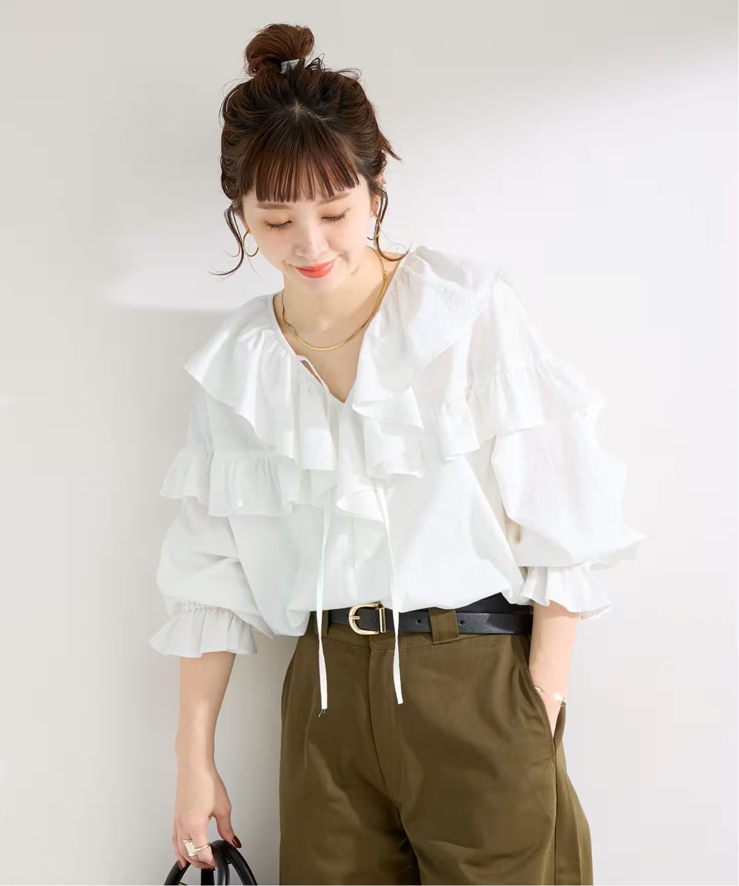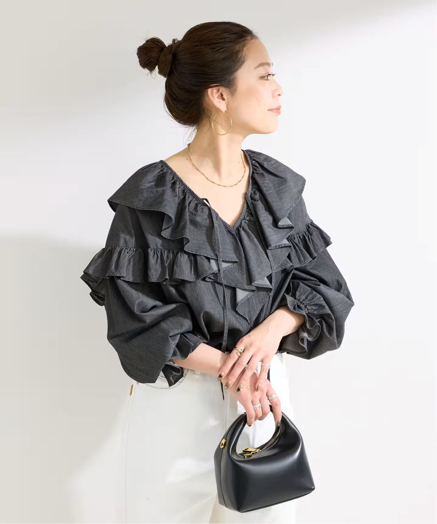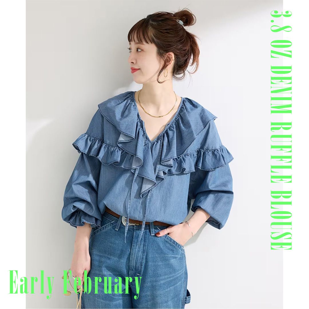 女性っぽさと抜け感がでるVネック開きにラッフルカラーをあしらい、顔まわりを華やかな印象にしてくれます。身頃と袖にもフリルを施し、動くたびにやさしく揺れる表情をプラス。袖はキャンディースリーブで程よいボリュームでフェミニン感があり、デニムの素材が甘さを抑えてくれ、程よいカジュアル感と軽さが出ます。