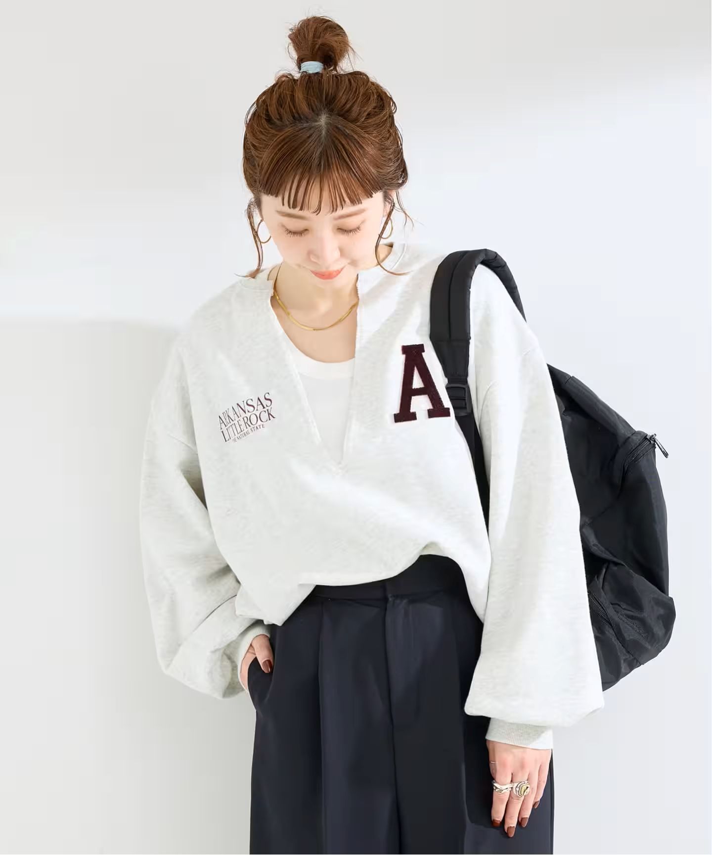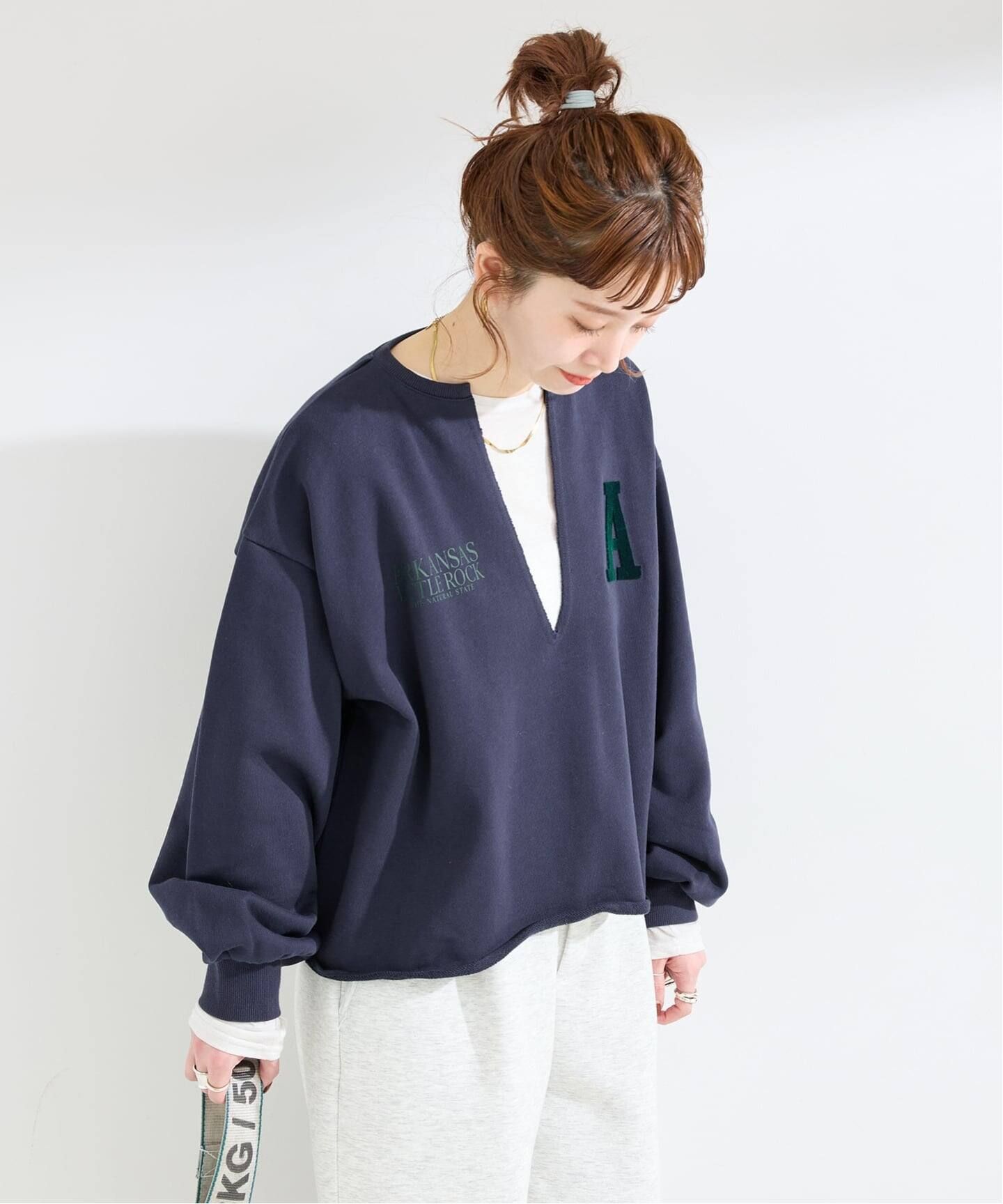 ラバープリントと立体的なアルファベットロゴ刺繍をあしらった遊びのあるデザインに、深Vネック開きでカジュアルすぎず大人っぽい印象に仕上げています。程よくゆとりのあるシルエットにし、裏毛スウェット生地で肌当たりもよくリラックス感がありながらも一枚で着映えするアイテム。