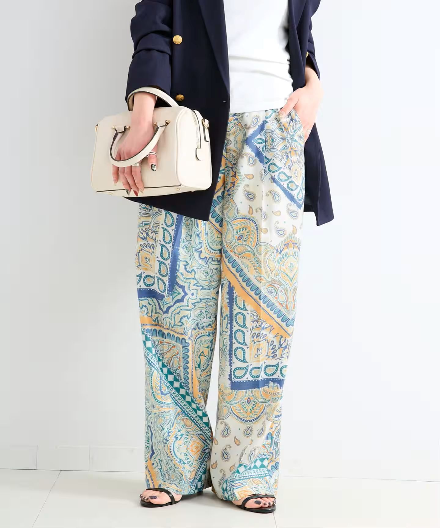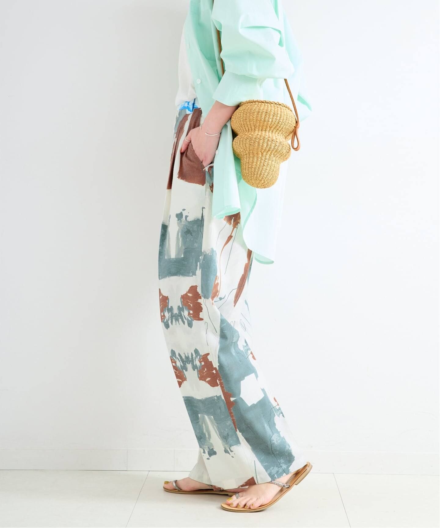 T/Rツイル素材を使用したソフトでドレープ性があり、カラーが強く出過ぎず落ち着いた色合いが魅力。コモ(イタリア)とロンドンのプリントスタジオによるFINE ARTタッチの3柄で展開。タックトラウザー型ですっきりしたナローストレートシルエットなので、合わせるトップスの幅が広がります。