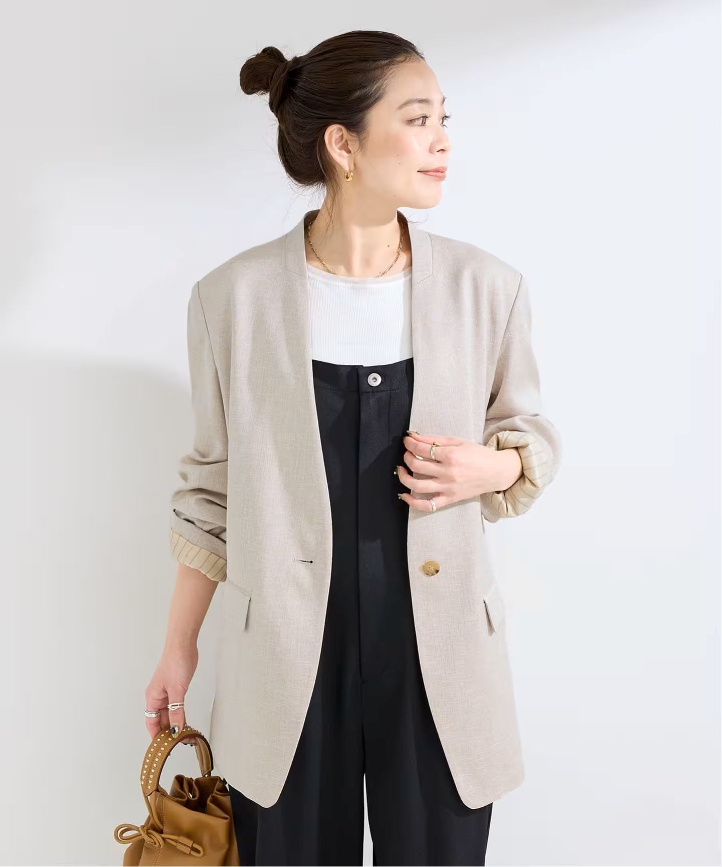 リネンライクな表情の生地でシンプルなデザインながら、リラックス感のあるシルエットでこなれた印象に仕上げました。フロント1ボタン仕様ですっきりと、オンオフ問わず着回しやすい一着です。袖口にはスリット&裏地にストライプ柄を使用しているので、袖を折り返した着こなしも雰囲気が出ておすすめです。