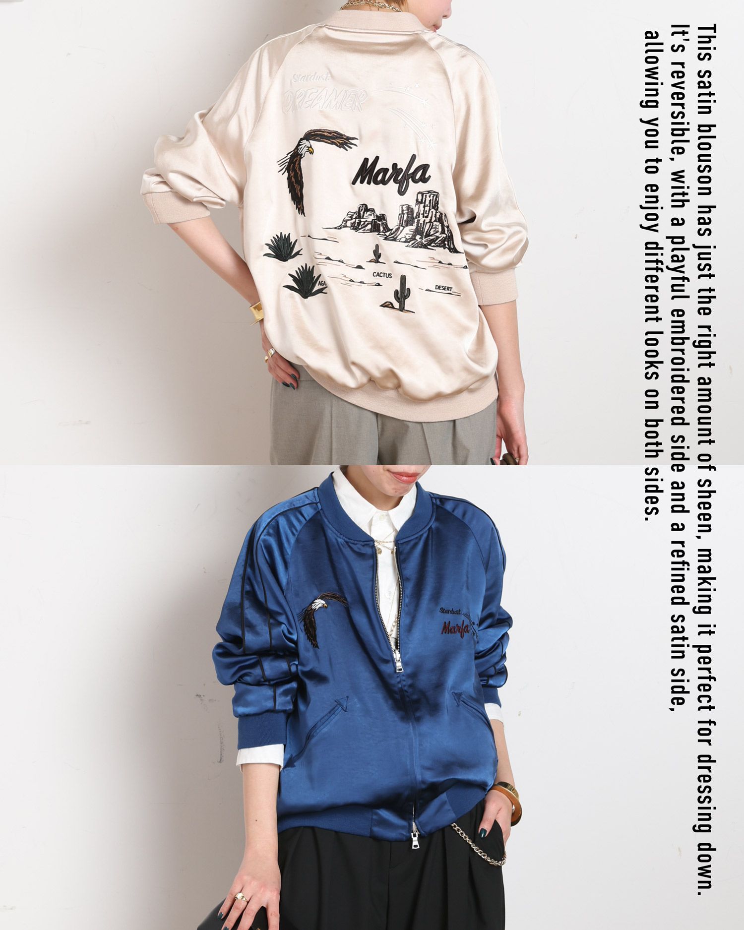 遊び心のあるキャッチ―な刺繍面と、滑らかで品の良いサテン面の異なる表情が楽しめるリバーシブル仕様。