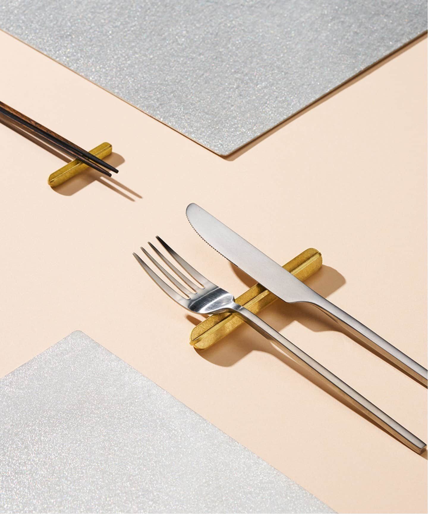 軽やかでありながらもカトラリーレストとしての機能を備え、粗し加工を施した真鍮の落ち着きのある風合はジャンルを問わず様々なシーンでお使いいただけます。