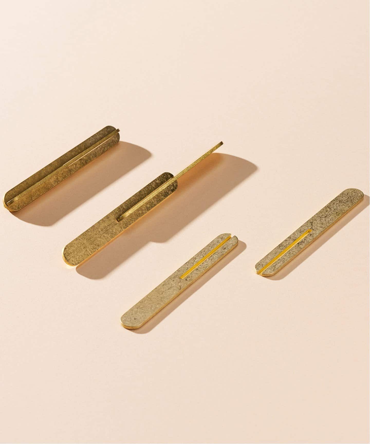 ショートは丸みを帯びたフォルムの真鍮鋳物、ロングは切り出したパーツを組み合わせて使用していただく切り出しの真鍮材です。