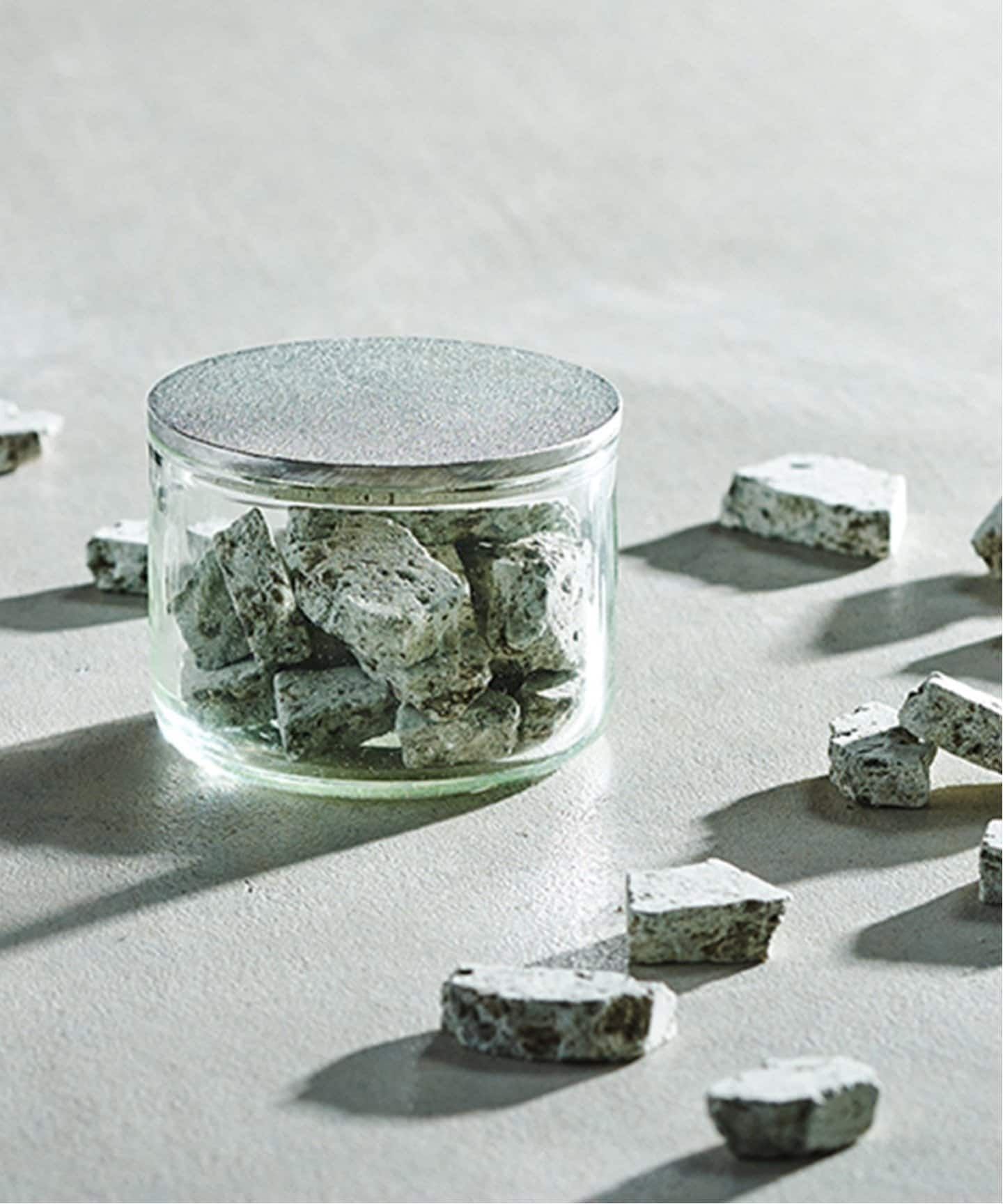 アロマストーンとして大谷石の端材、蛍光灯リサイクルガラスケース、リサイクル錫(すず)の鋳物の蓋のセット品です。