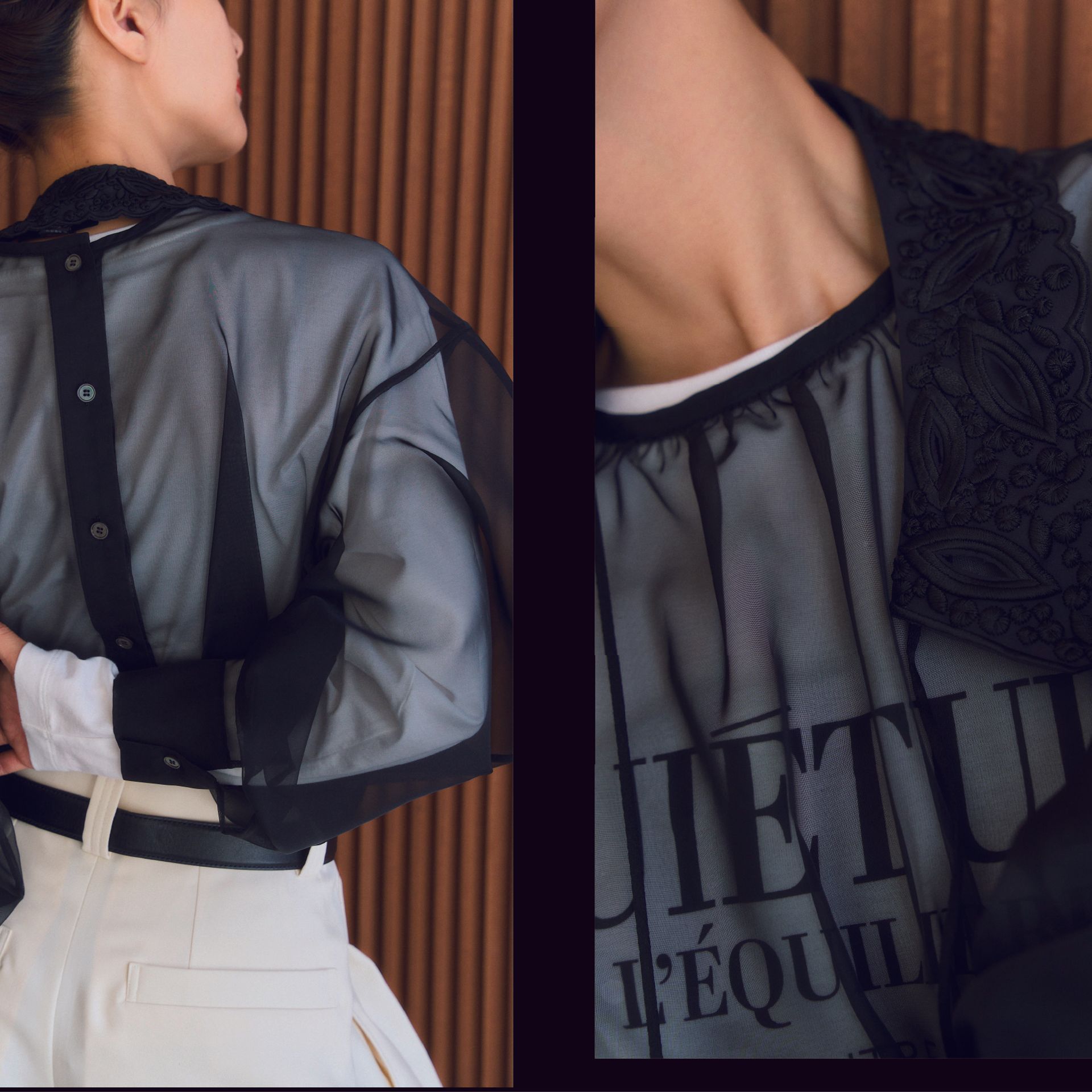 華やかさのあるシアートップスに、カジュアルなロゴロンTをレイヤード。