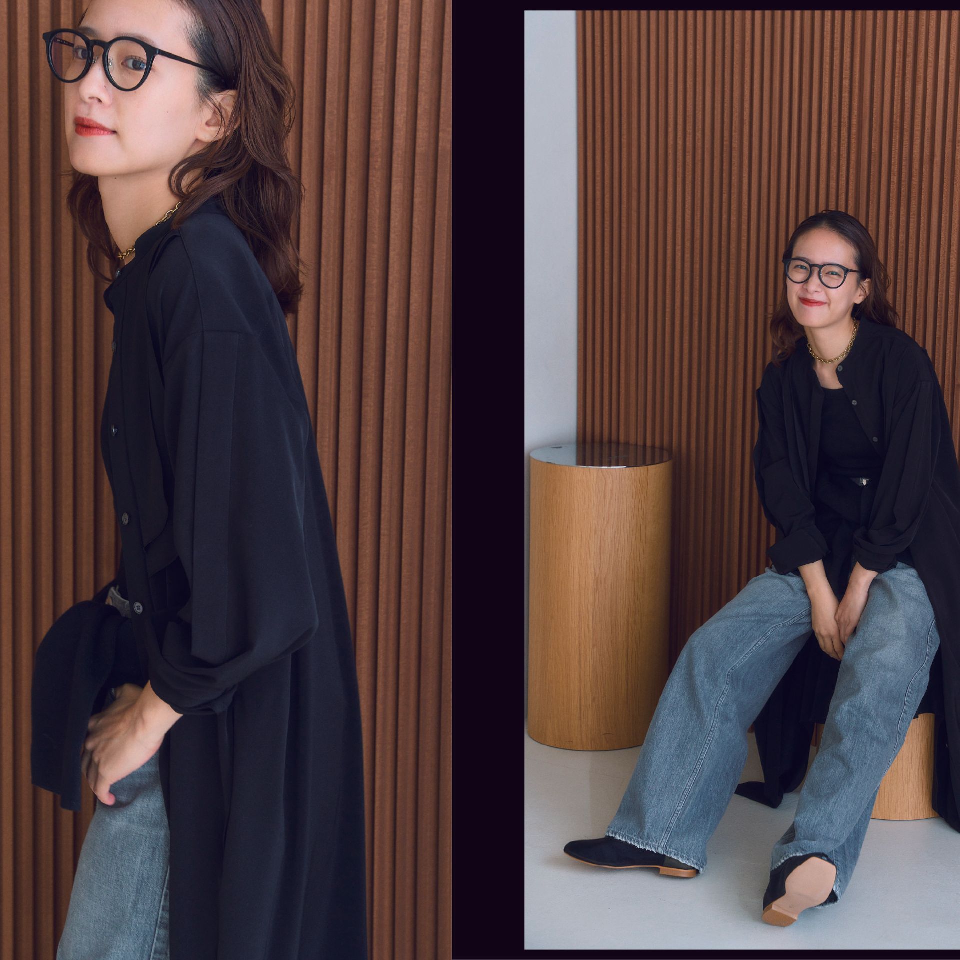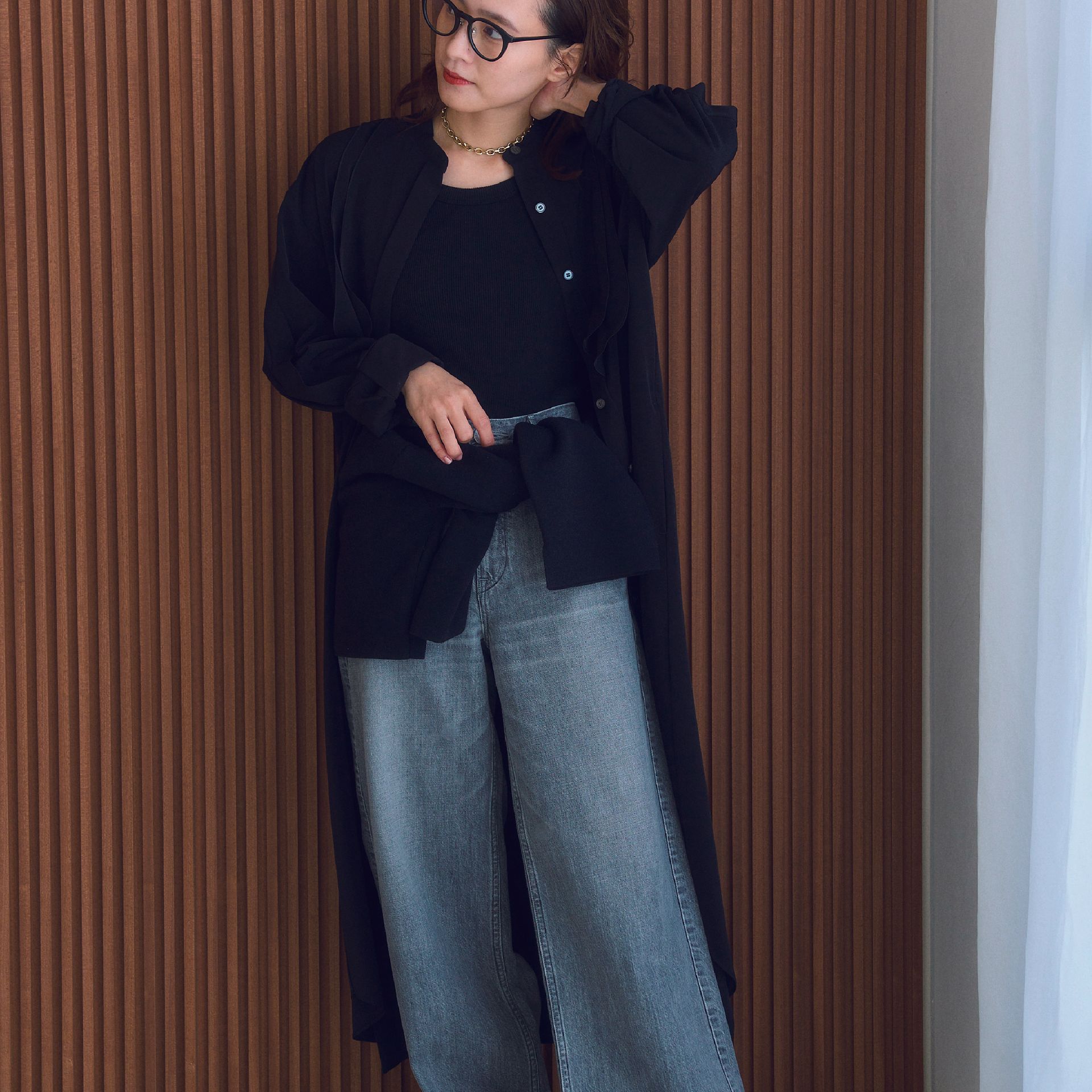 1枚で着るときれいめな印象のシャツワンピースを、カジュアルなデニムやブラックのタンクトップと合わせてスタイリングしました。
