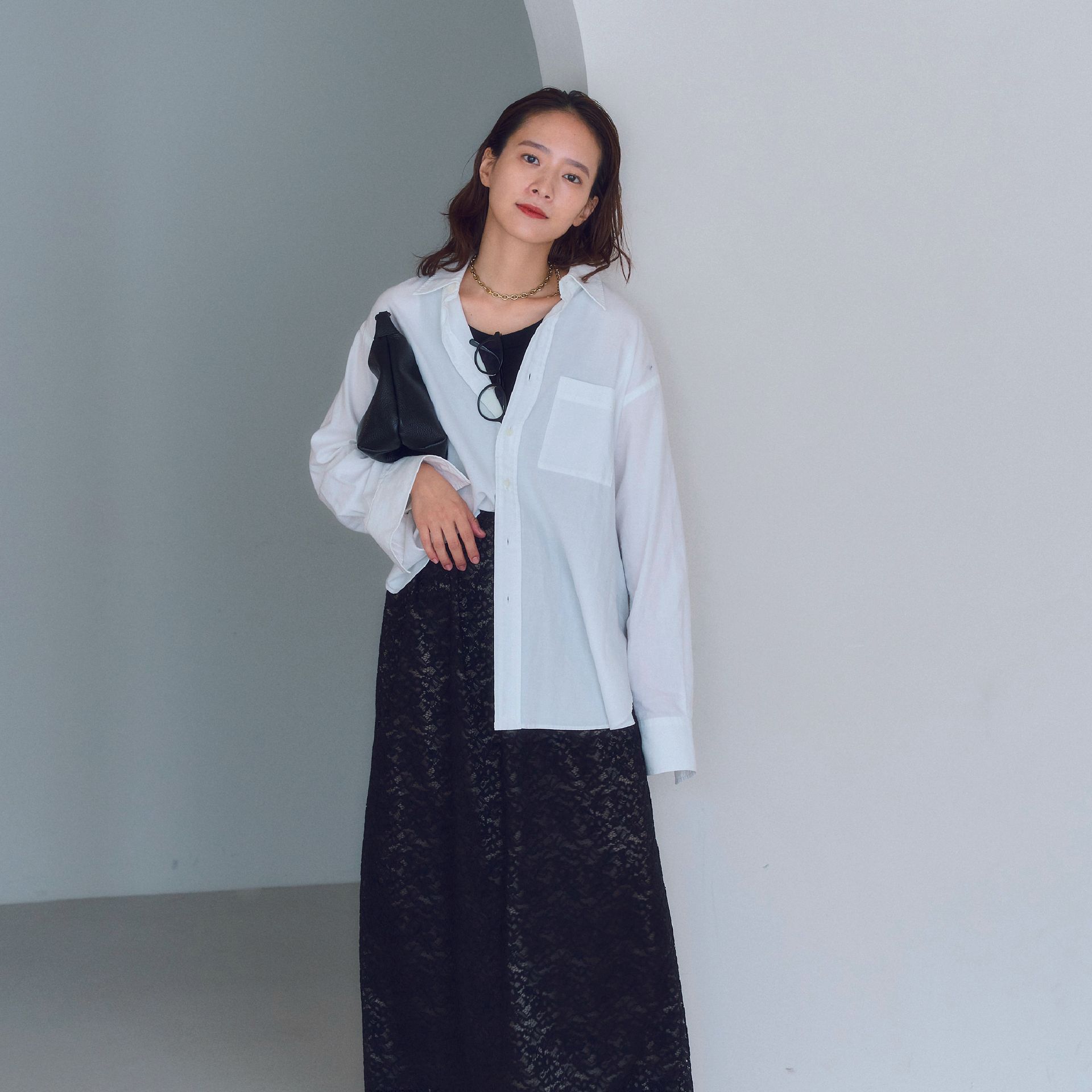ホワイトシャツにレーススカートを合わせて、程よくカジュアルで女性らしいスタイリングに。