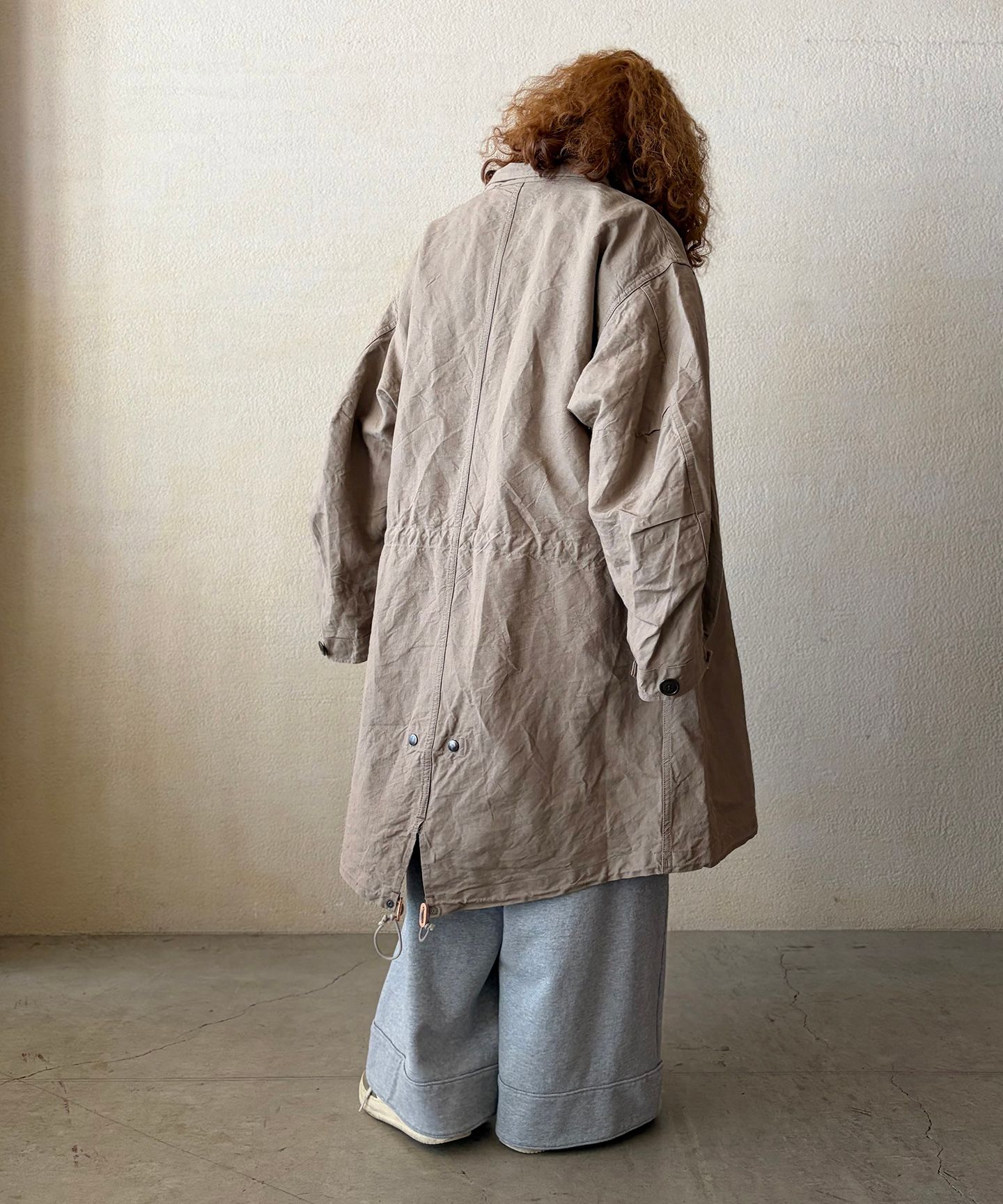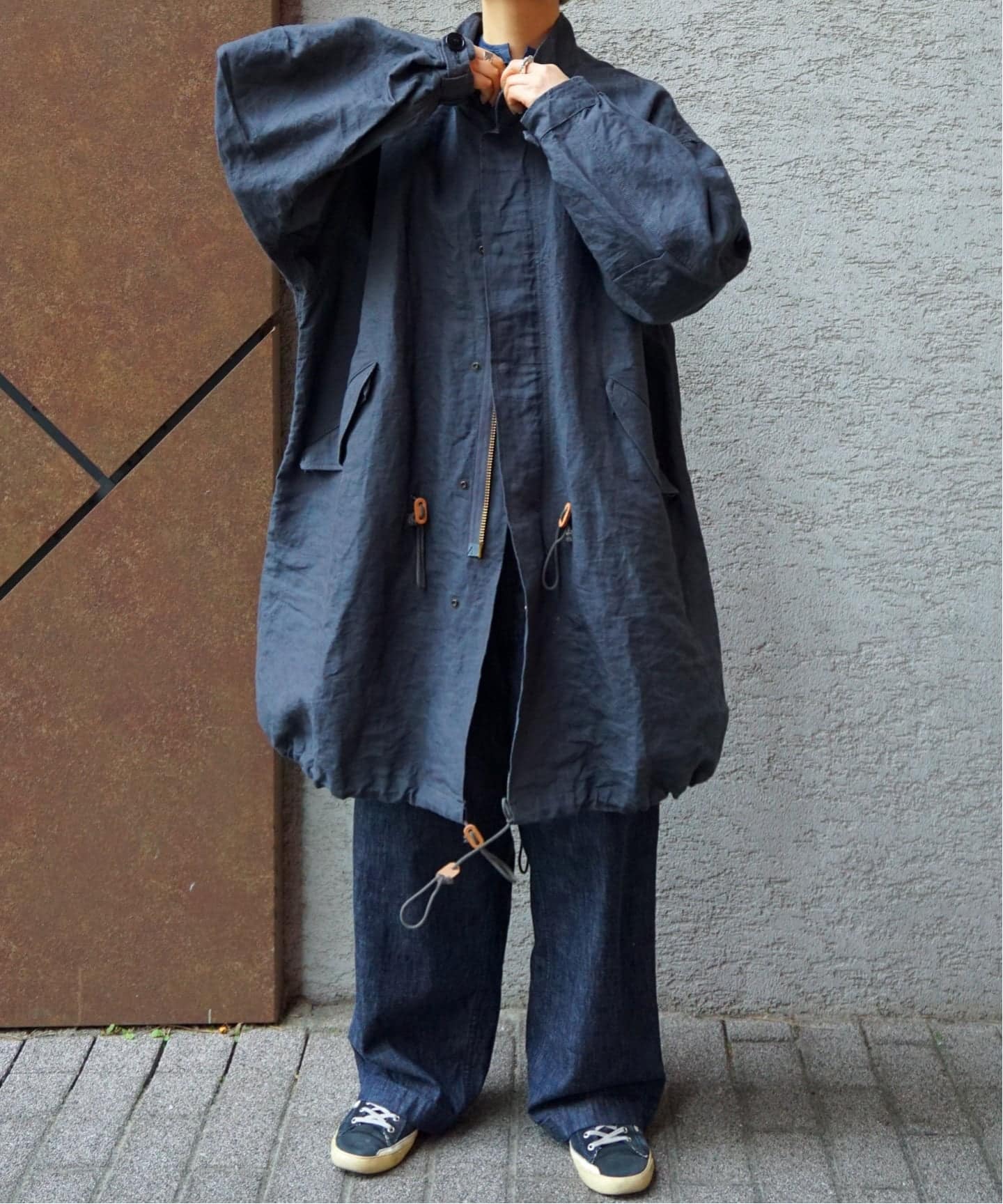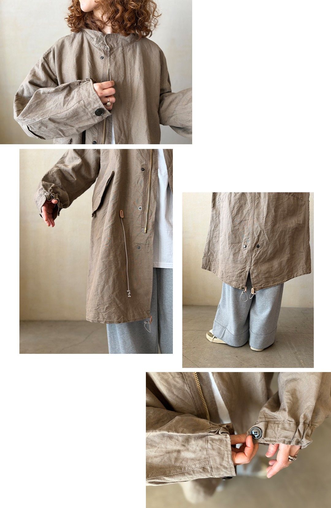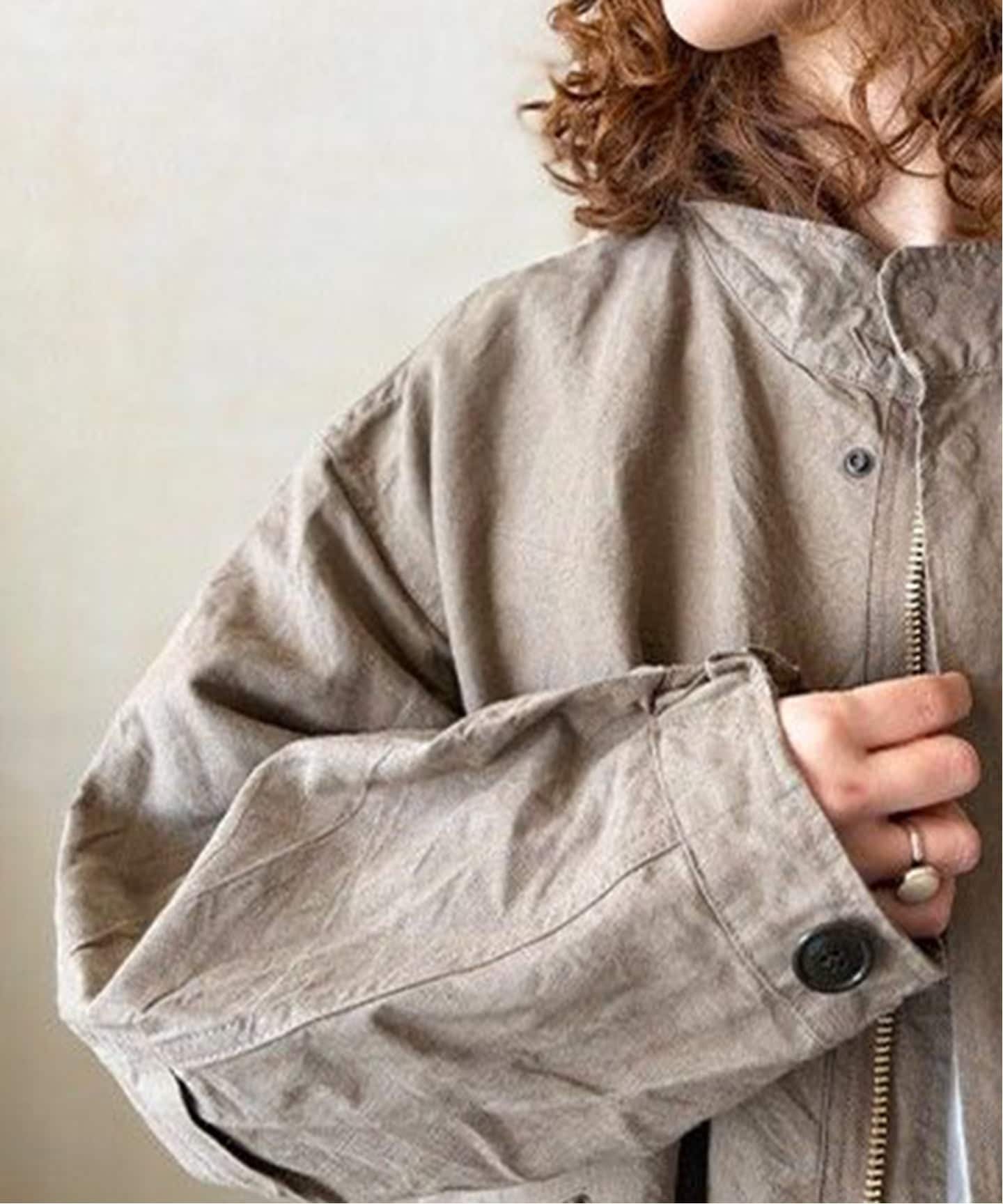 リネンの風合いと紙ならではの軽さが組み合わさり、コートに独特な雰囲気を演出しています。M-65モッズコートをデザインソースに作製しており、細部のディテールにもこだわっています。