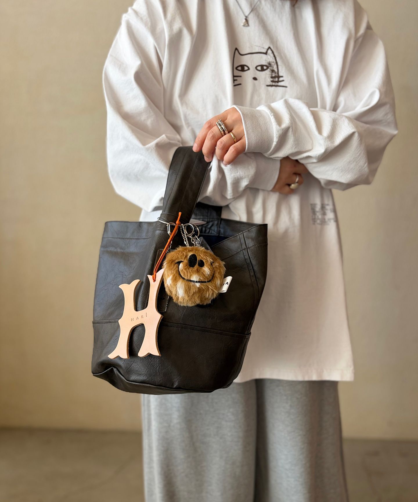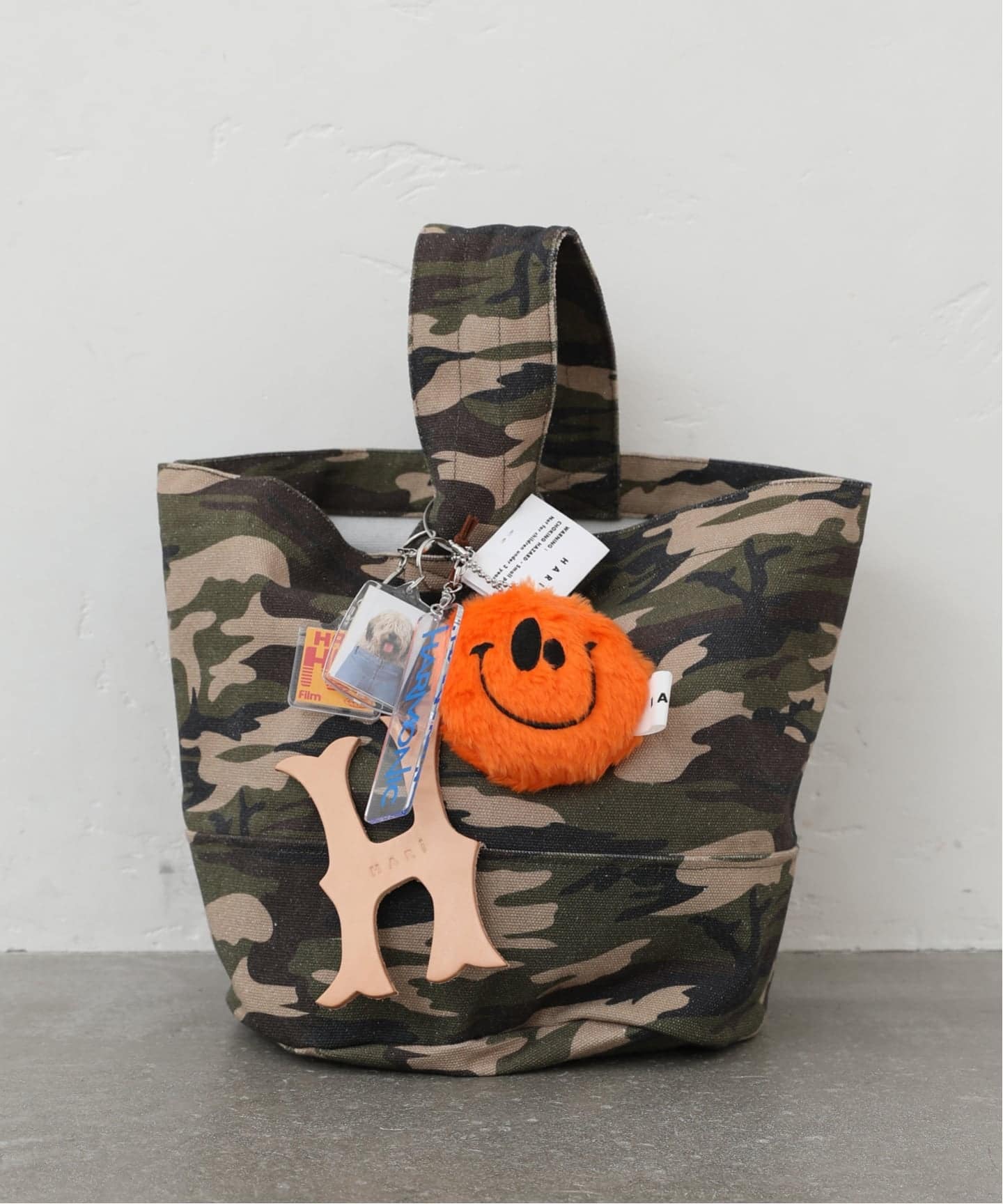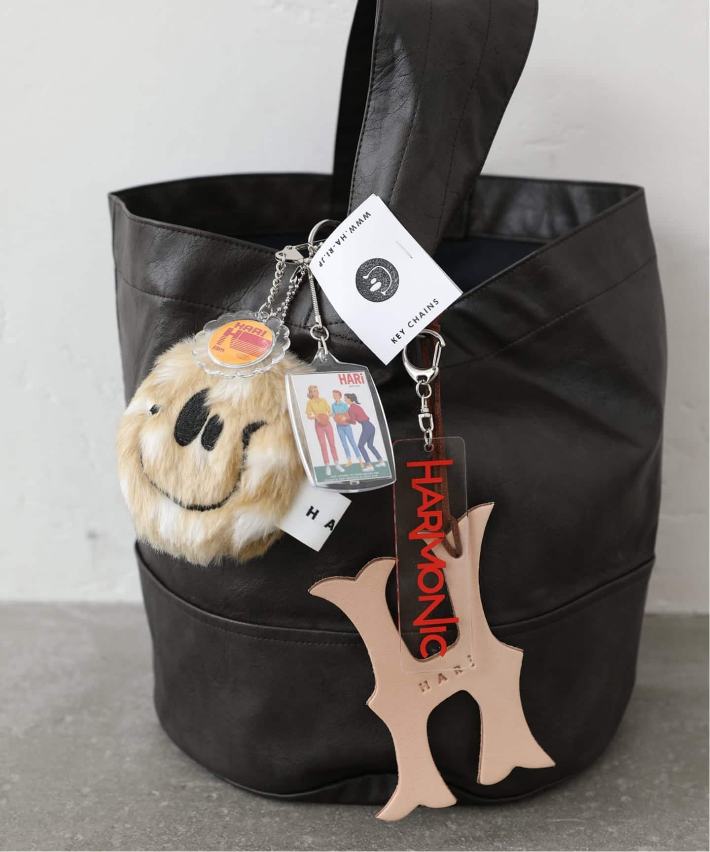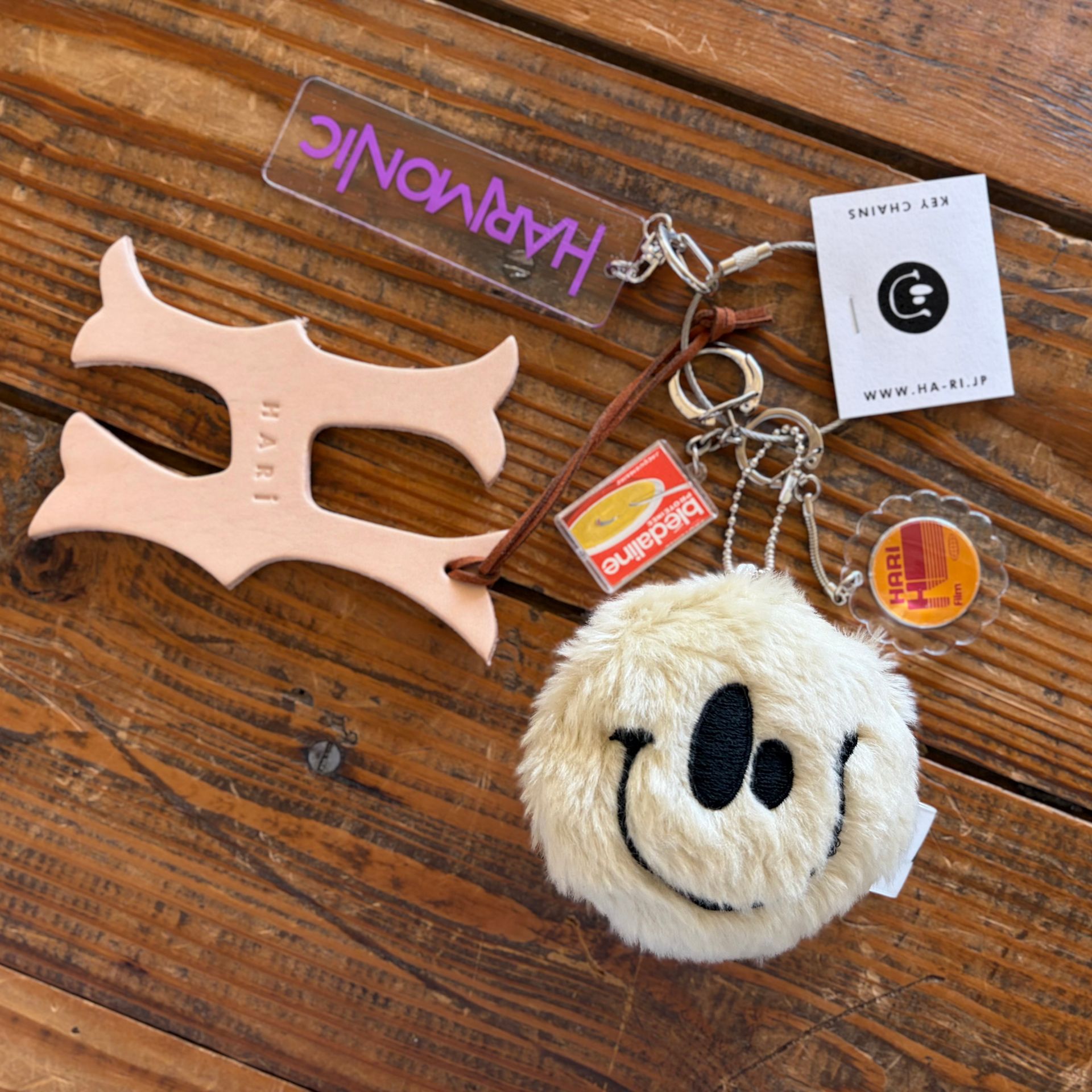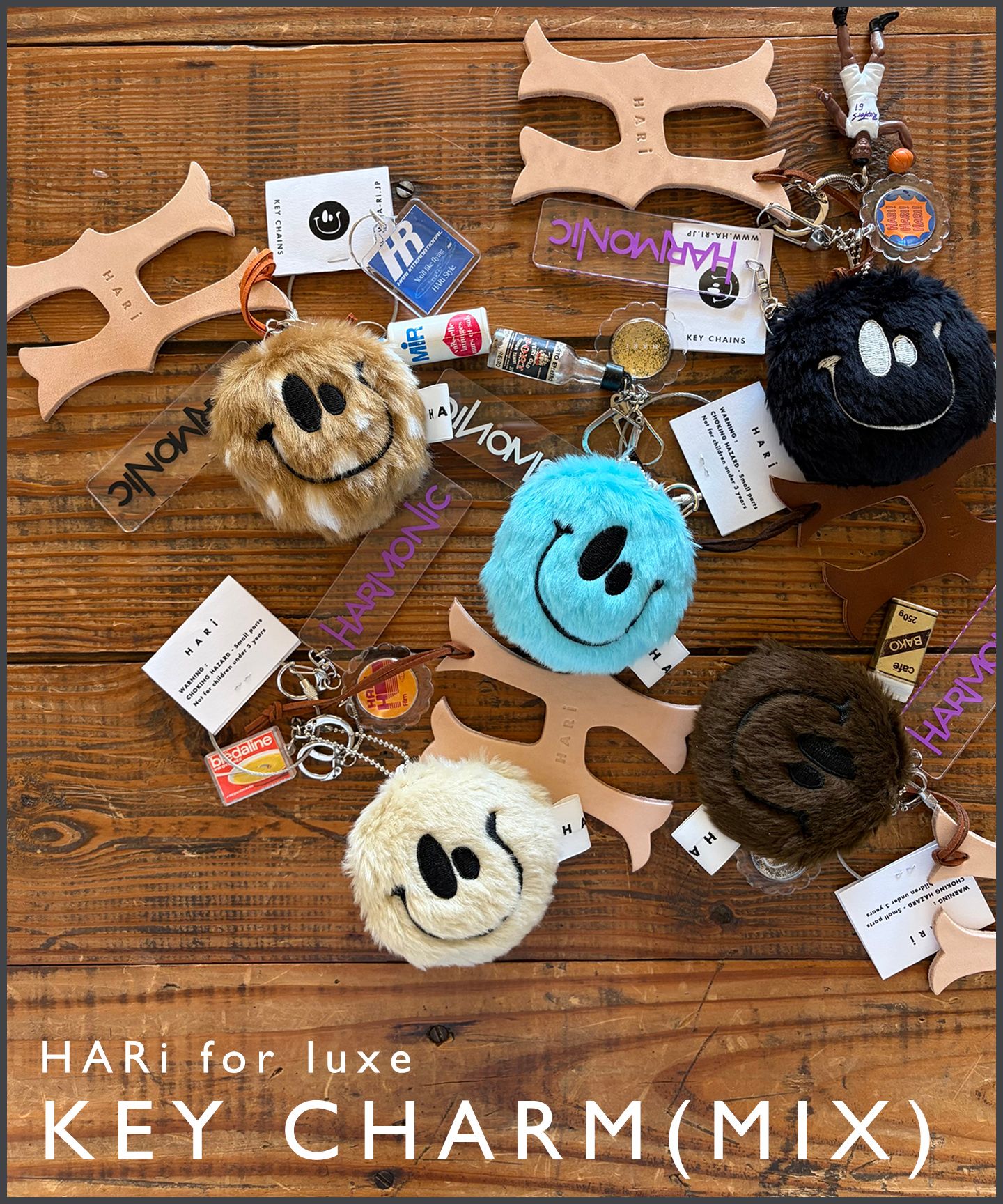 HARiのスマイルロゴのぬいぐるみをメインとしたキーチャームセット。スマイルロゴぬいぐるみキーホルダーに加えて、Hレザーキーホルダー、HARMONICキーホルダー、架空の企業キーホルダー、パリで買い付けたチャームが、それぞれアソートで付いています。(※luxe別注商品)
