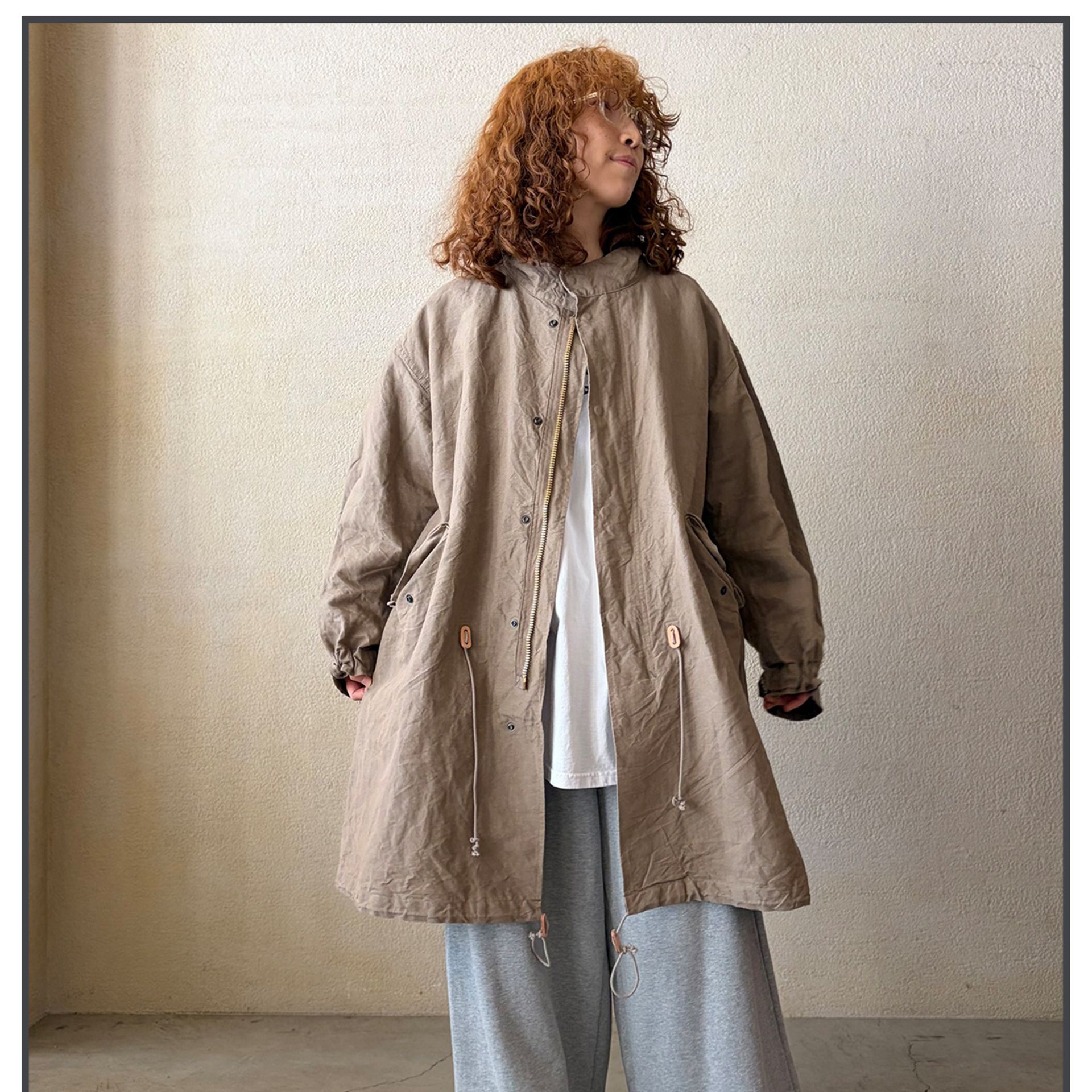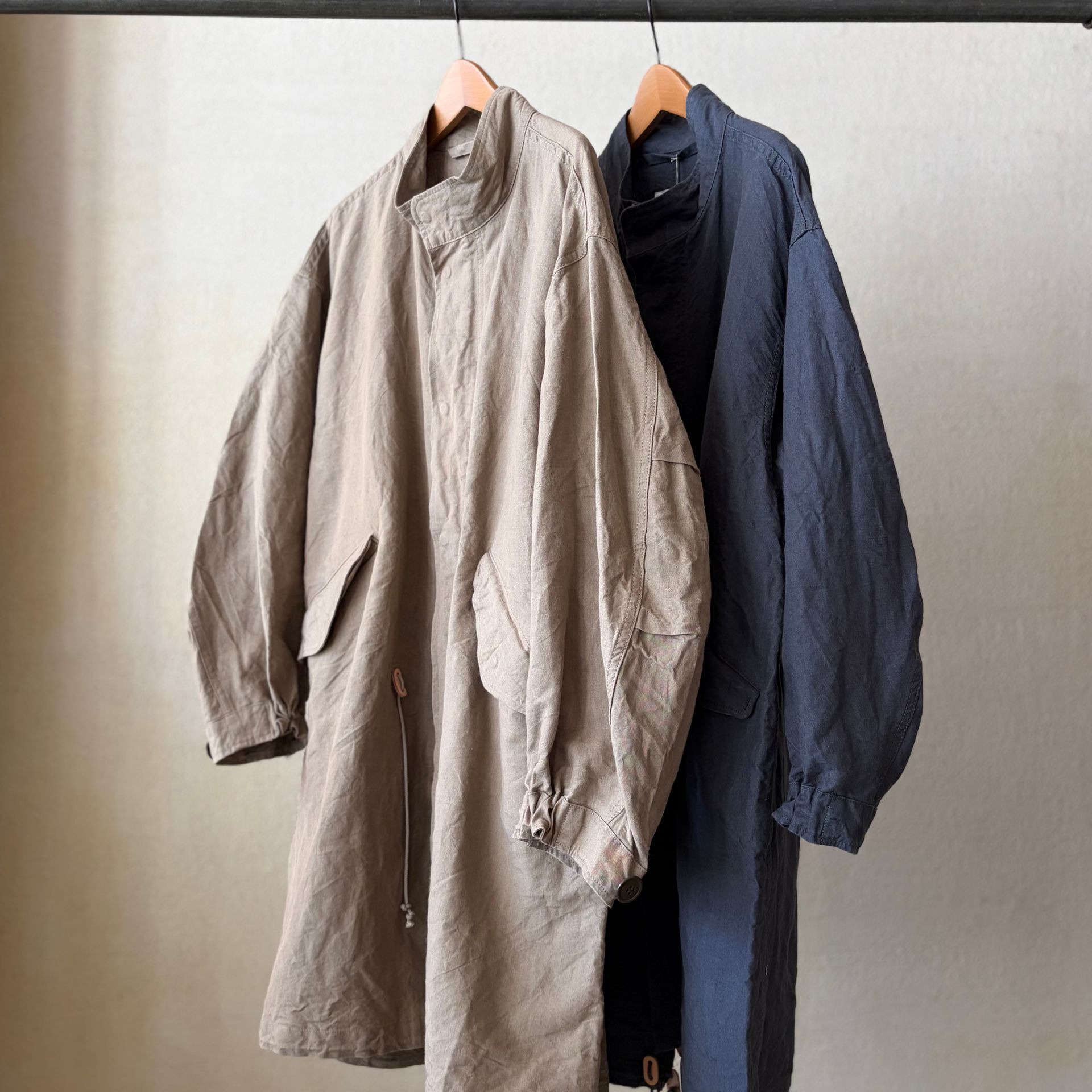 HARi定番のミリタリーコート。リネンと和紙を高密度に織り上げたウェザークロス素材を使用し、ヴィンテージ感のある表情が特徴です。(※ベージュはluxe別注カラー)